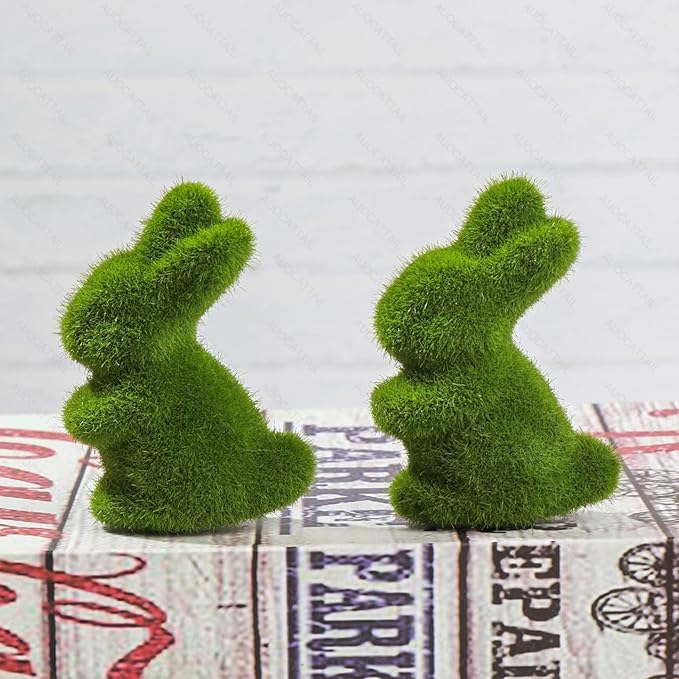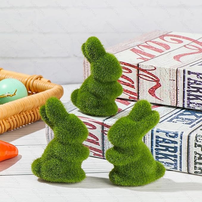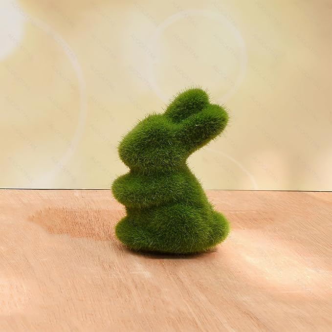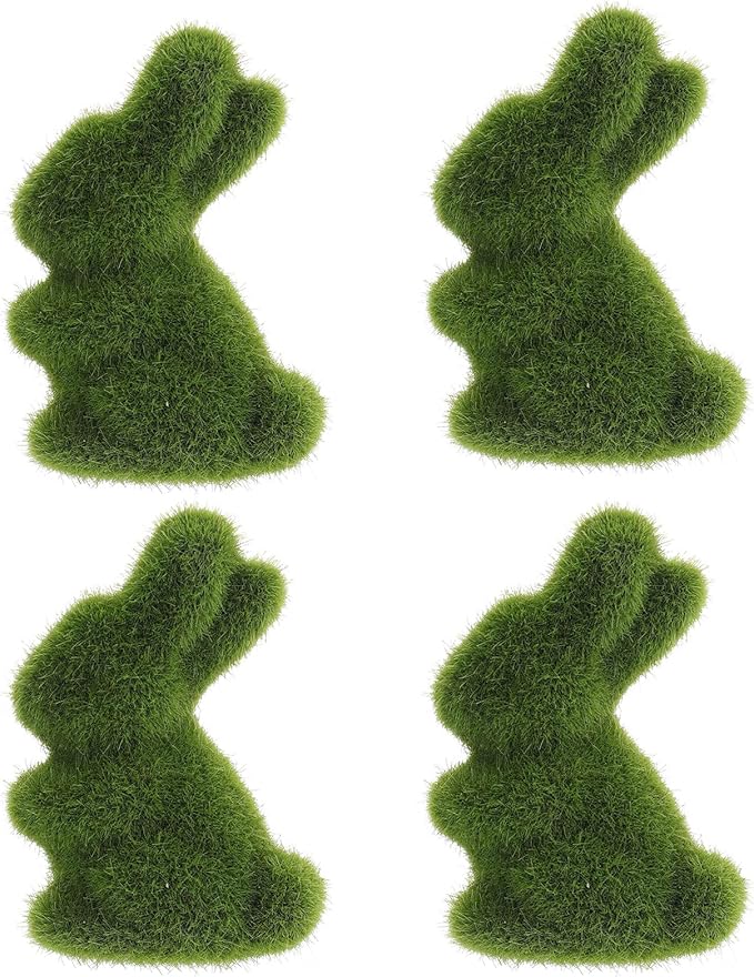 4 Pcs Easter Moss Bunny Figurine Furry Flocked Green Standing Rabbit Statue Decorations for Easter Gift Home Office Table Ornament