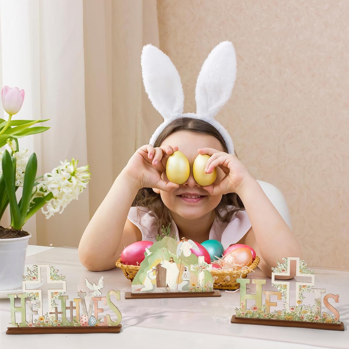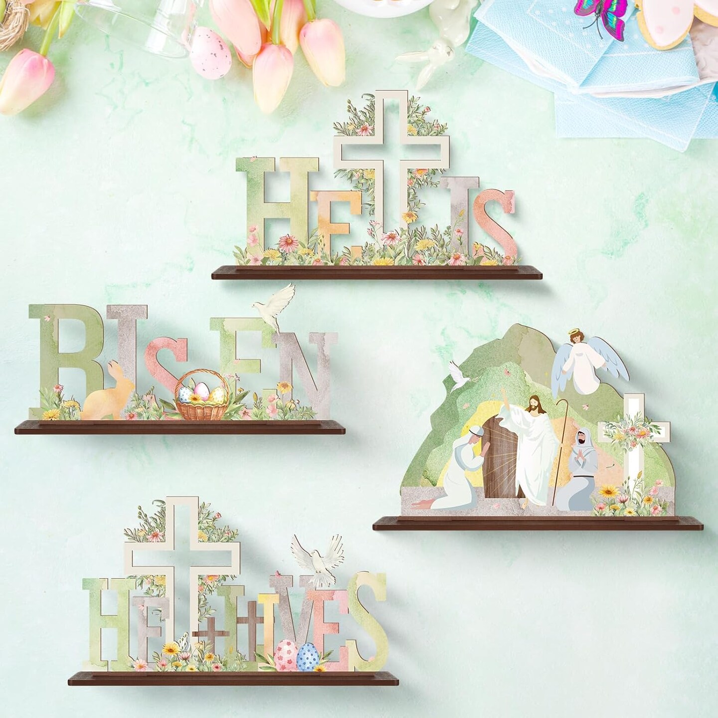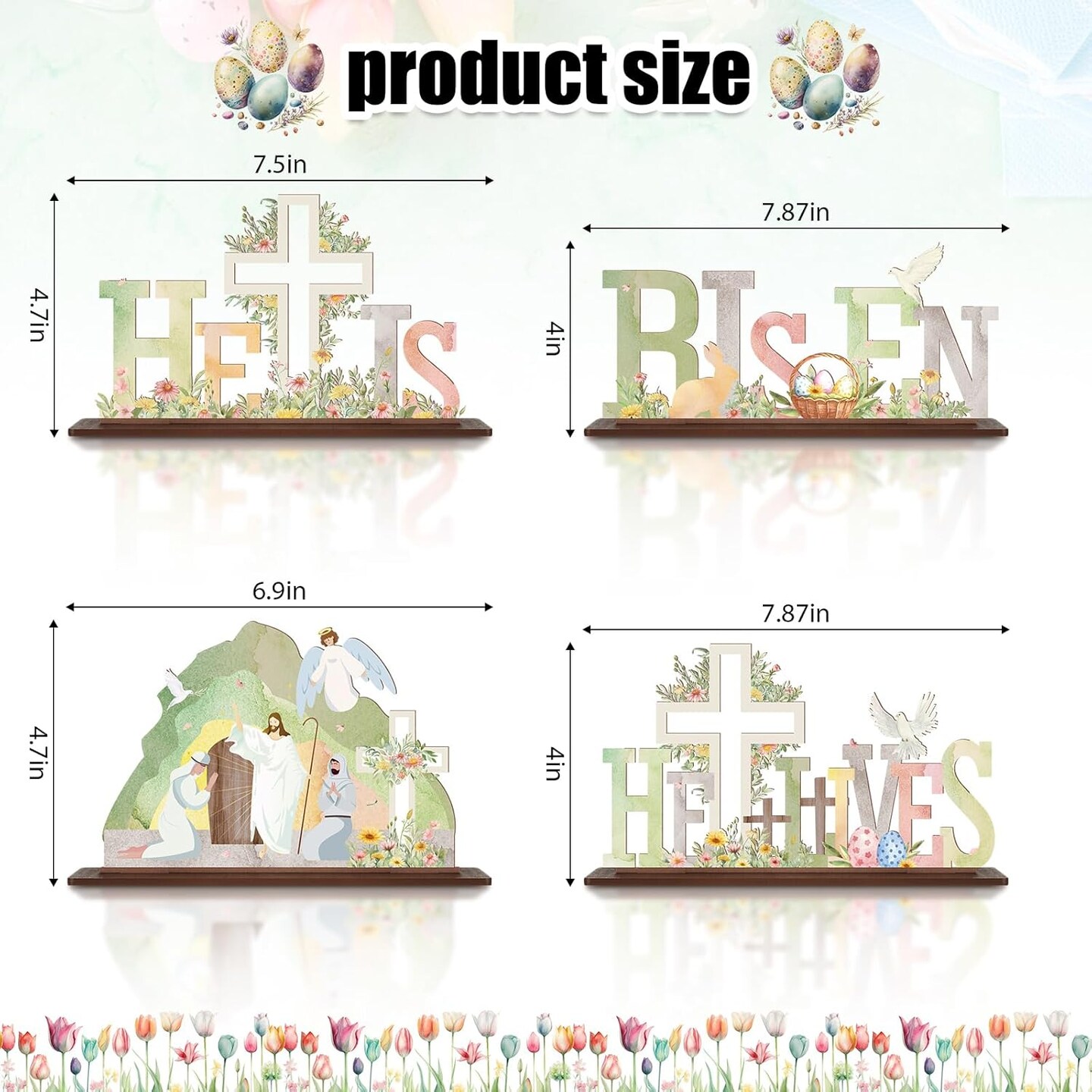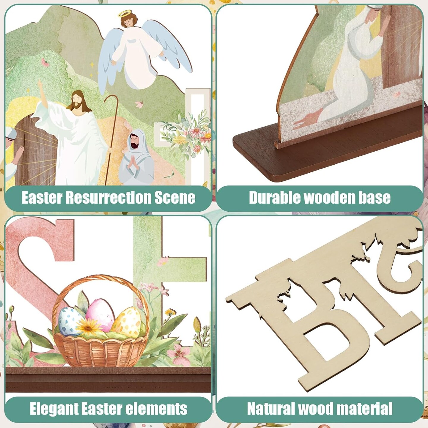 4 Pcs Easter Table Decoration He is Risen Tabletop Decor Easter Resurrection Scene Wooden Sign Flower Jesus Cross Sign Spring He Lives Table Centerpiece for Easter Religious Decor