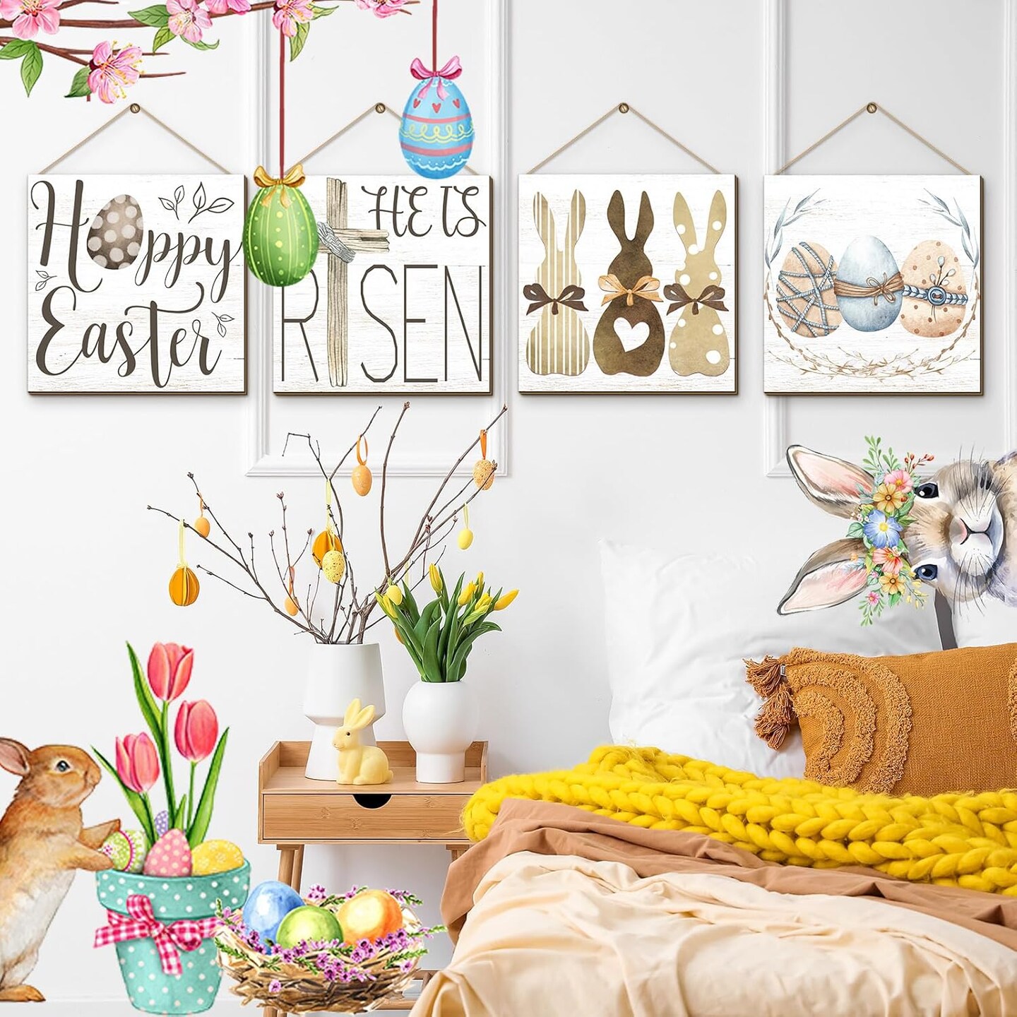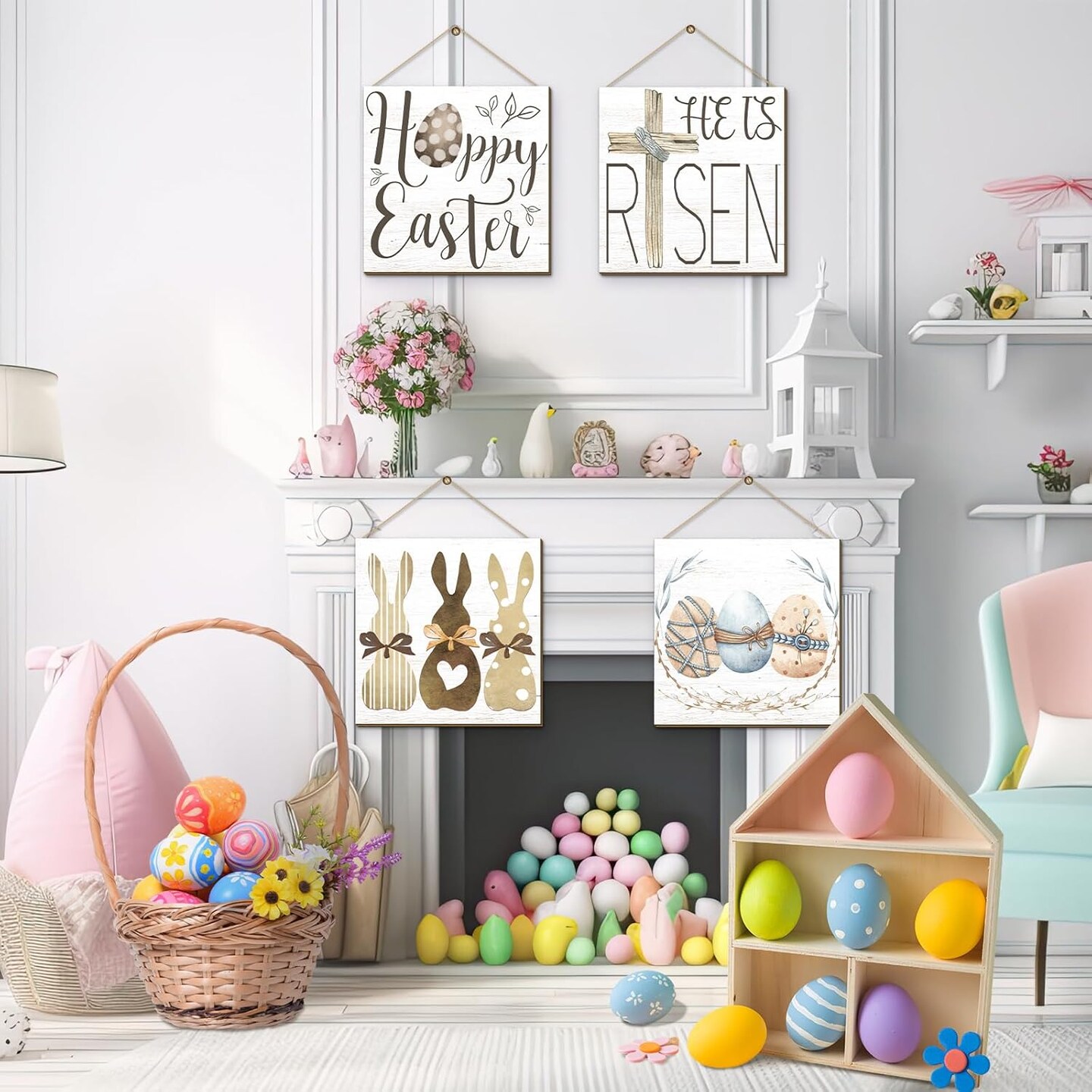 4 Pcs Easter Wall Decor He Is Risen Door Sign Bunny Egg Wood Wall Hanging Plaque Rustic Easter Welcome Door Sign Farmhouse Easter Wall Pediments Decorations for Easter Home Front Door Decor