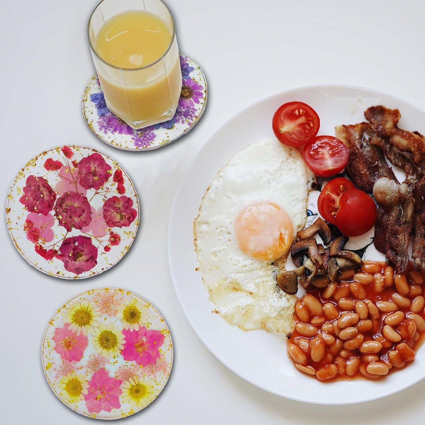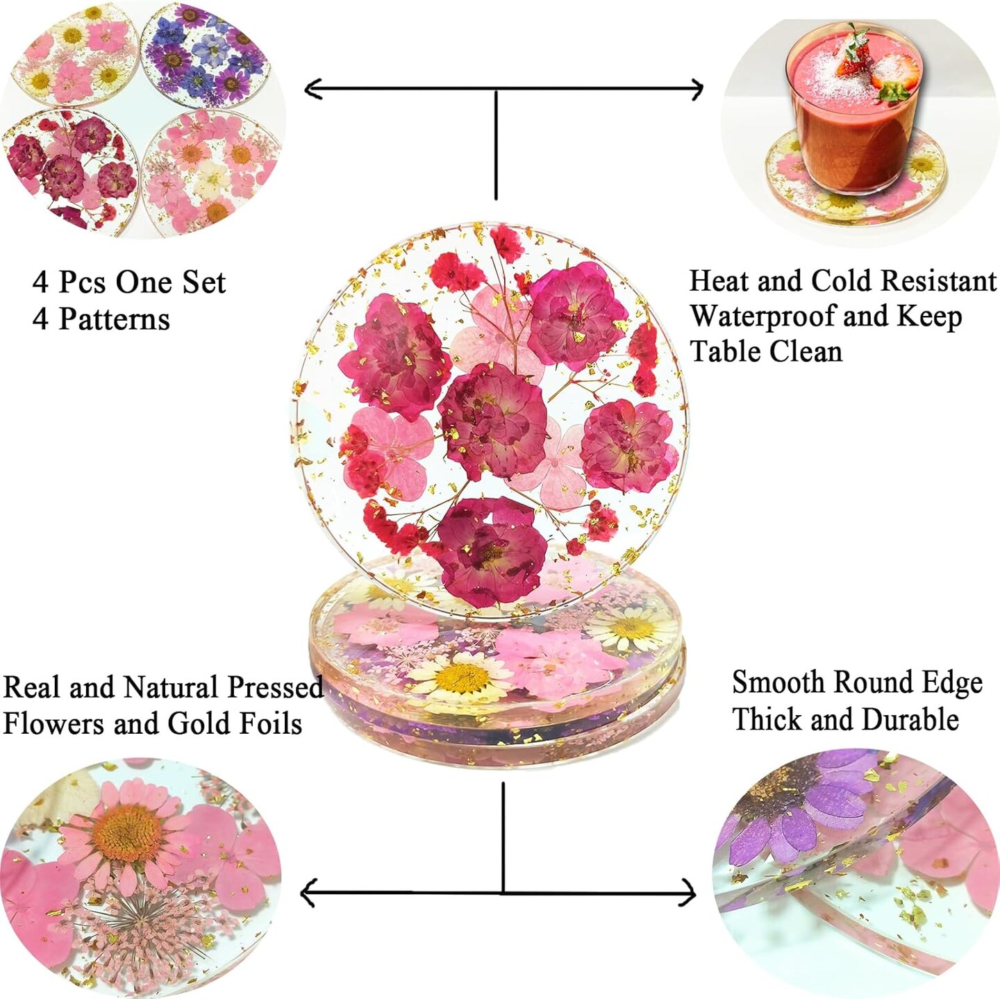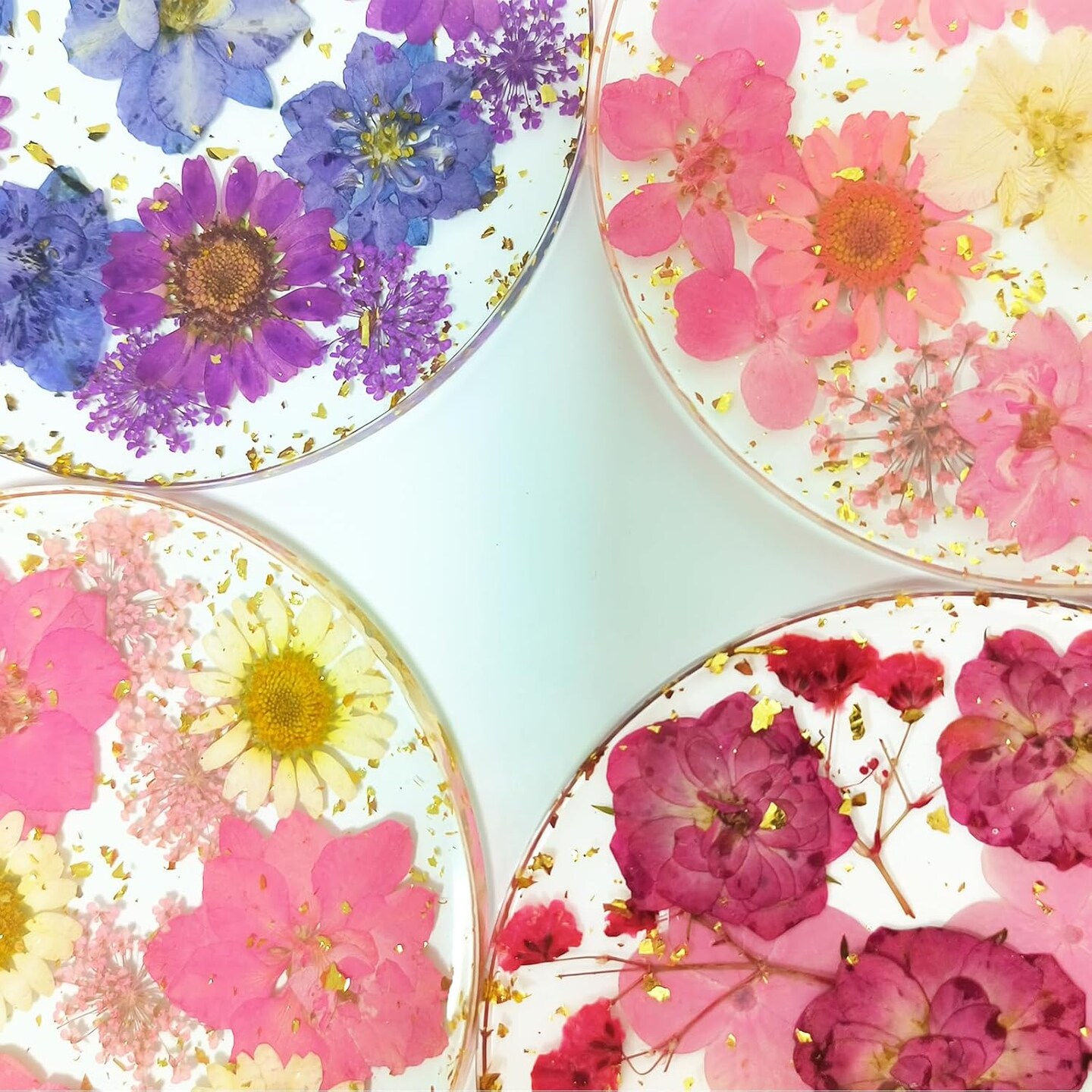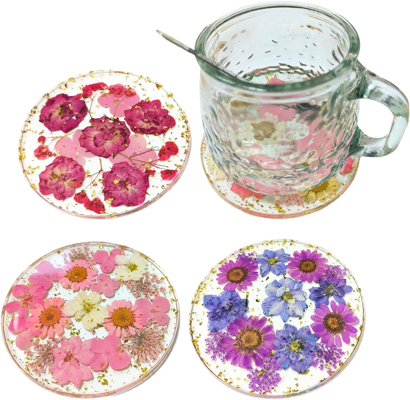 4 Pcs Flower Coasters for Drink Handmade Resin Coasters with Pressed Flowers, Round Cute Coasters for Desk Aesthetic Cup Mat Set Natural Floral Coasters Home Decor