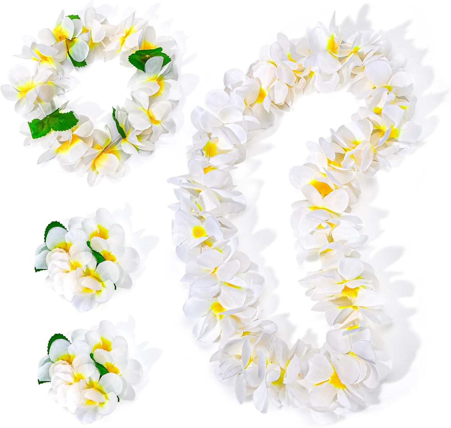 4 PCS Hawaiian Lei Set, White Luau Wreath Garland Hawaii Leis Flower Headpiece Necklace Bracelet