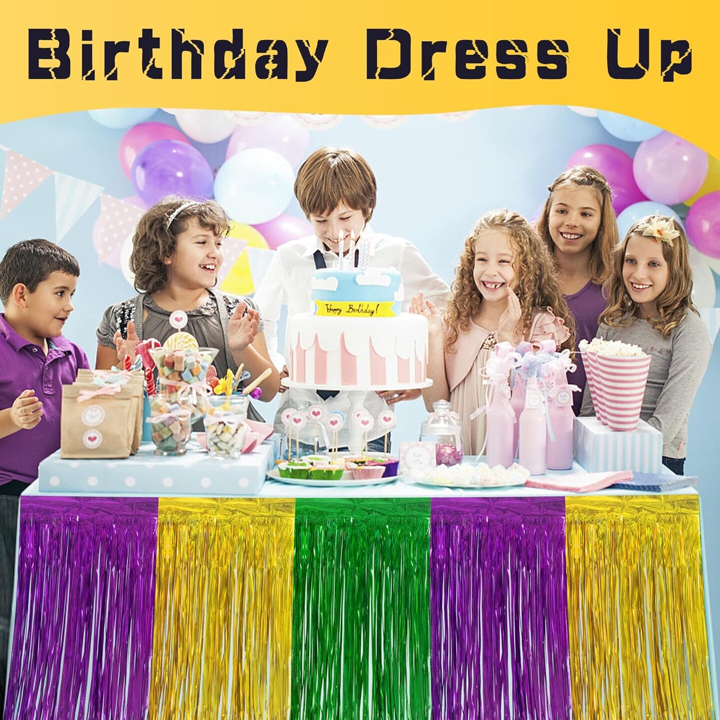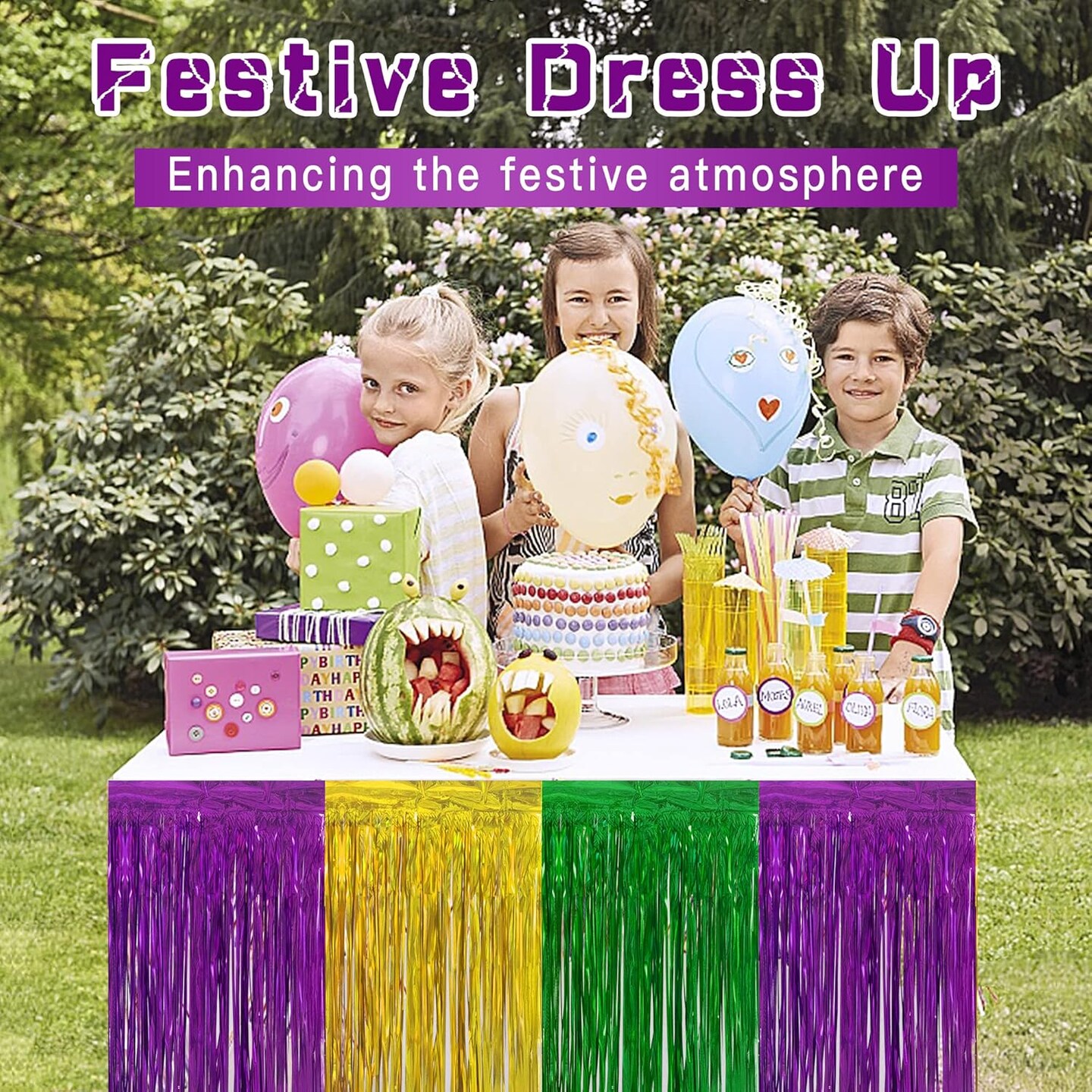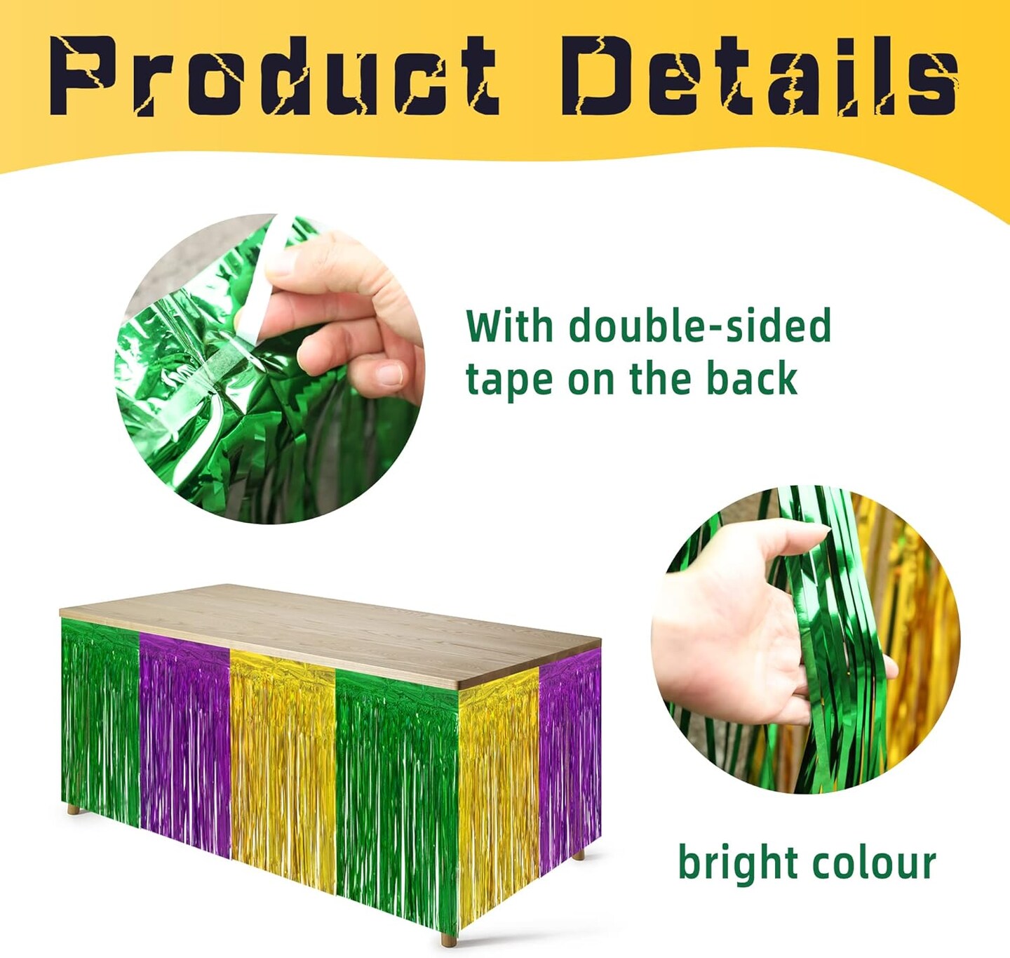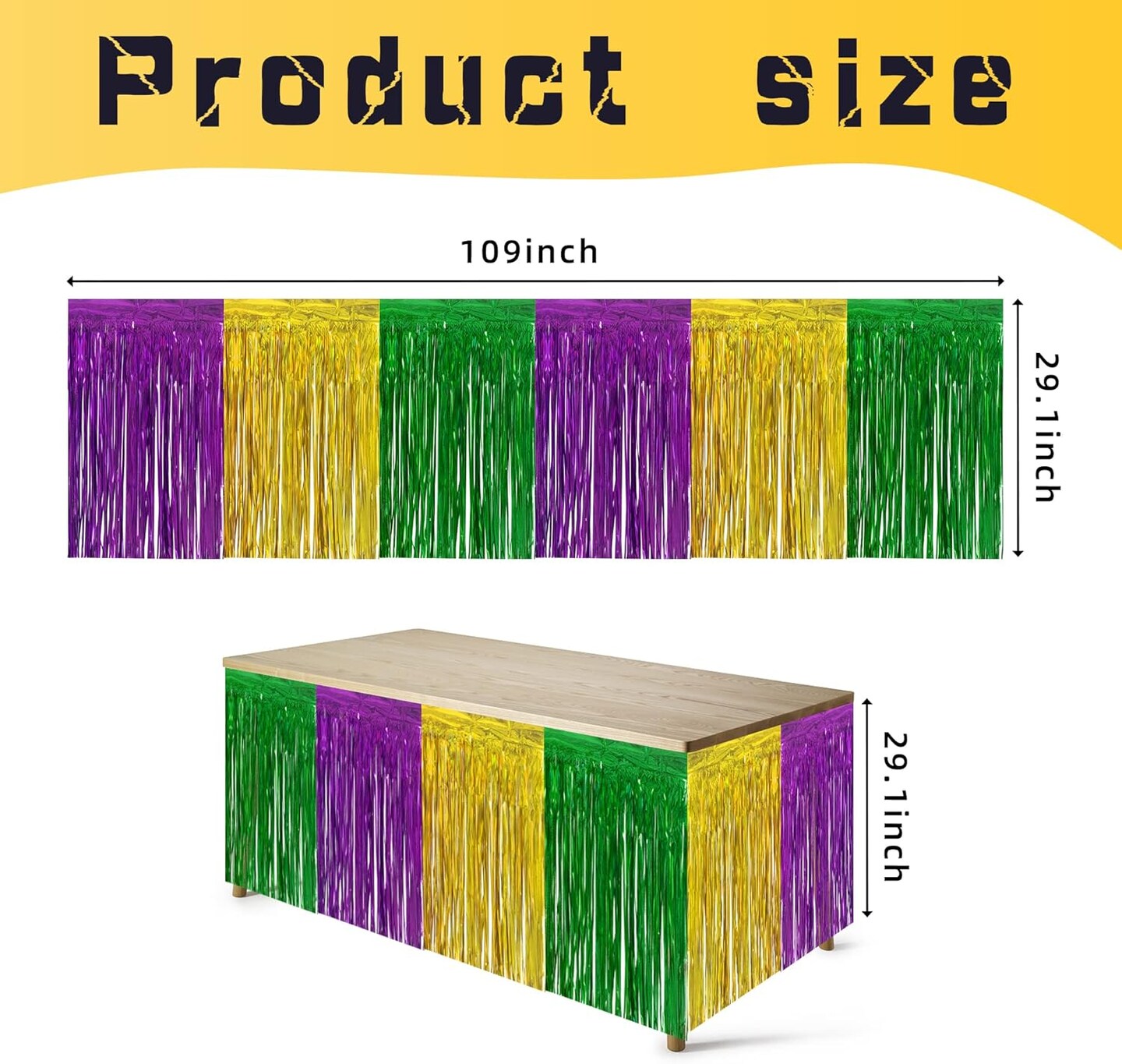 4 PCS Mardi Gras Party Table Skirt-29 x 109 Inch Mardi Gras Metallic Fringe Table Skirts-Purple Gold Green Tinsel Foil Fringe Decoration for Mardi Gras Holiday New Orleans Masquerade Party