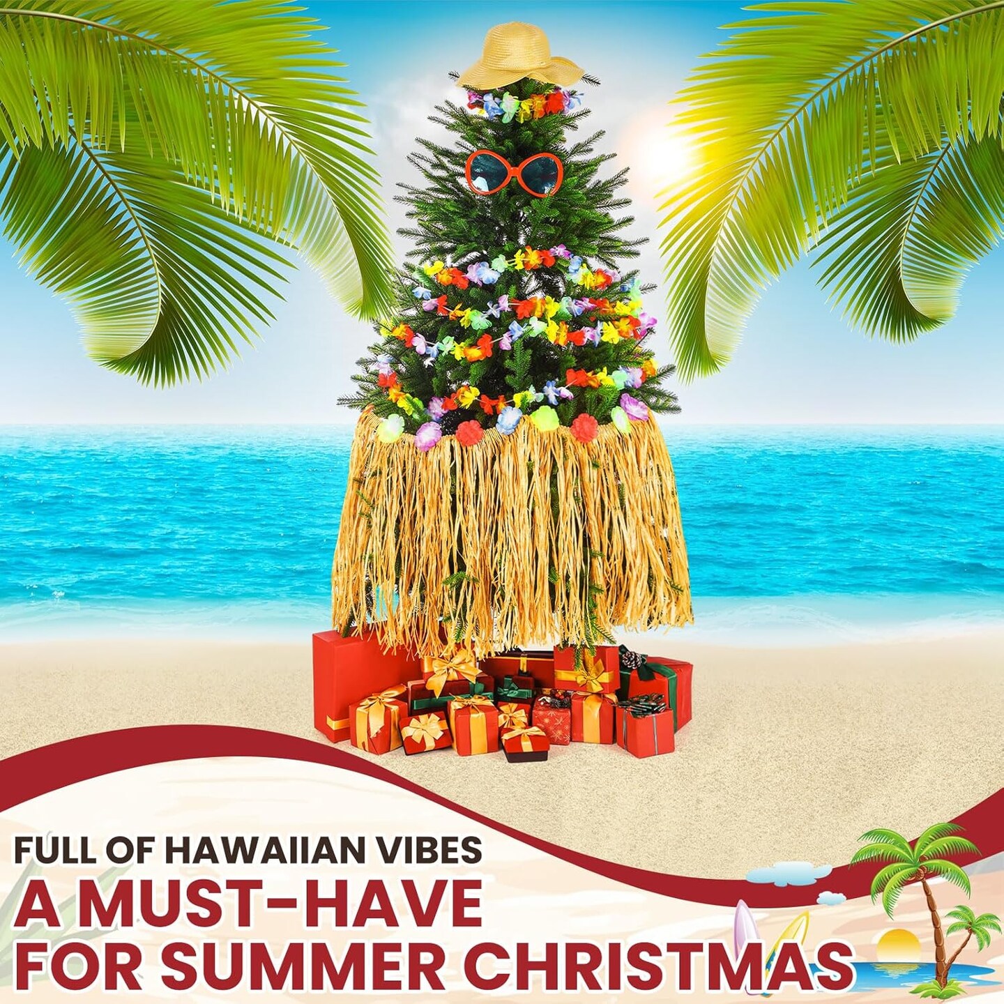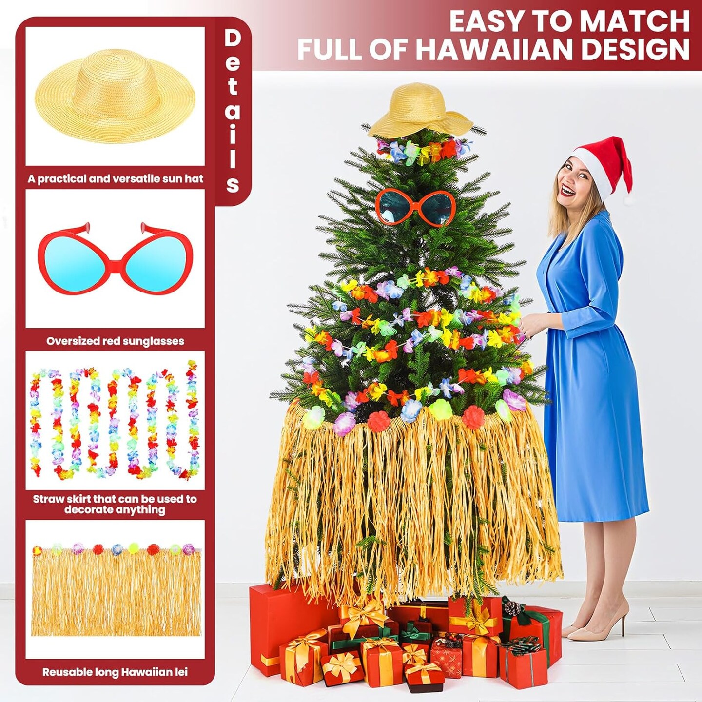 4 Pcs Summer Hawaiian Tree Decoration with Tassel Grass Skirt Oversized Sunglass Beach Hat Floral Garland Tropical Beach Party Decor for Hawaiian Party Supplies