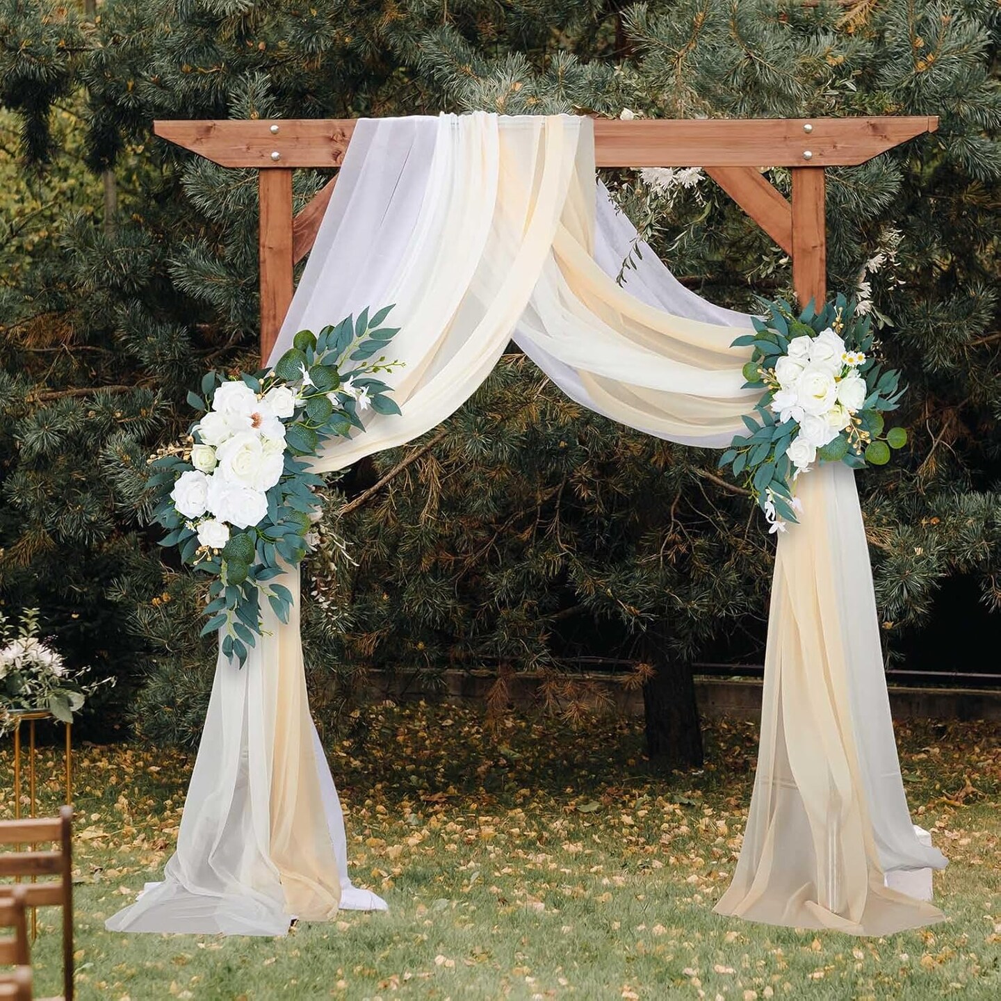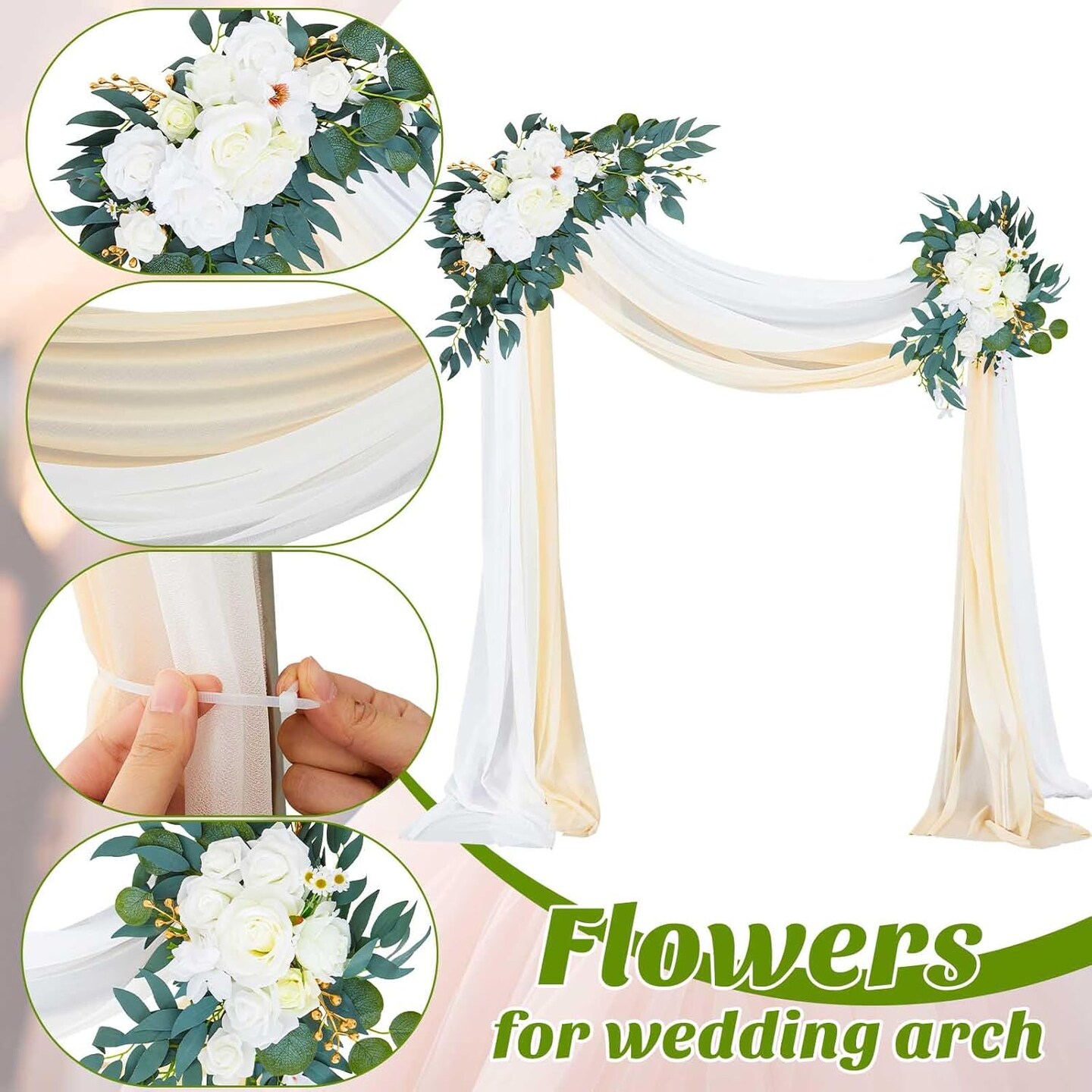 4 Pcs Wedding Arch Flowers and Drape Kit Include 2 Artificial Floral Swag and 2 White Chiffon Drapes