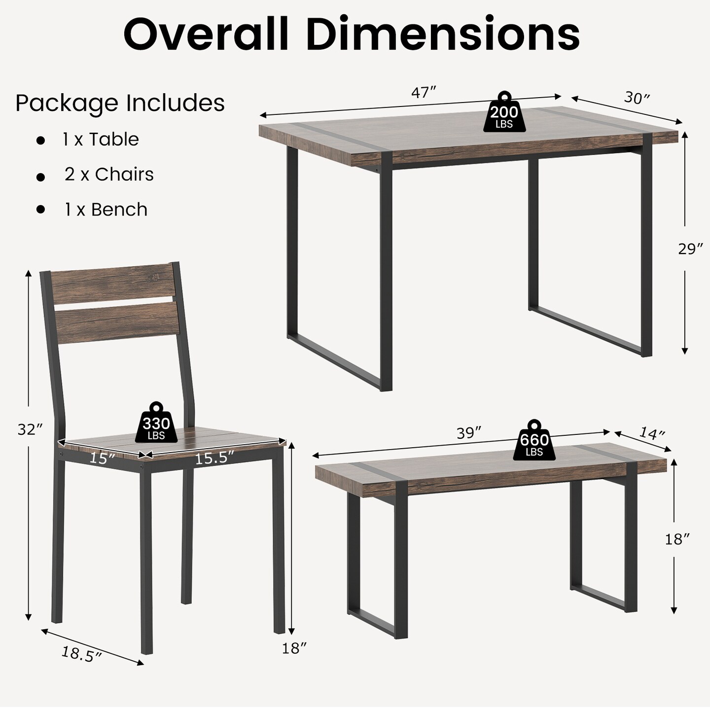 4 Piece Grey Black MDF Metal Dining Table Set with Bench and Chairs Space Saving