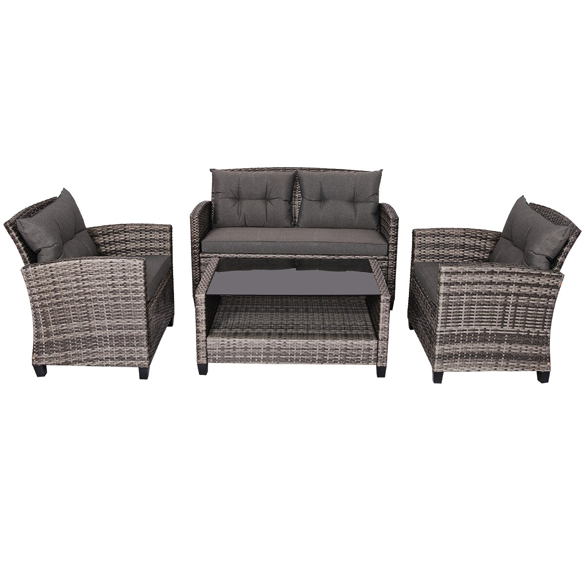 4 Piece Grey Rattan Patio Sofa Set with Steel Frame and Glass Table