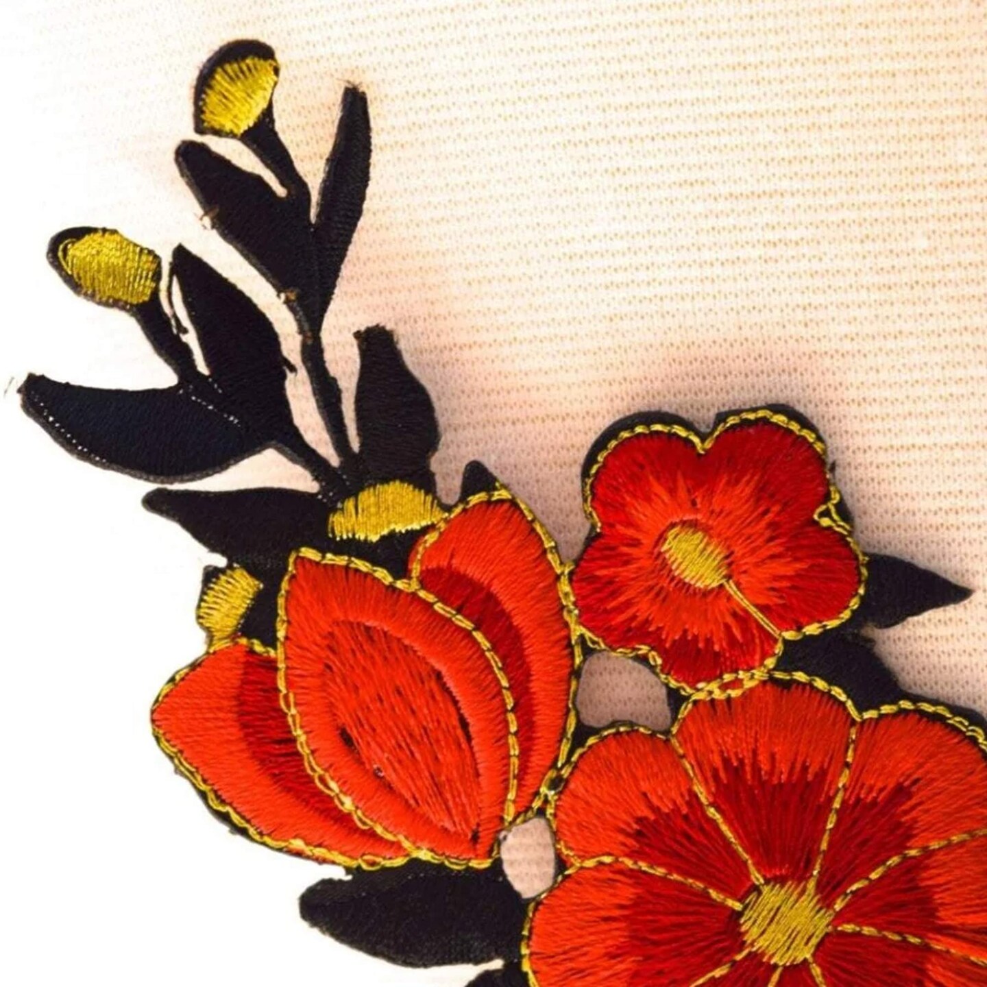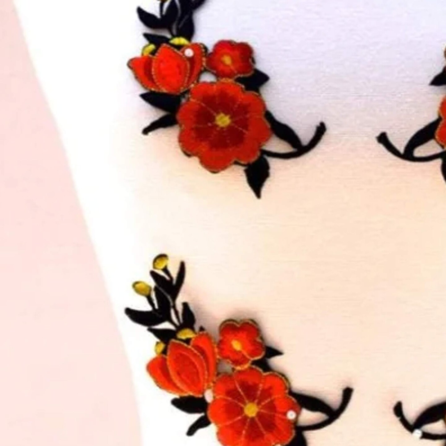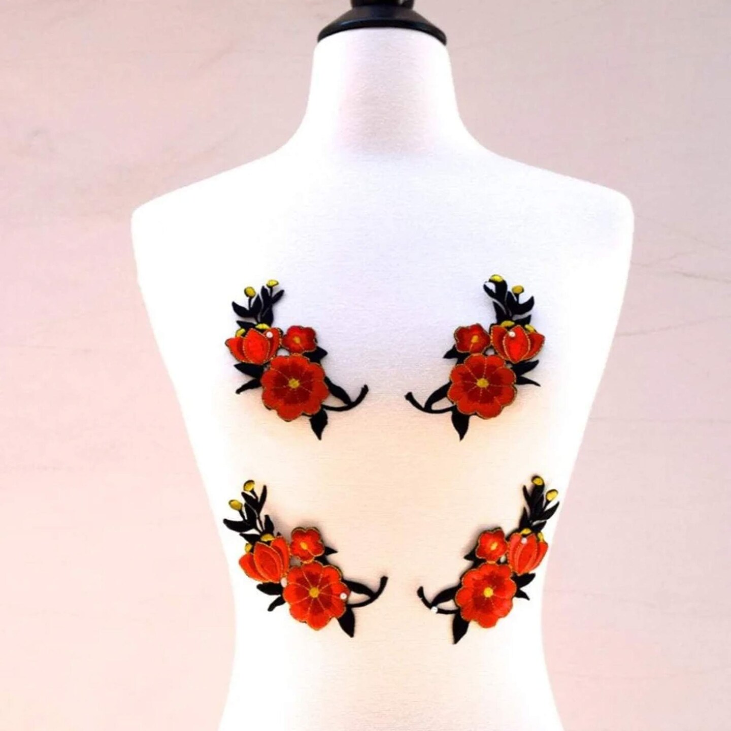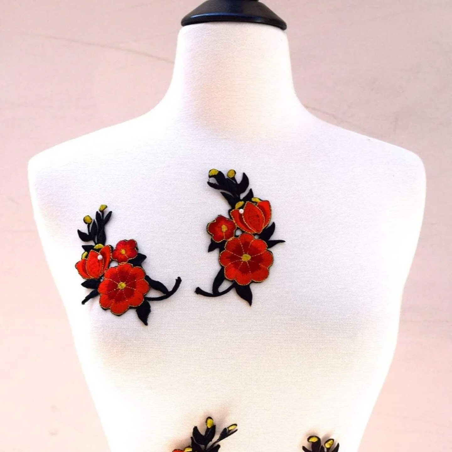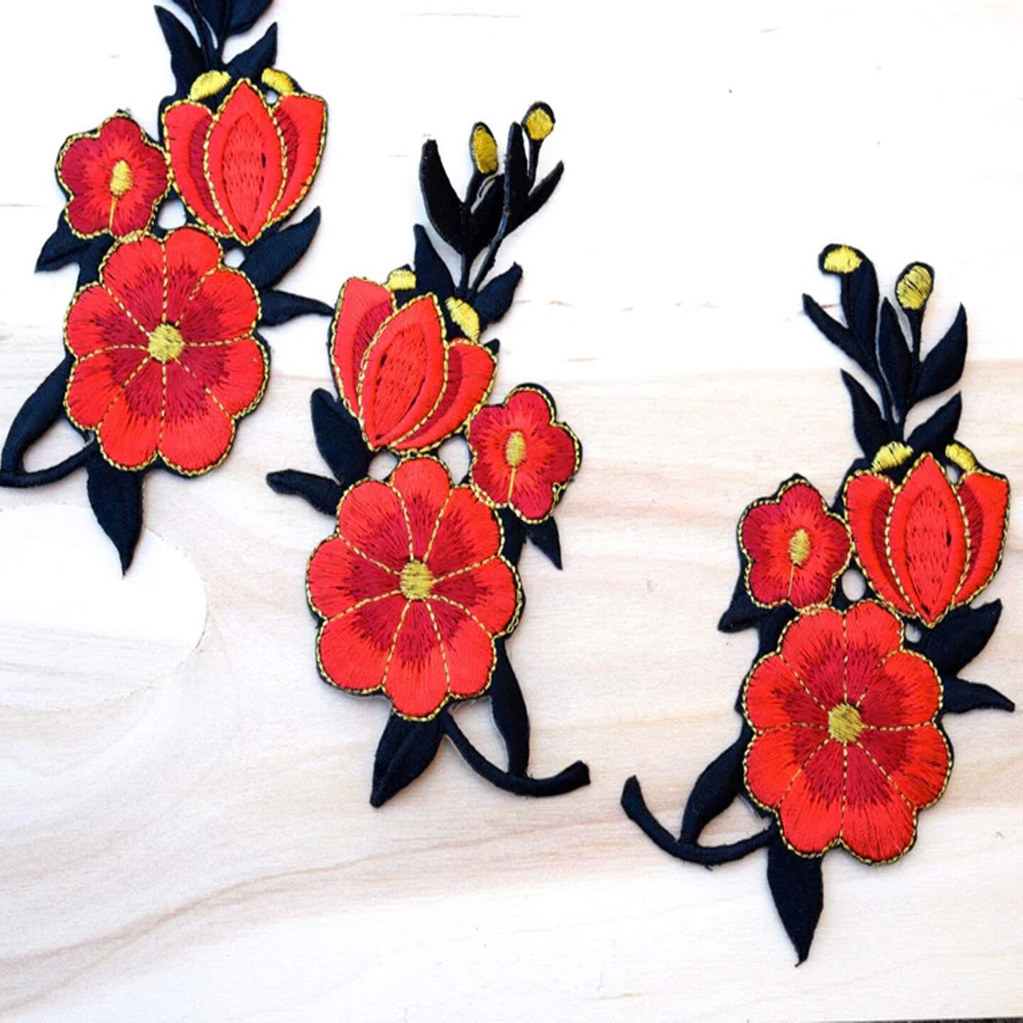 4 Pieces Black Red Embroidered Flower Iron-On Applique for DIY, Neckline or Hair Accessories