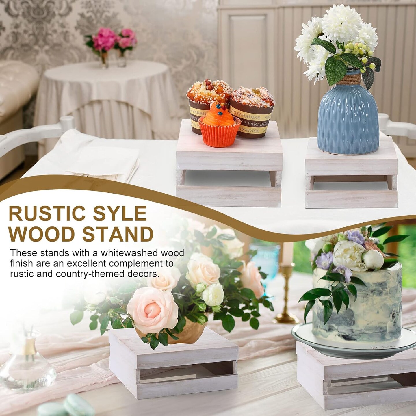 4 Pieces Wood Cupcake Display Stand Whitewashed Decorative Dessert Appetizer Cake Stand Risers Wooden Crate Rustic Cake Stand Wood Risers for Decor Wooden Crate Style Storage Organizer for Party