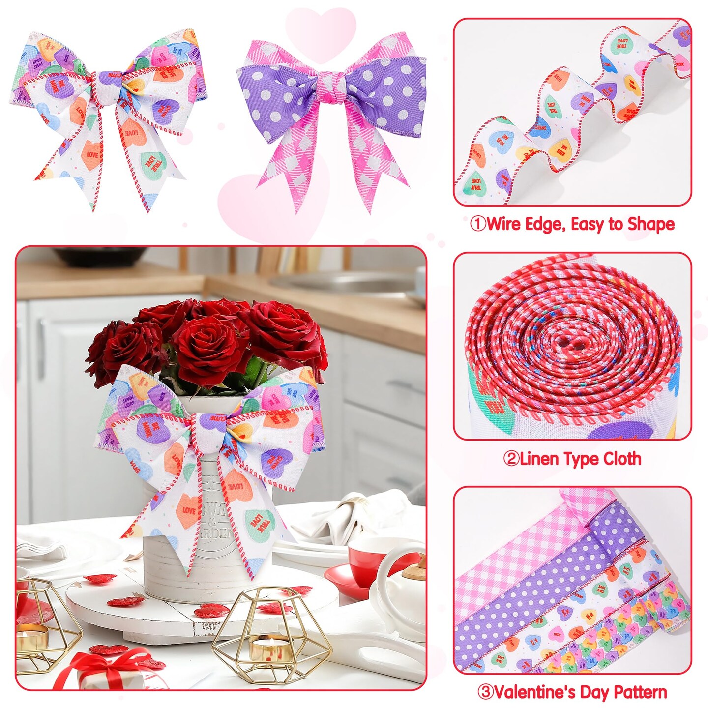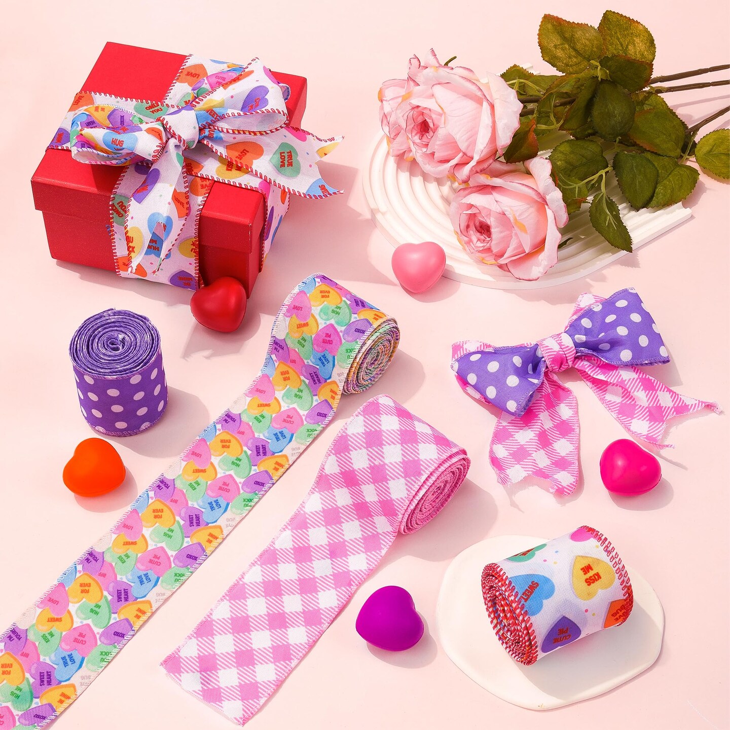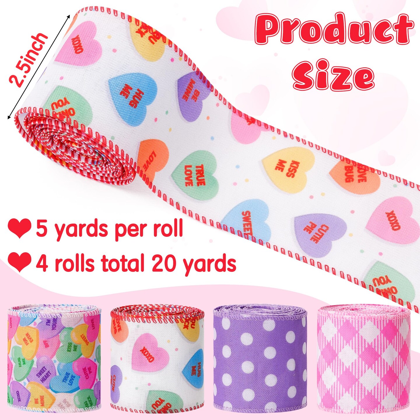 4 Rolls Love Candy Color Wired Edge Ribbon Conversation Heart Grid Dot Gift Box Wrapping Ribbon Wreath Decorations Handmade Bow Craft for Wedding Holiday (2.5 Inch, 20 Yard)