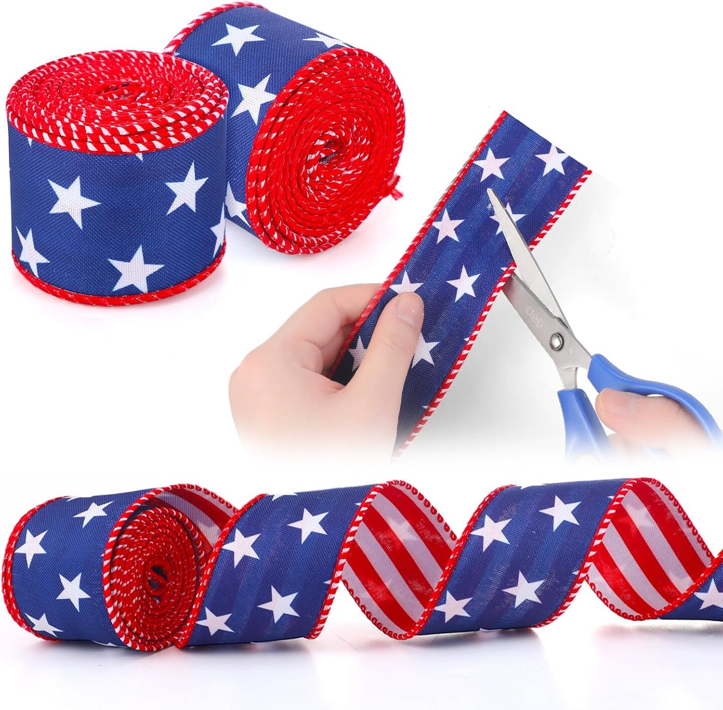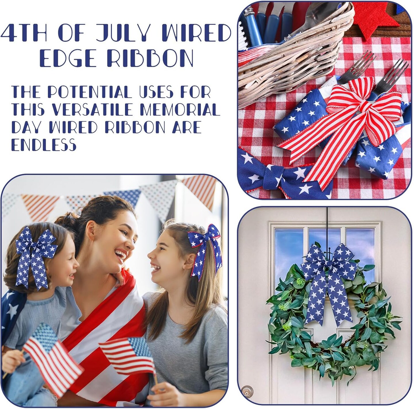 4 Rolls Patriotic Wired Ribbon 20 Yard 4th of July Red White Blue Stars Stripes American Flag USA Patriotic Decorative Edge Ribbons