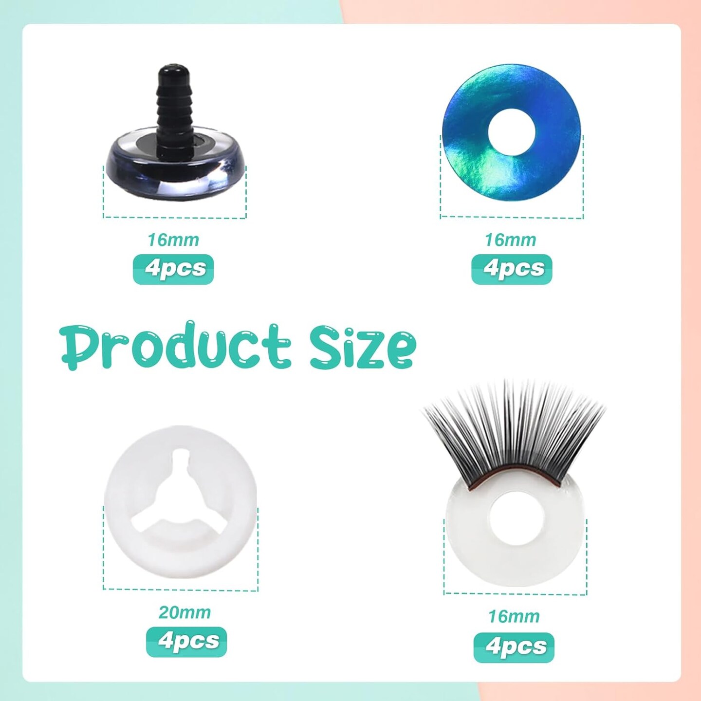 4 Sets 16mm Glitter Safety Eyes with Washers and Eyelashes – Plastic Craft Eyes for Amigurumis, Puppets, Plush Animals, and DIY Dolls