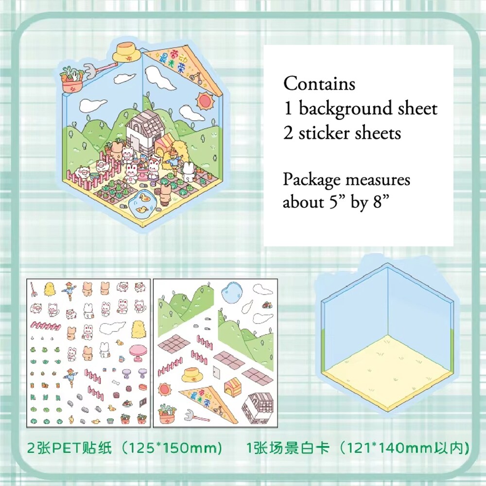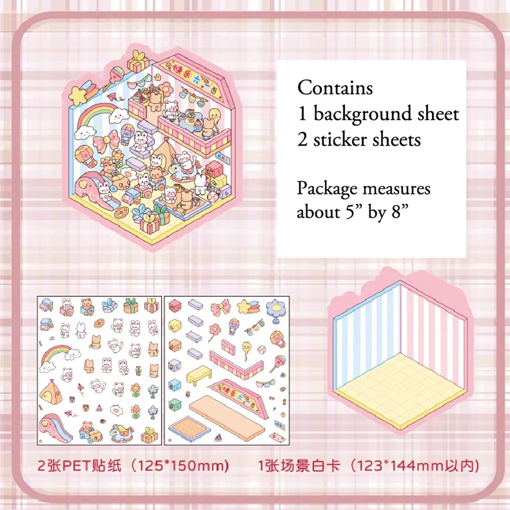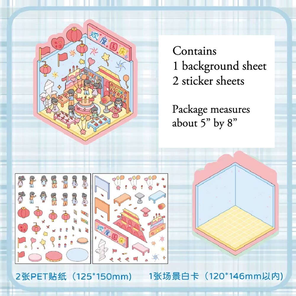 4 Sets Cute Isometric Sticker Landscape Scenes: Party Classroom & Park, Adorabilities