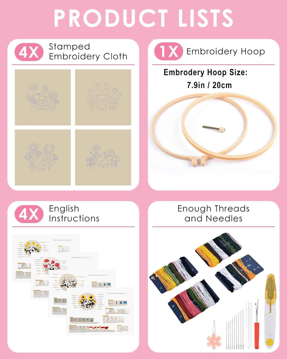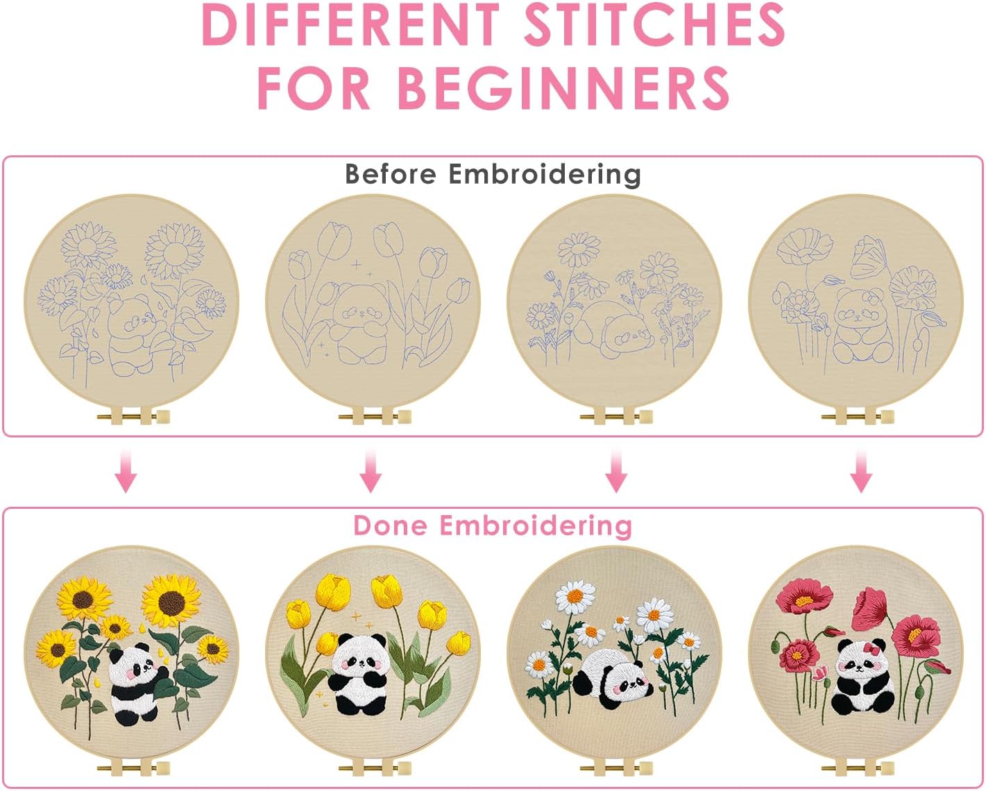 4 Sets Embroidery Kit for Adult, Panda Embroidery Practice Kits for Beginners Include Embroidery Cloth Hoops Threads for Craft Lover Hand Stitch with Embroidery Skill Techniques