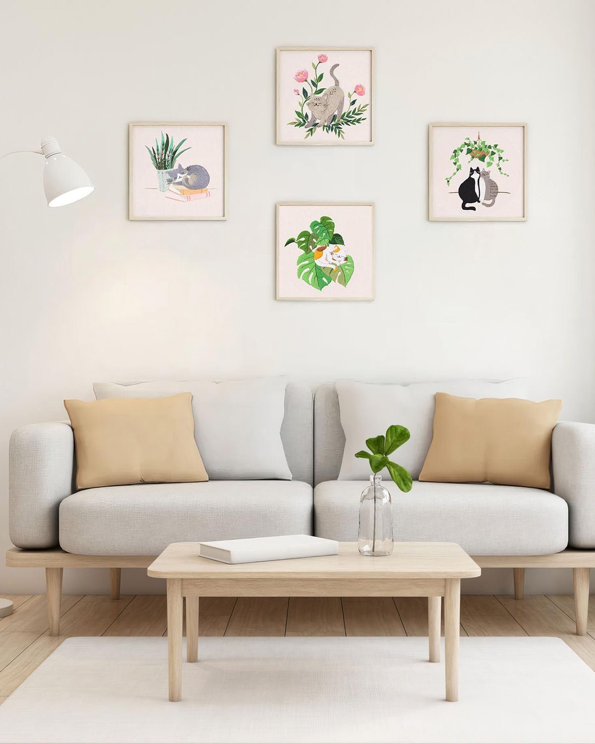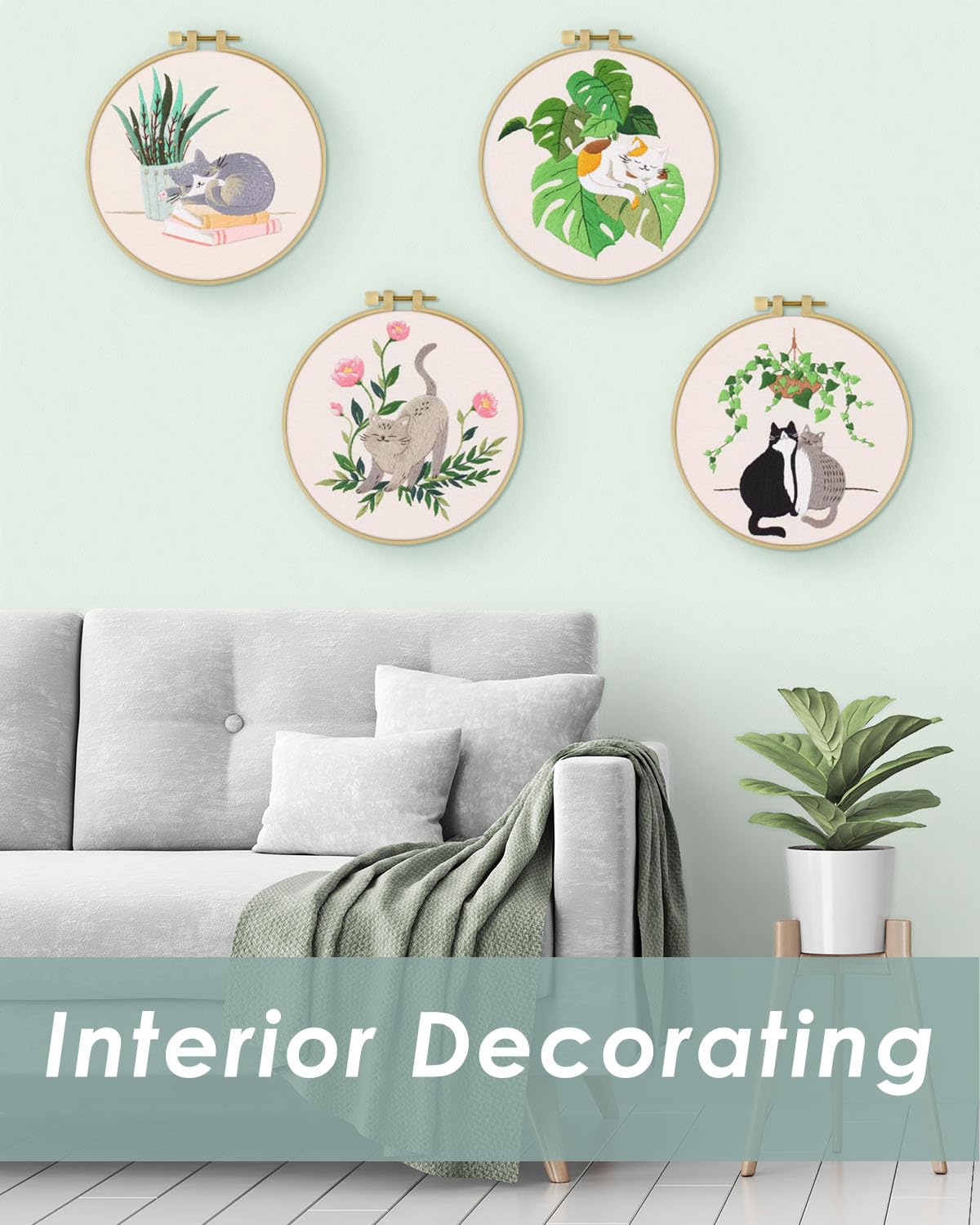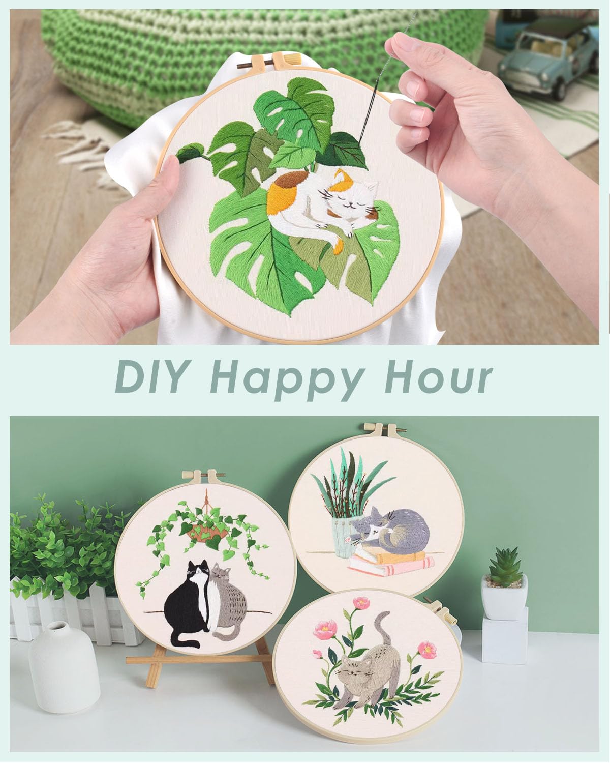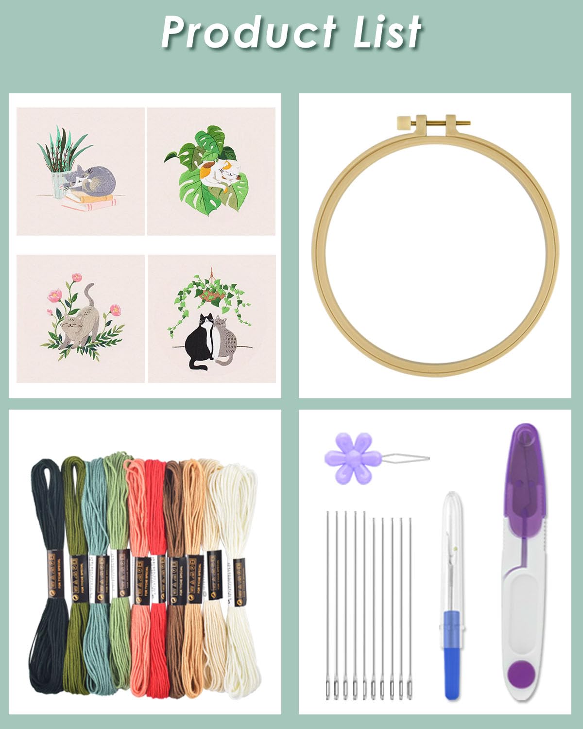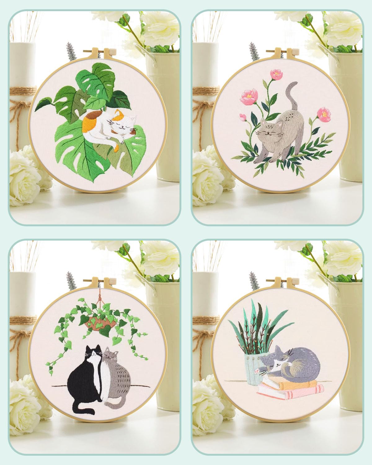 4 Sets Embroidery Kit for Beginners,Hummingbird and Flower Cross Stitch Set for Include Embroidery Cloth Hoops Threads for Craft Lover Hand Stitch (Cat)