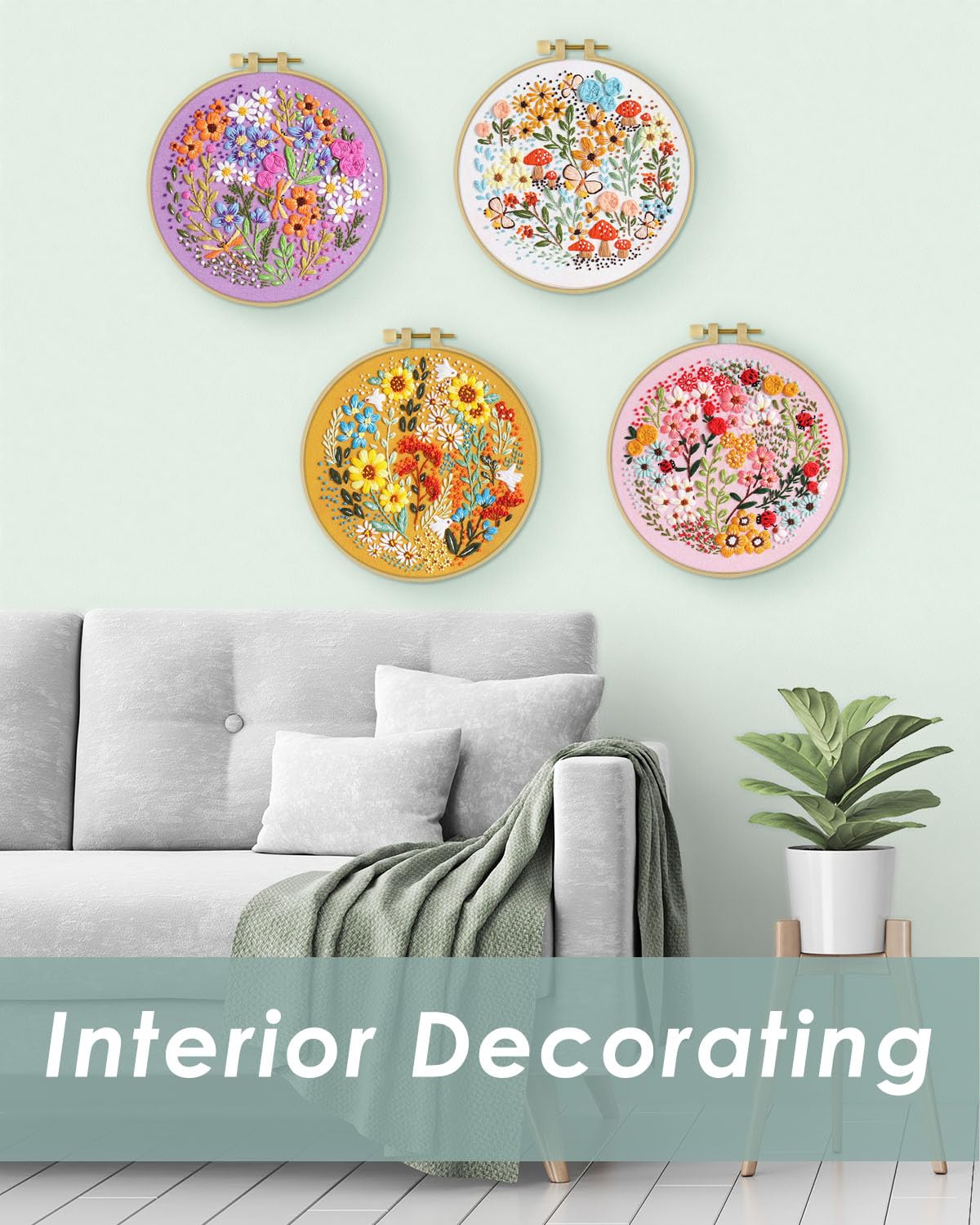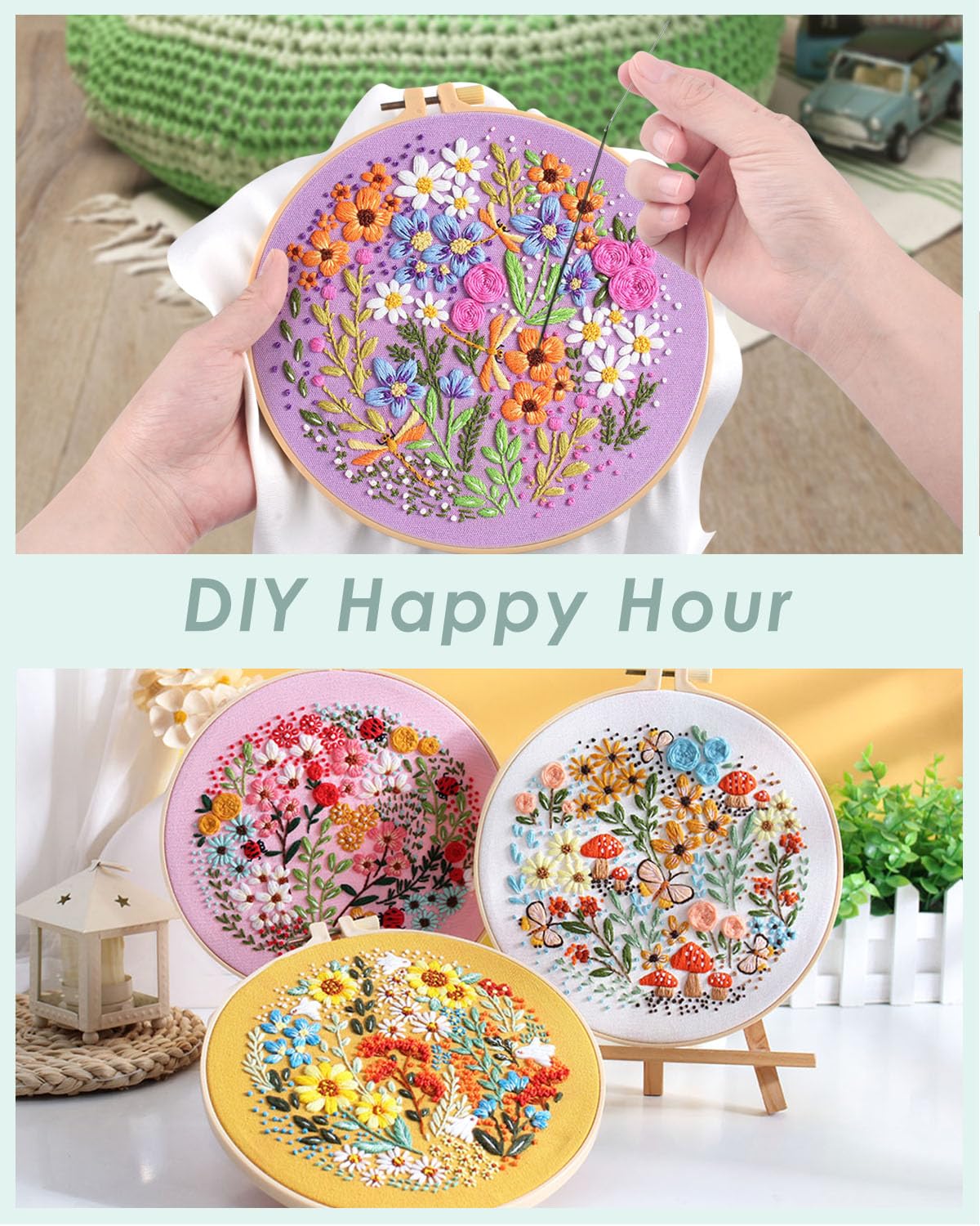 4 Sets Embroidery Kit for Beginners,Hummingbird and Flower Cross Stitch Set for Include Embroidery Cloth Hoops Threads for Craft Lover Hand Stitch (Flower)