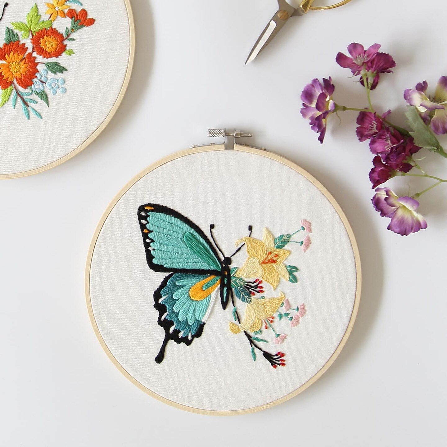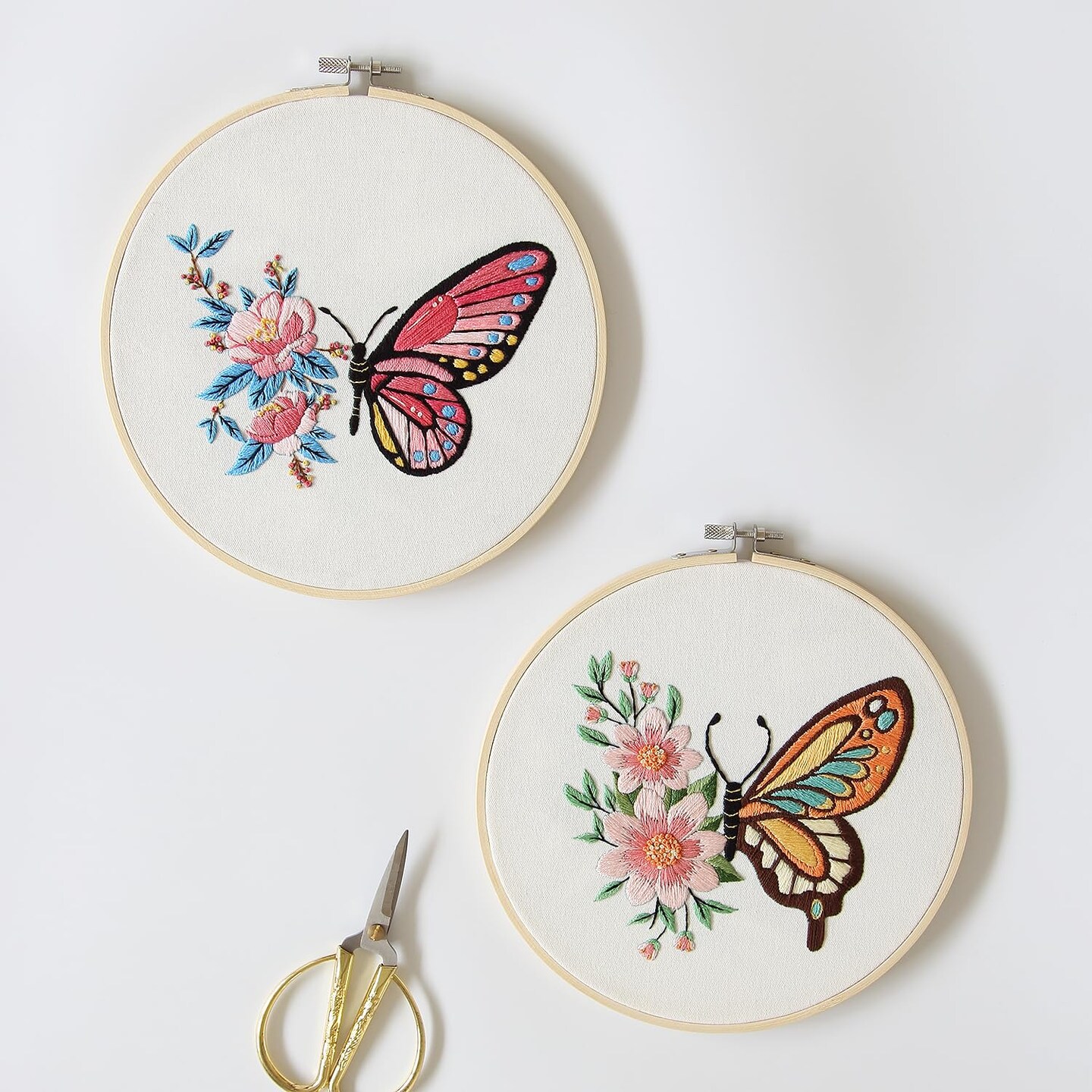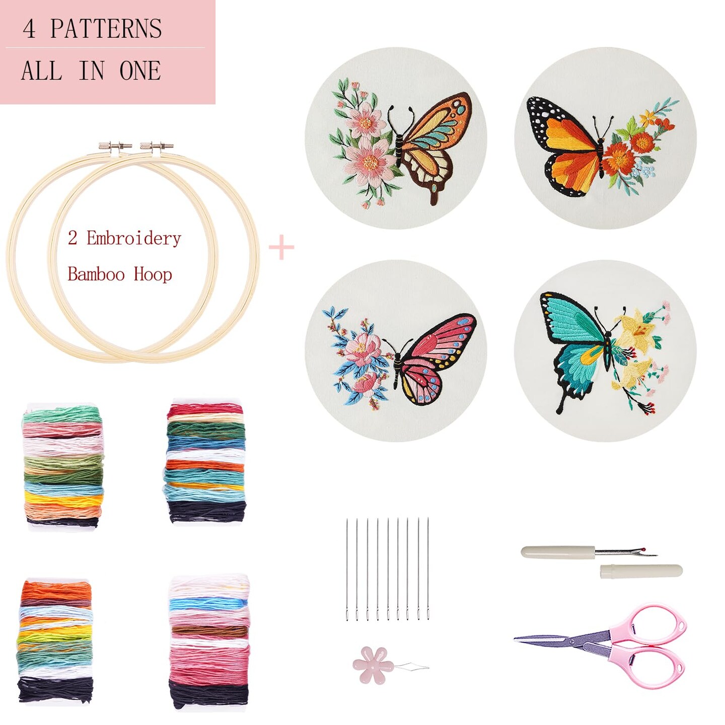 4 Sets Embroidery Set for Beginners, Art Craft, Easy Sewing, Includes Embroidery Clothing, Pattern, Embroidery Hoop, Instruction Manual, Colorful Thread Needles Set (Butterfly)
