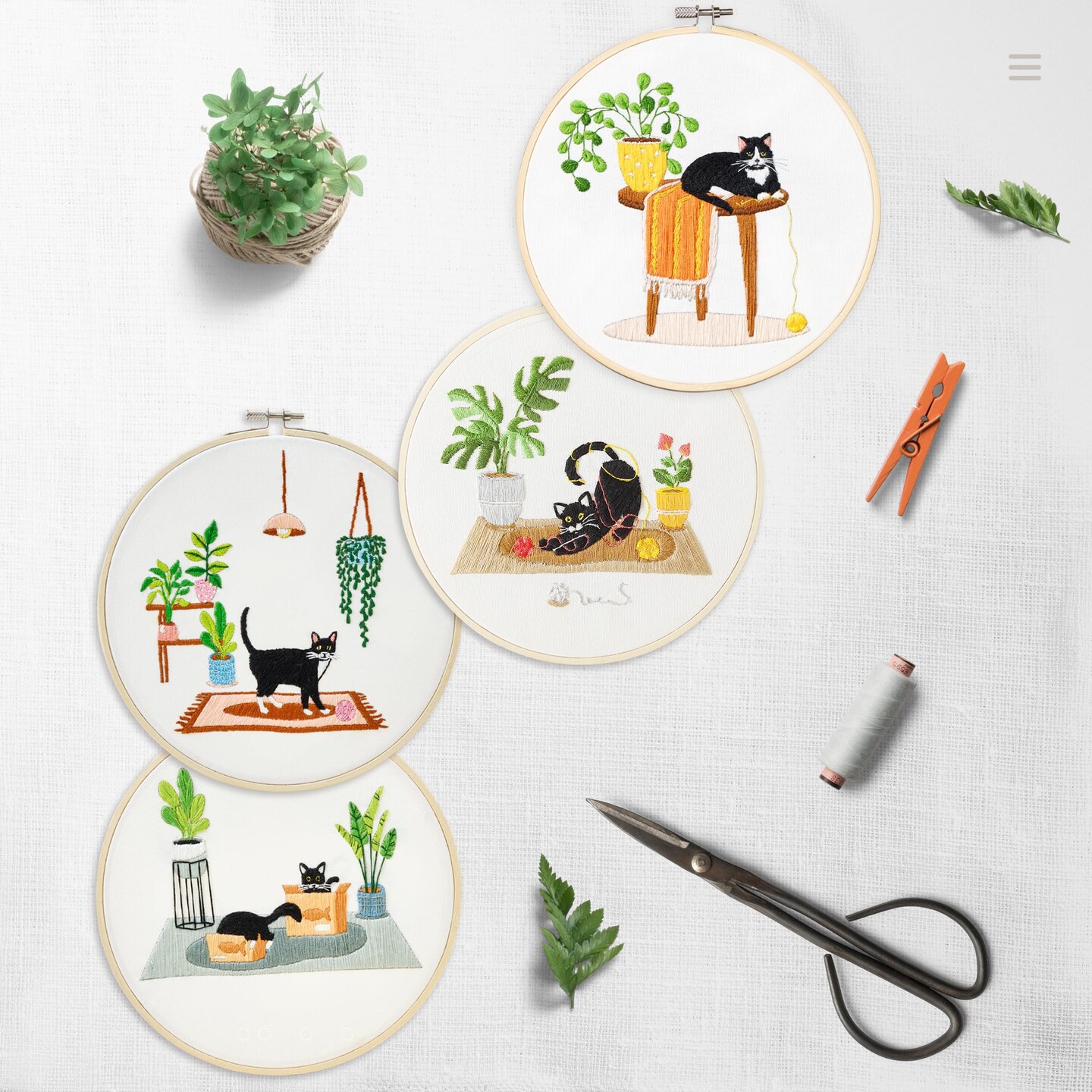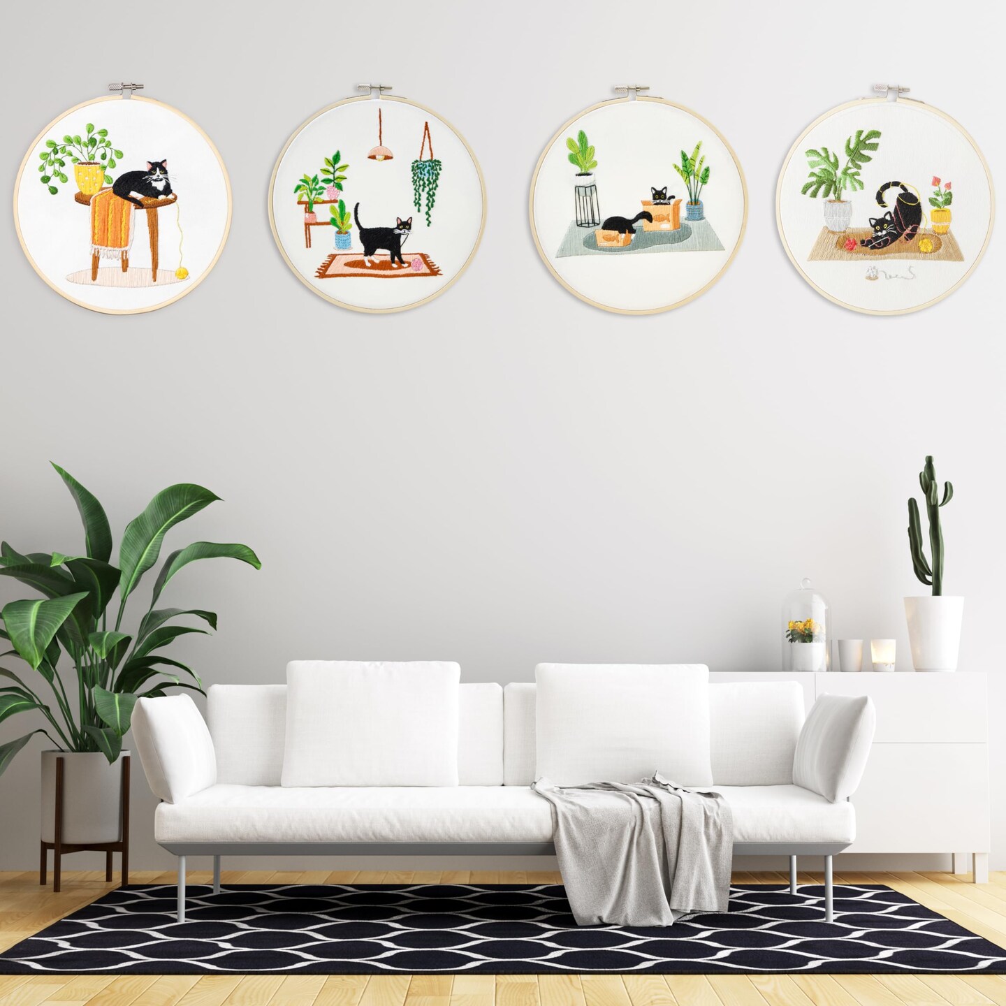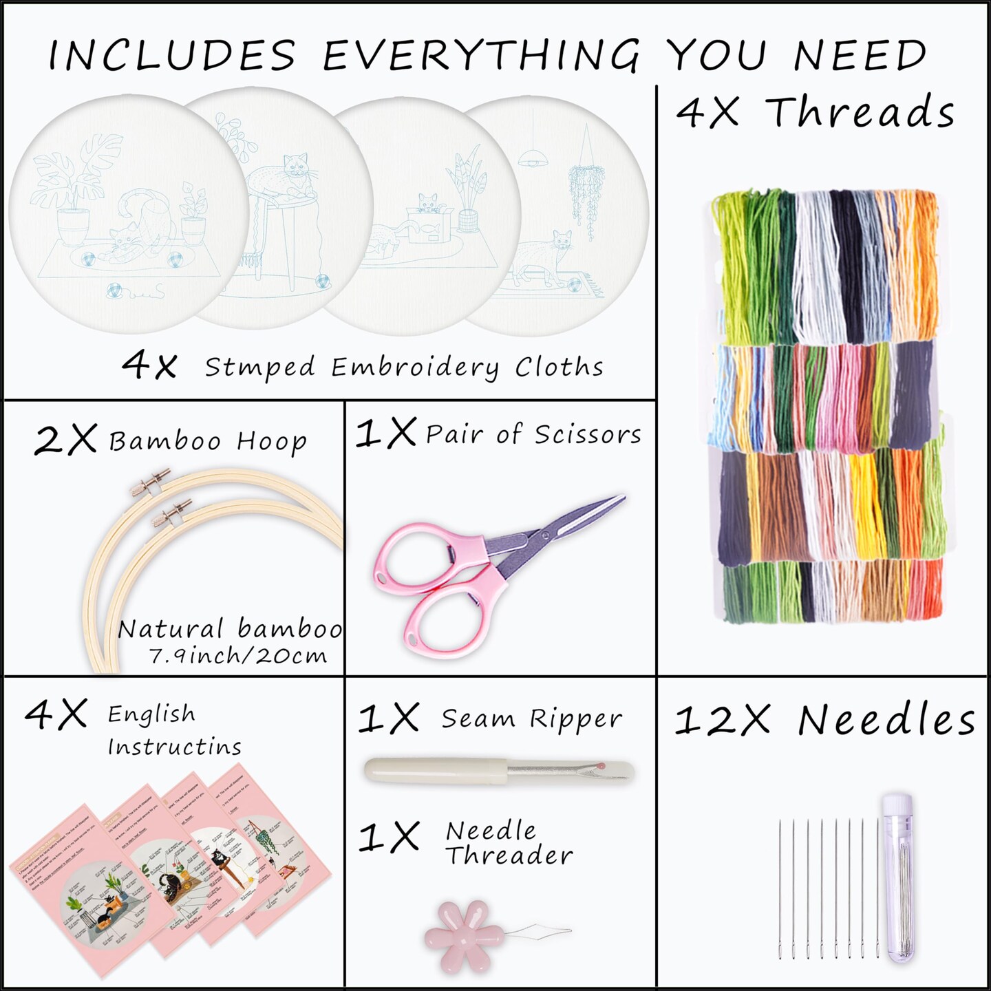 4 Sets Embroidery Set for Beginners, Art Craft, Easy Sewing, Includes Embroidery Clothing, Pattern, Embroidery Hoop, Instruction Manual, Colorful Thread Stitch Set (Cat)