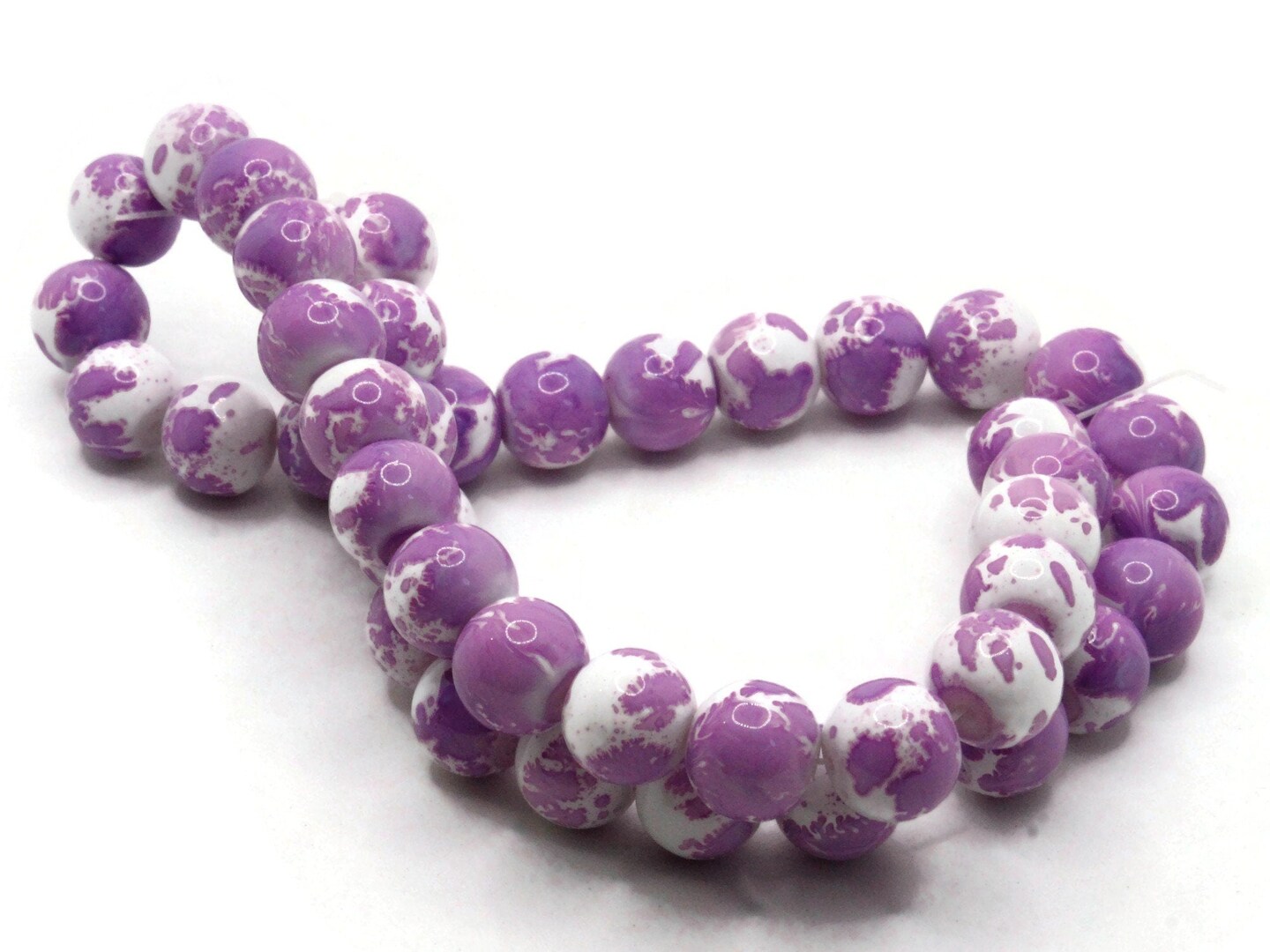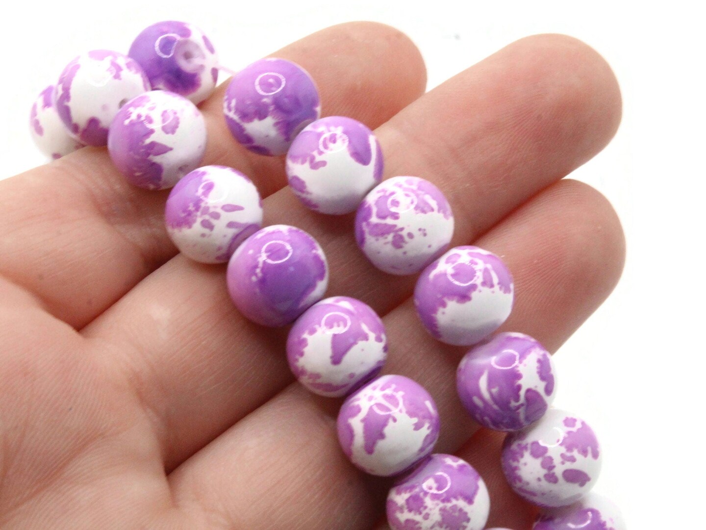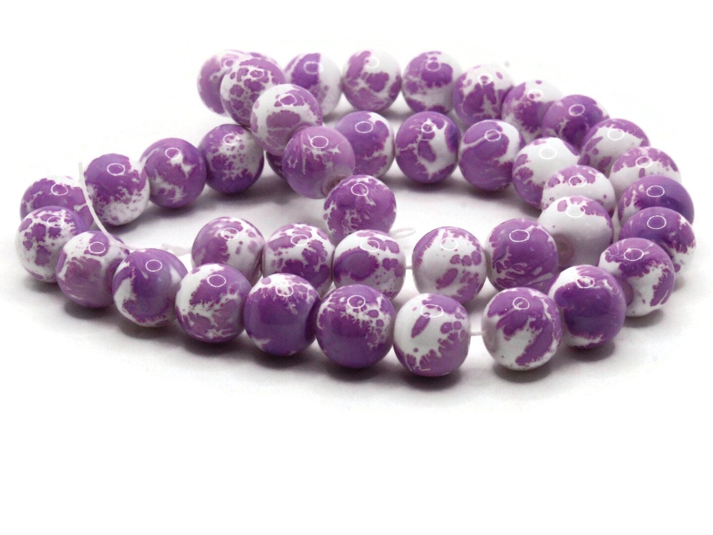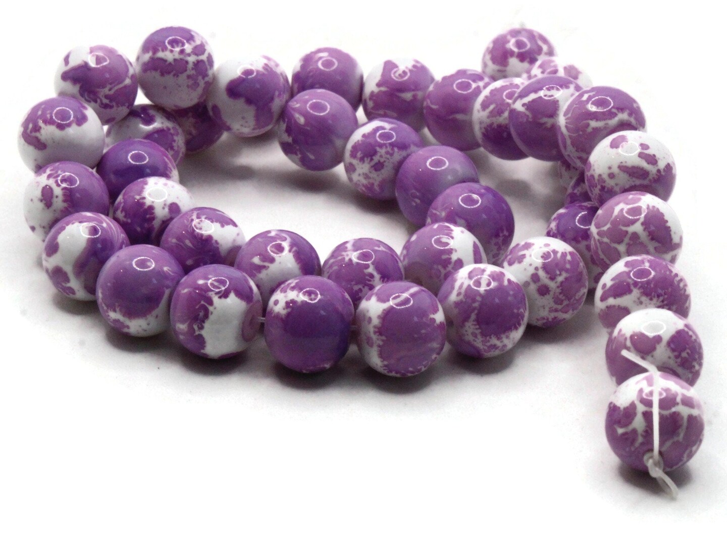 40 10mm White with Purple Round Glass Splatter Paint Beads