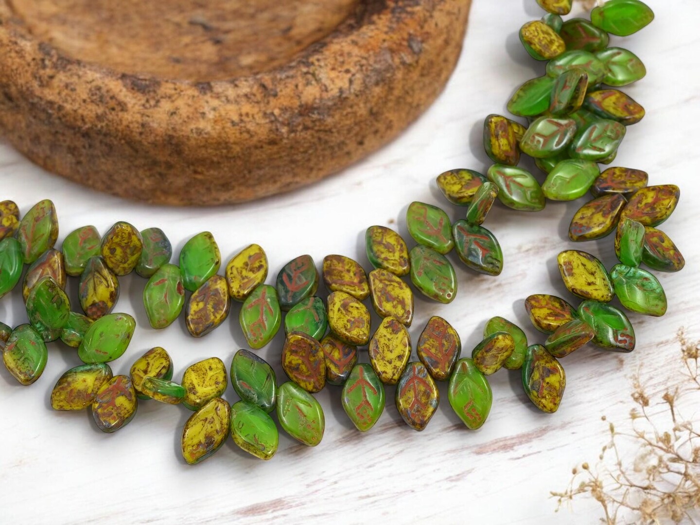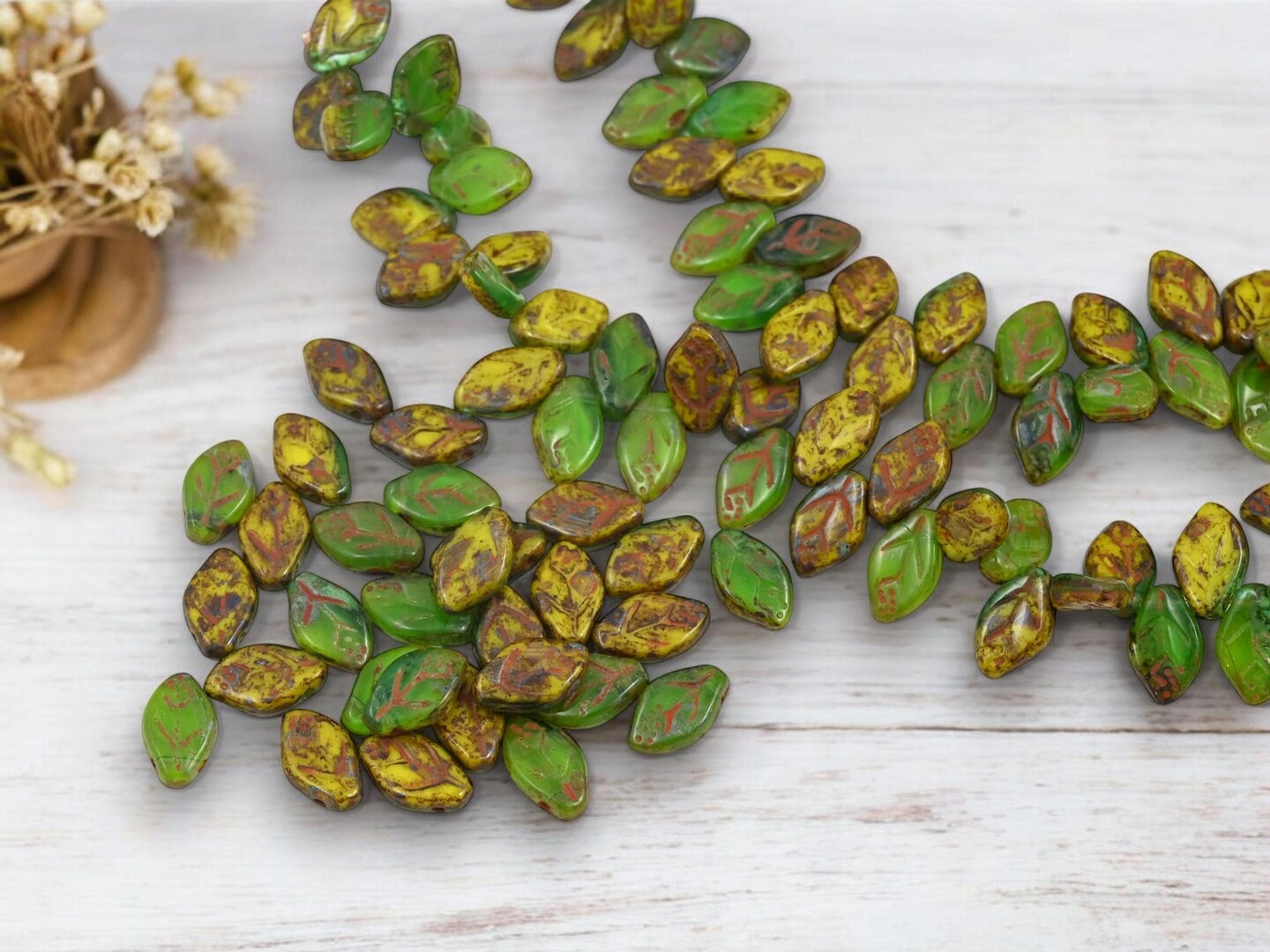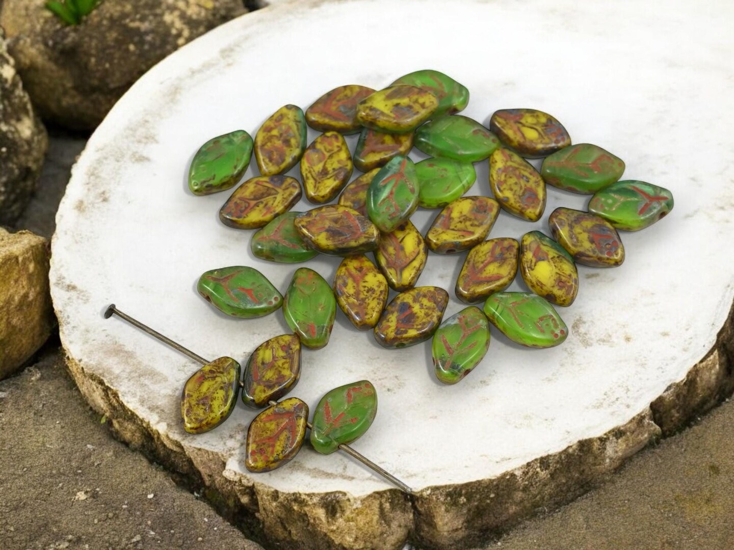 *40* 12x8mm Blended Yellow + Green Travertine Top Drilled Leaf Beads