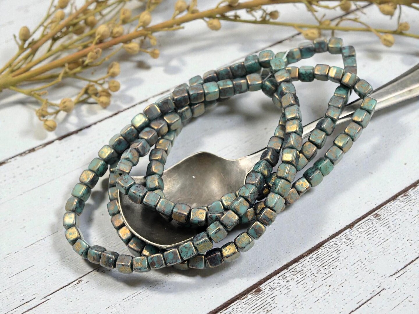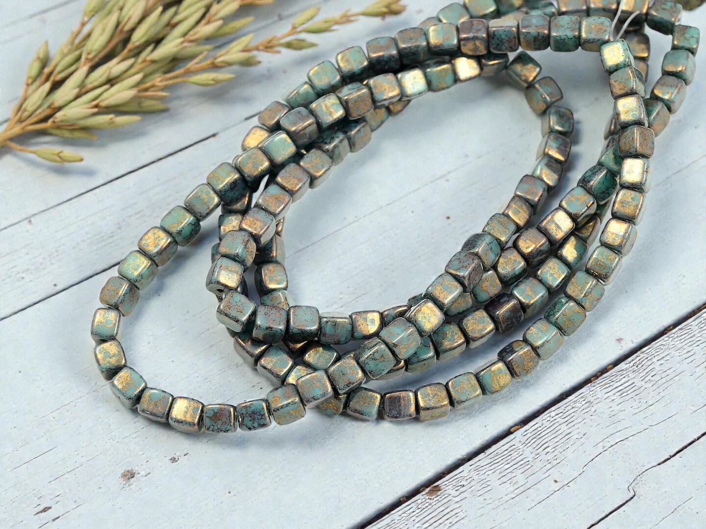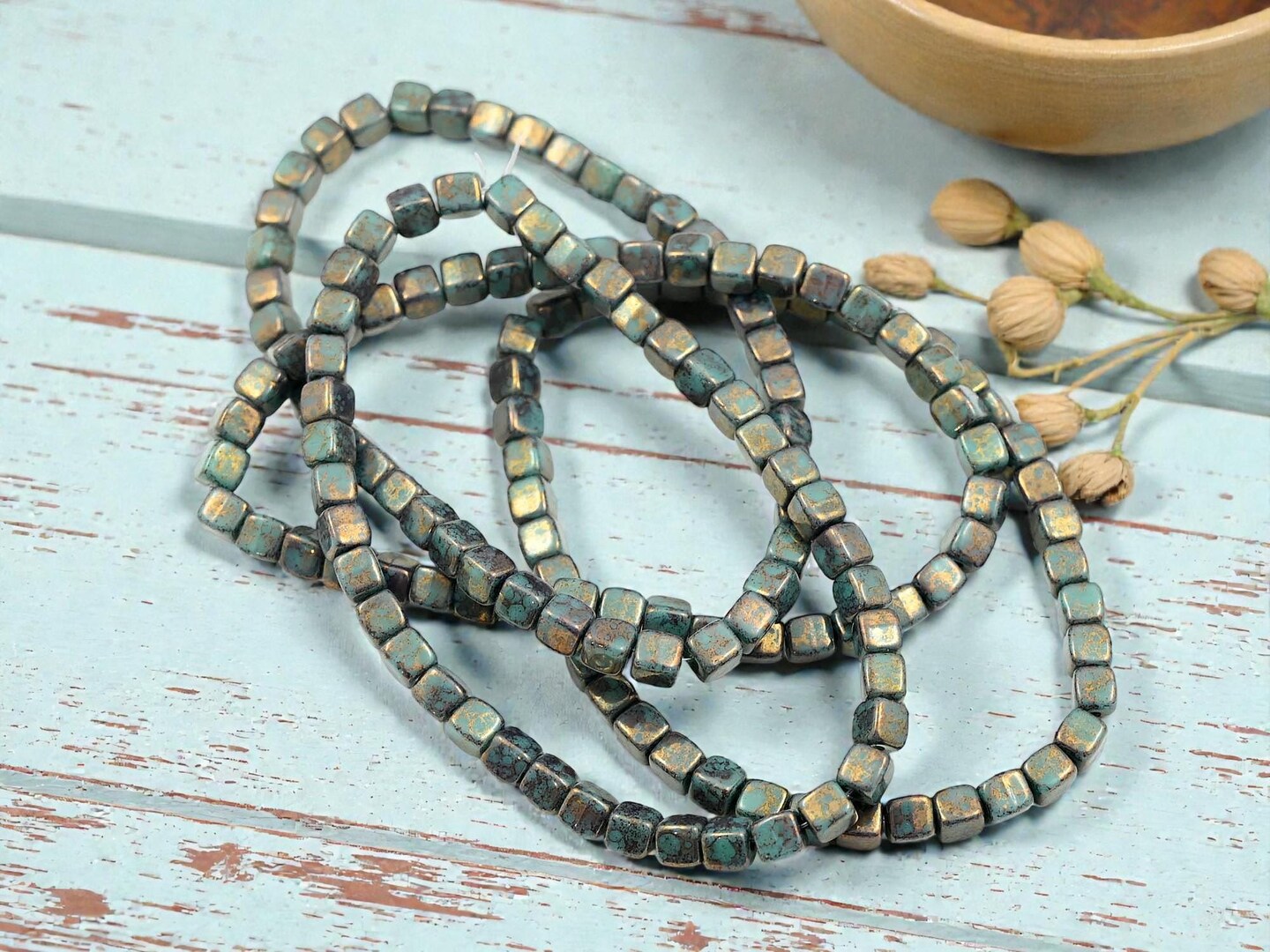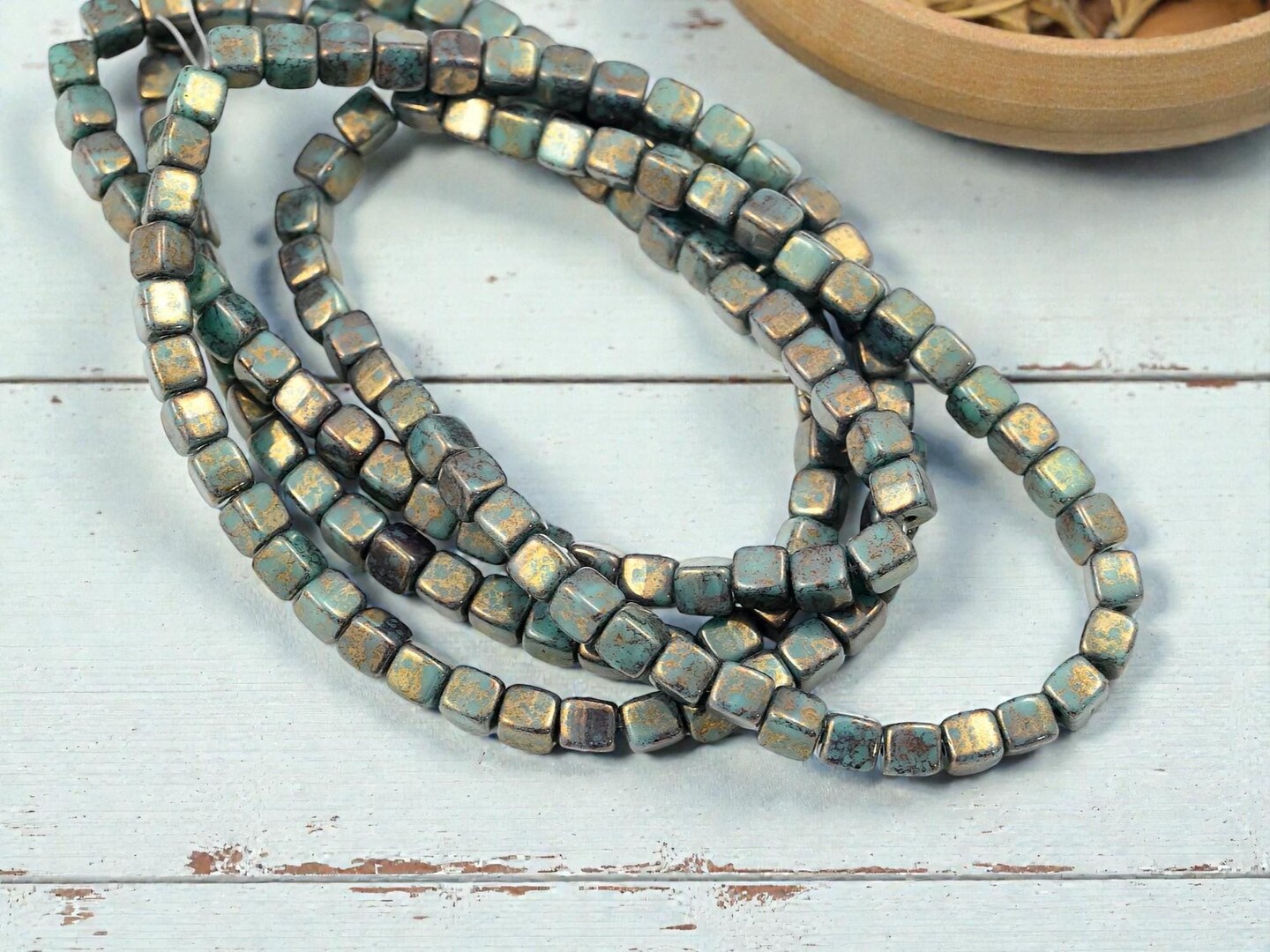 *40* 4mm Bronze Picasso Washed Persian Turquoise Cube Beads