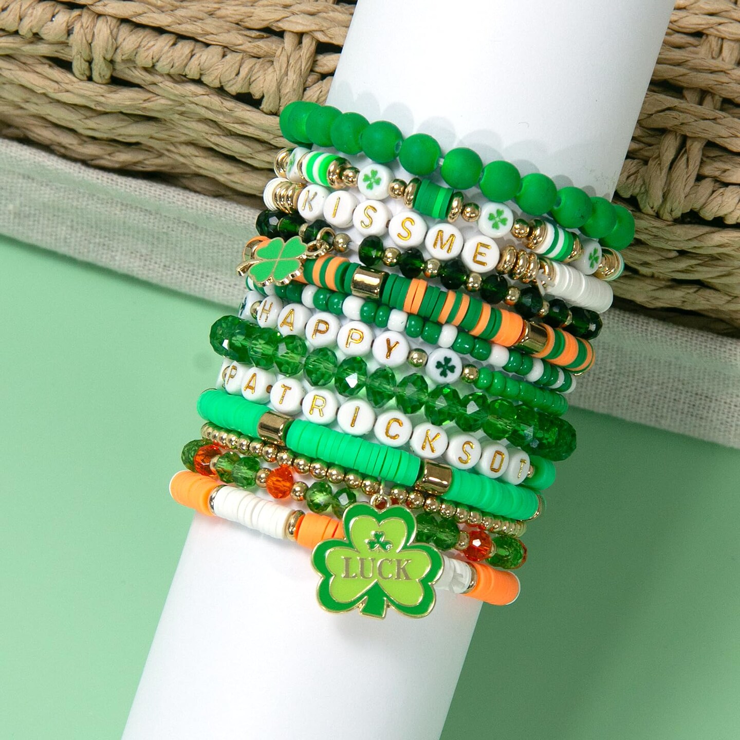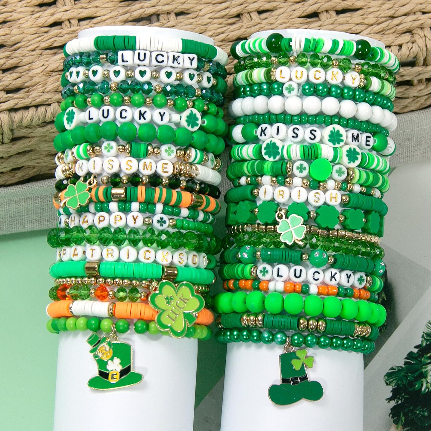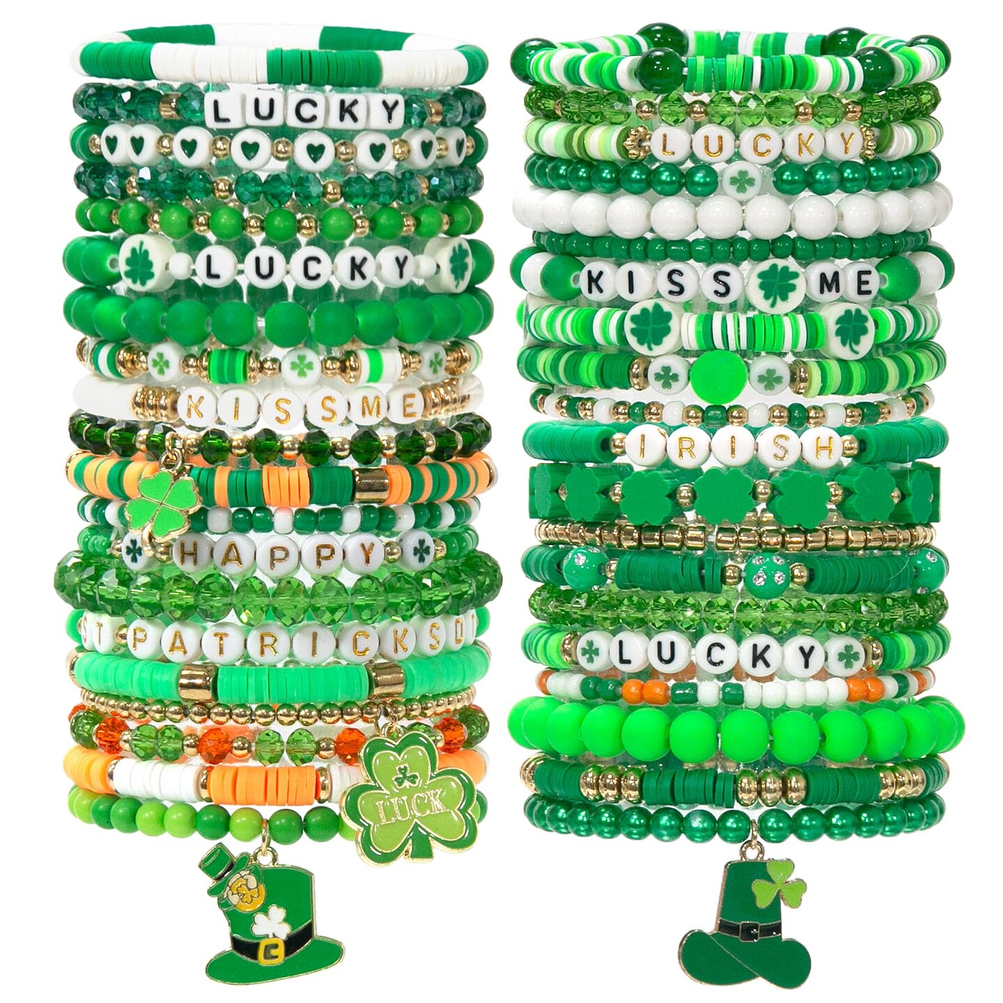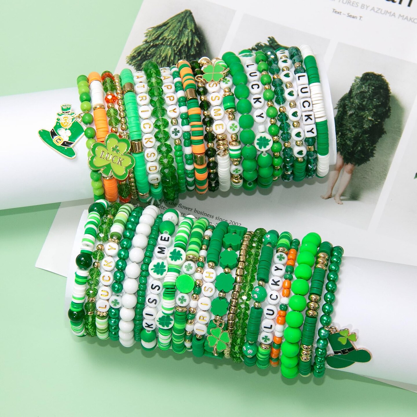 40 Pcs St. Patrick's Day Shamrock Bracelets Set Green Irish Clay Stretch Stackable Friendship Bracelet for Women, Party Favors Jewelry Gift Party Supplies