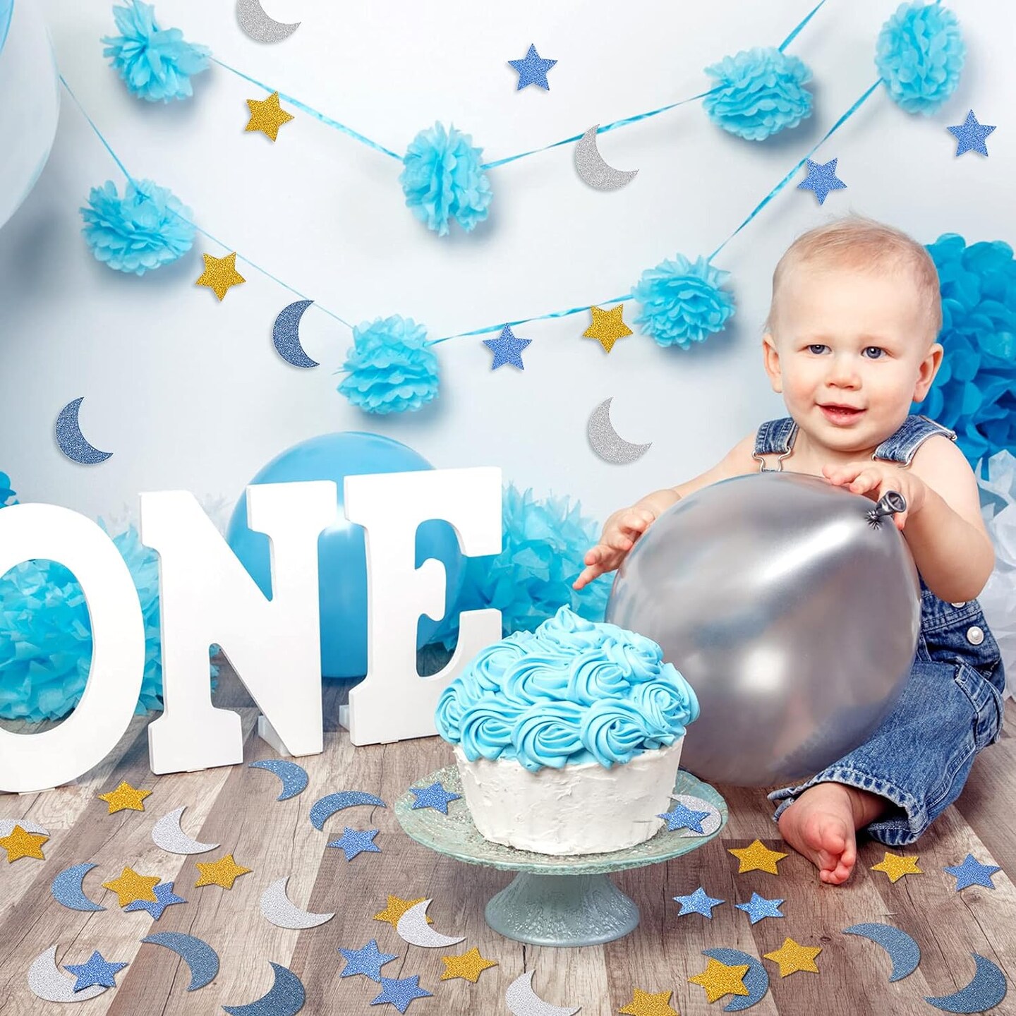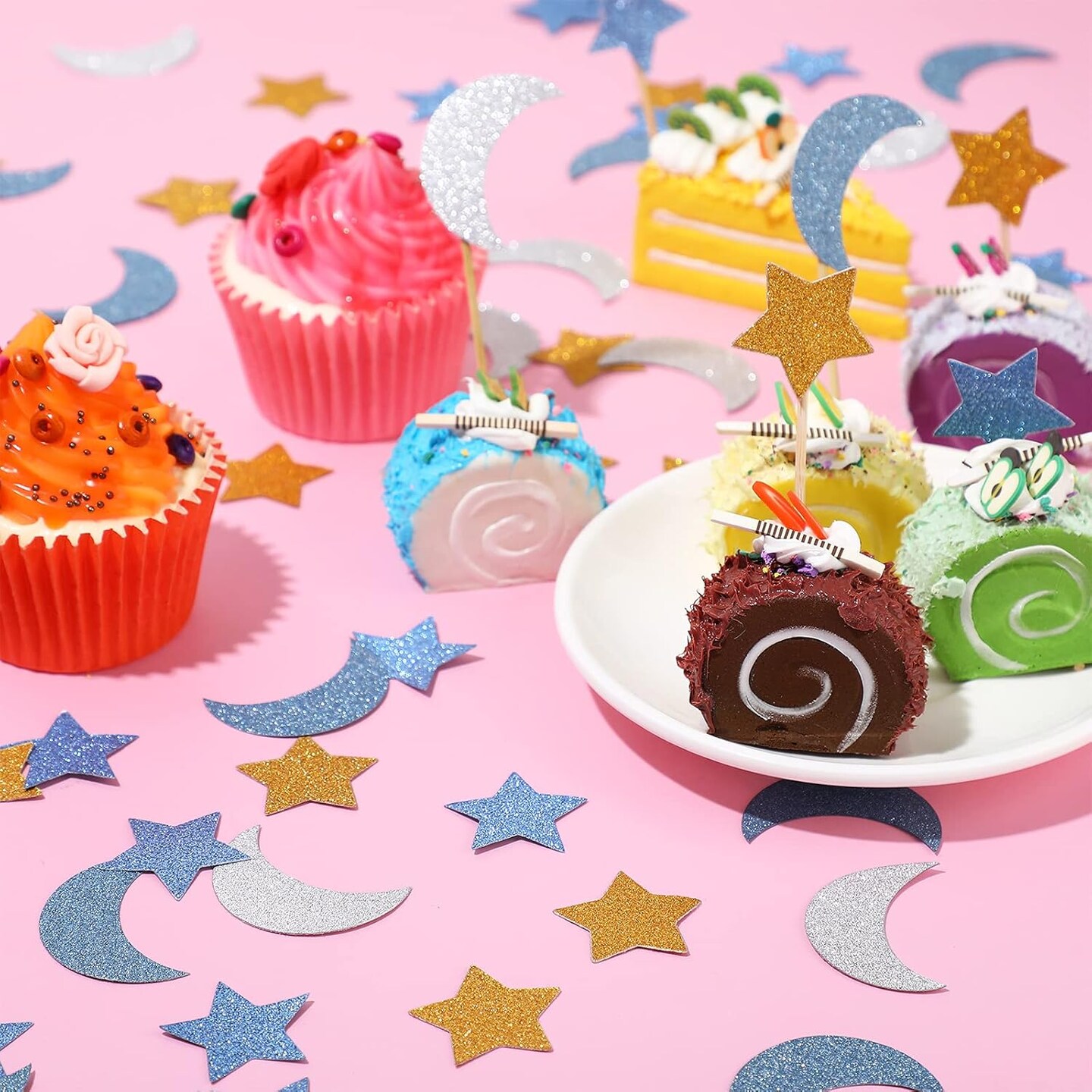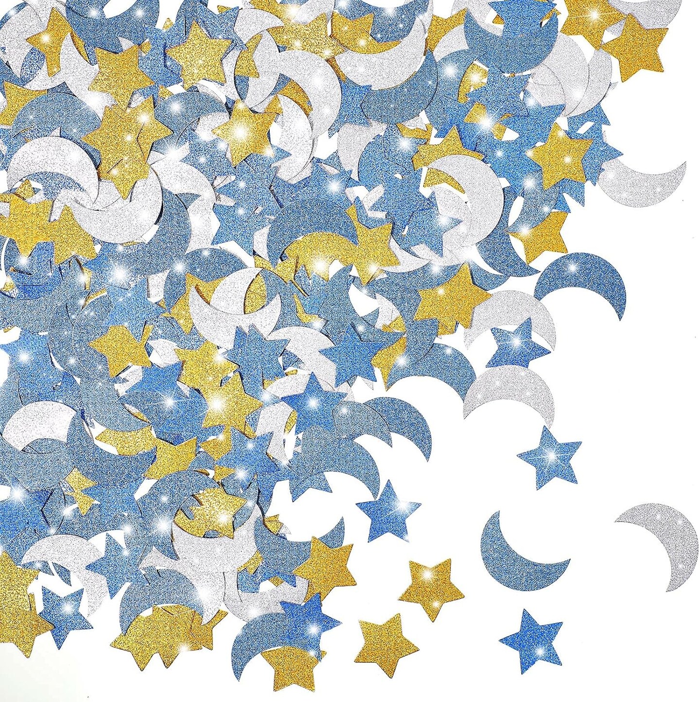 400 Pieces Glitter Star and Moon Paper Confetti Double Side Table Paper Confetti Sequin for Wedding Birthday Baby Shower Moon and Star Party Ramadan Mubarak Decor (Dark Blue, Light Blue, Gold, Silver)