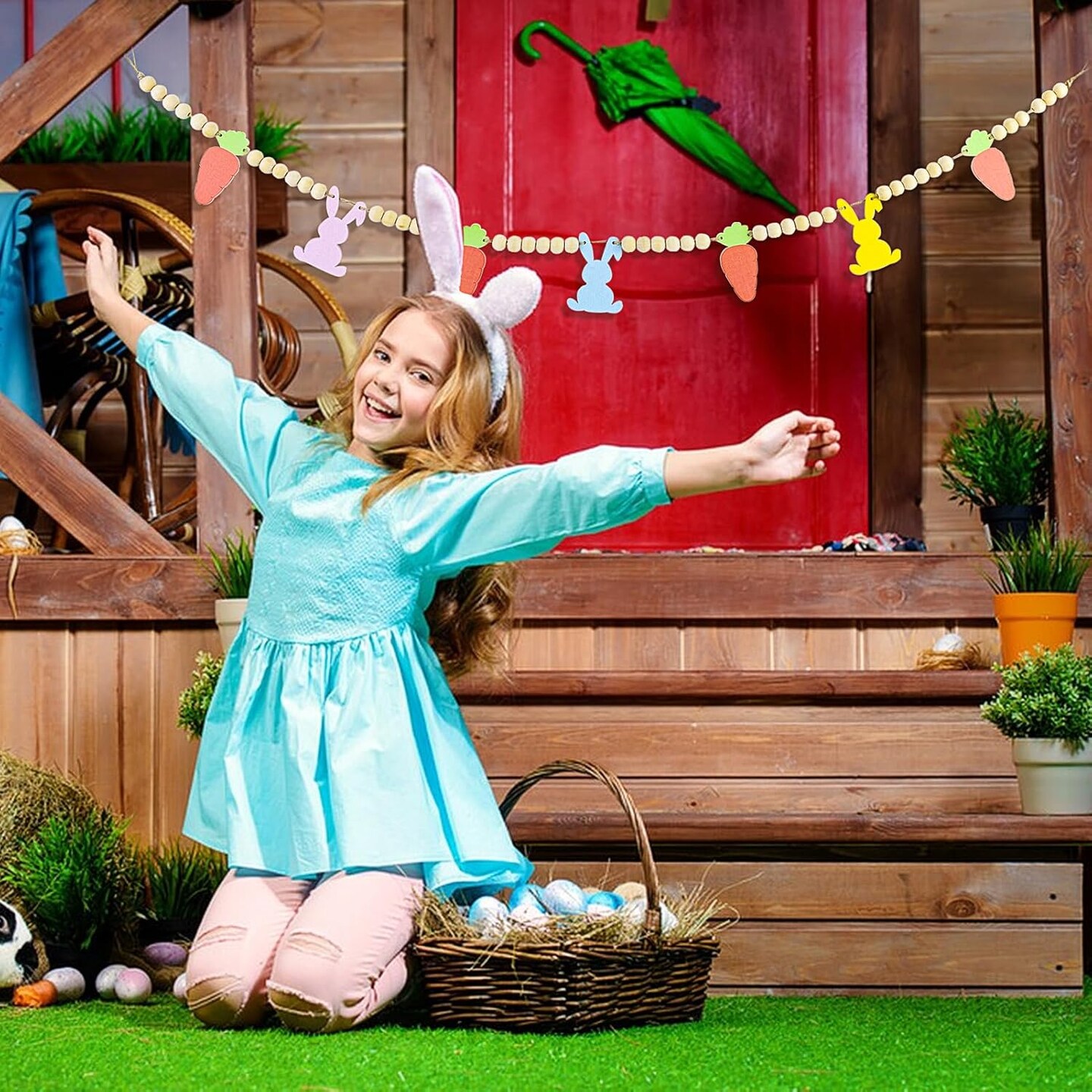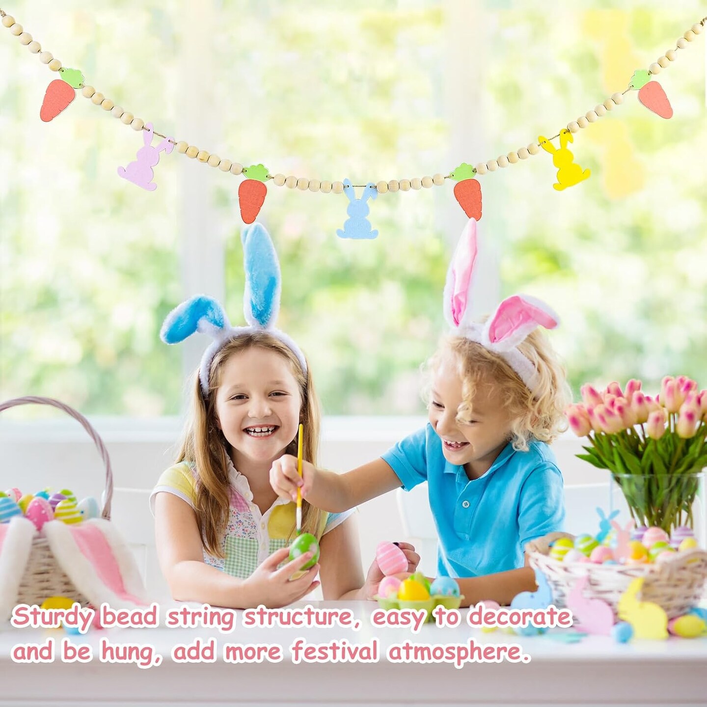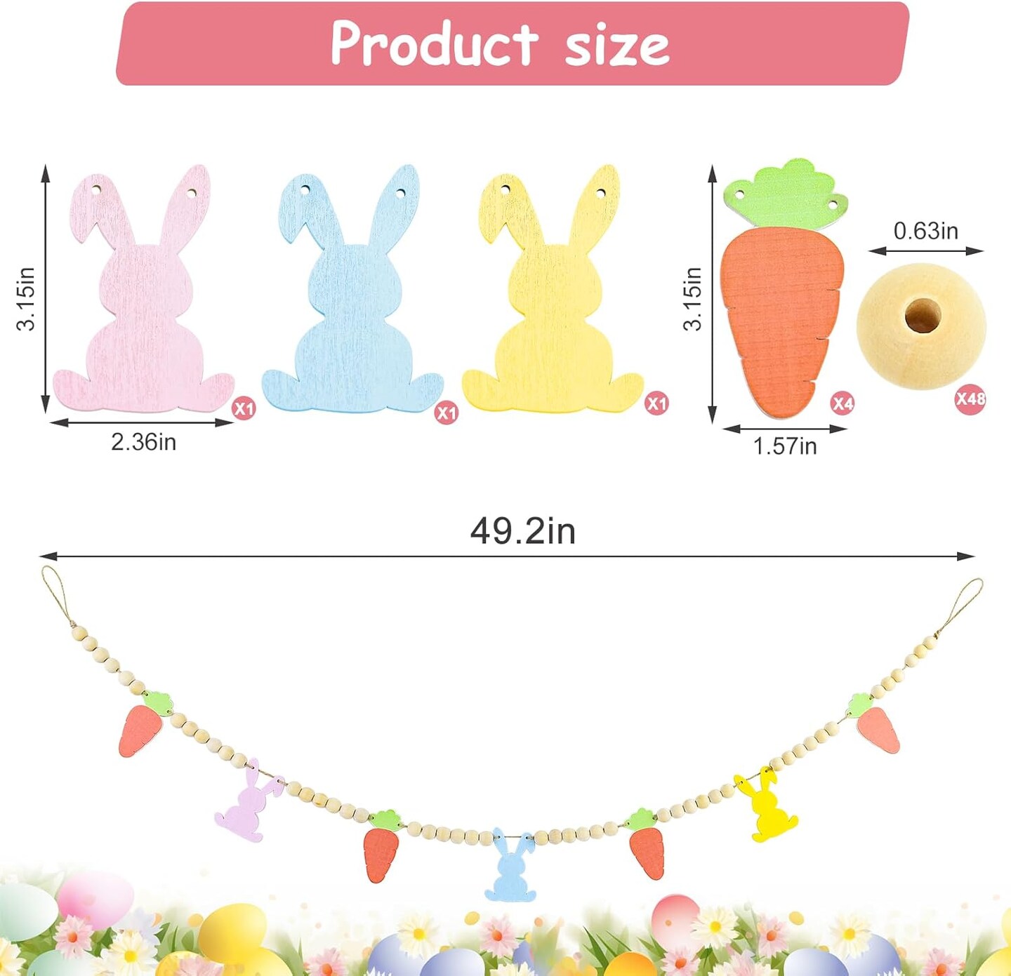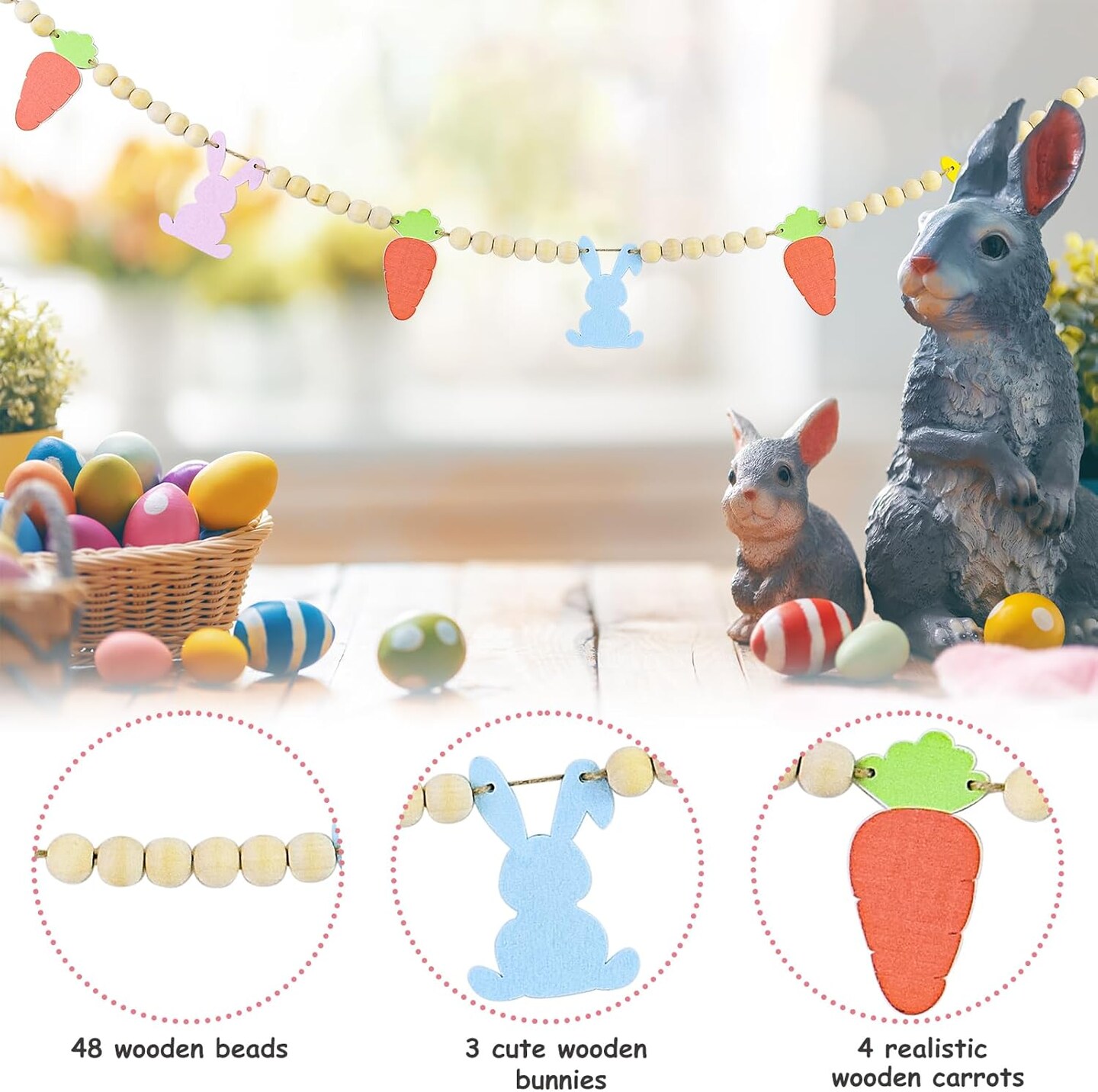 4.1 Ft Easter Bunny Garland – Wooden Beads Banner with Rabbits & Carrots for Mantel, Wall, Fireplace & Spring Home Decor