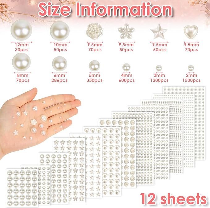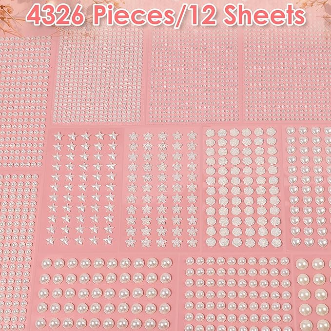 4326 Pcs Self-Adhesive Pearl Stickers – Stick-on Pearls and Gems for Hair, Face, Makeup, and Crafts, Assorted Styles and Sizes