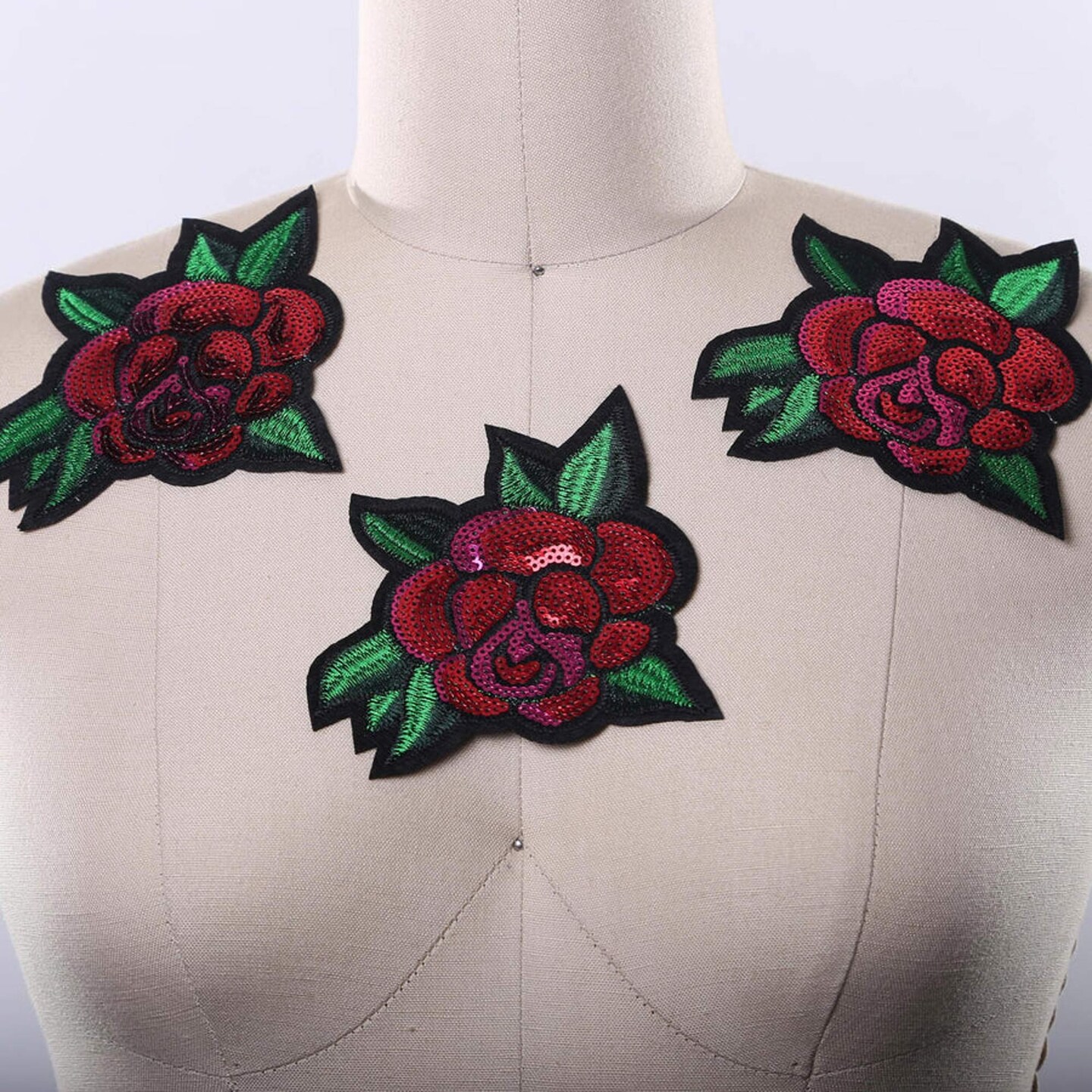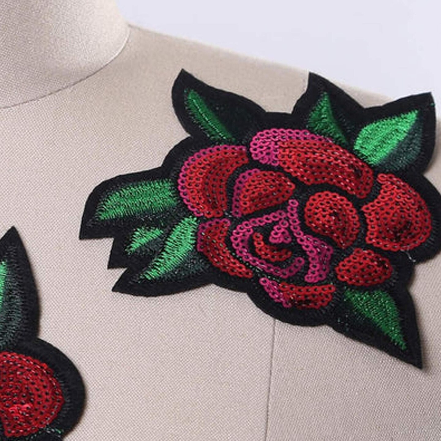 4.5" x 5" Red and Green Leaf Sequined Rose Patch Iron On Applique Embroidery