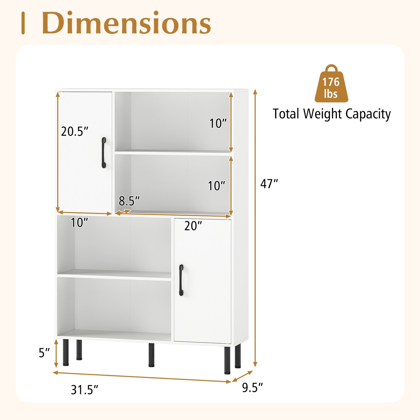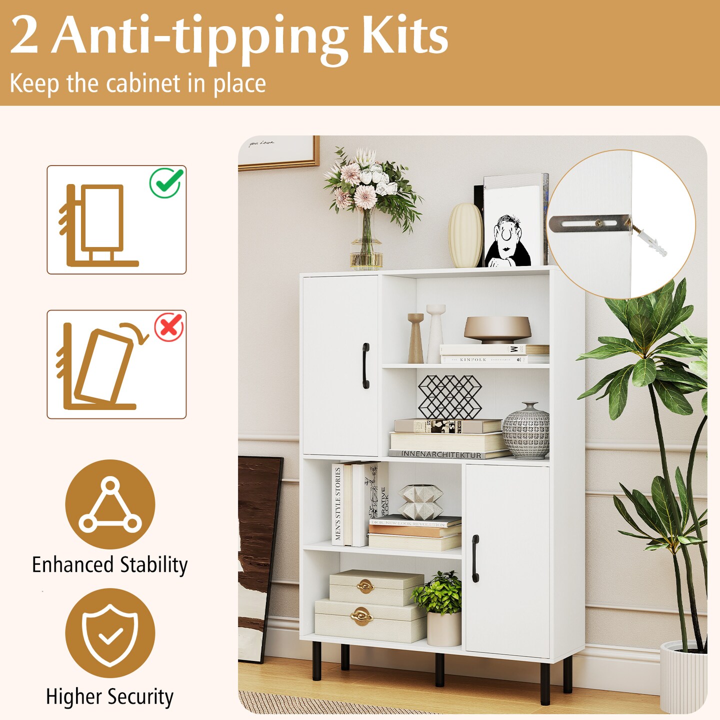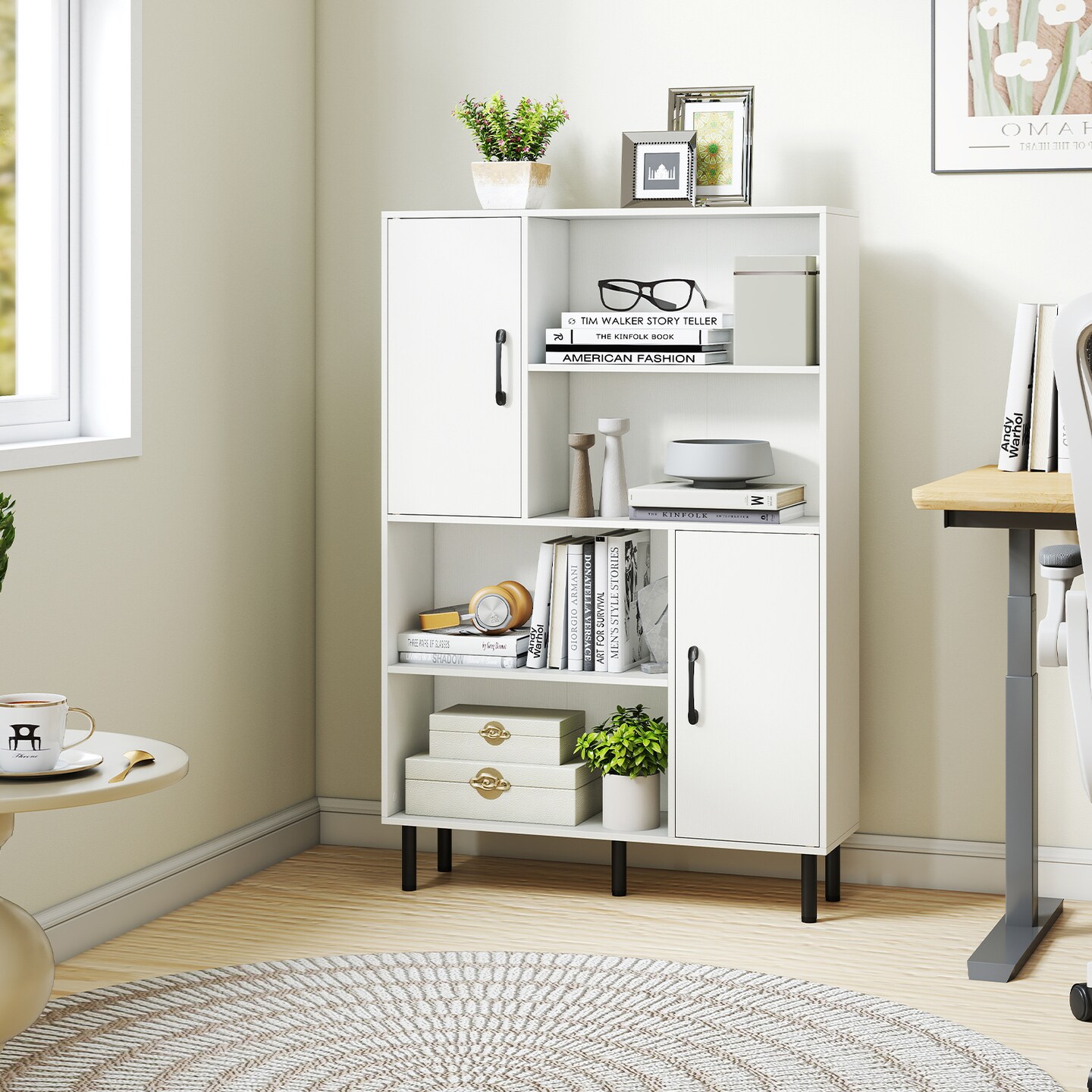 47 Inch Bookcase with Doors 4 Open Shelves Storage Cabinet