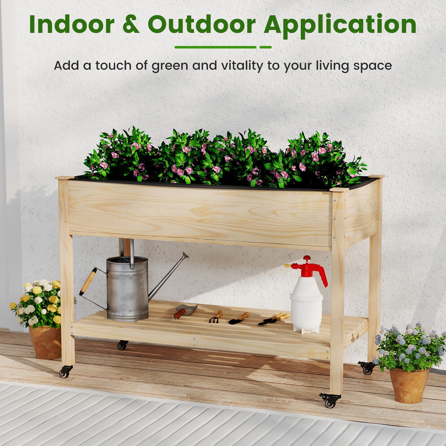 47" Pine Wood Raised Garden Bed with Wheels and Bottom Shelf Outdoor Planter Box with Liner