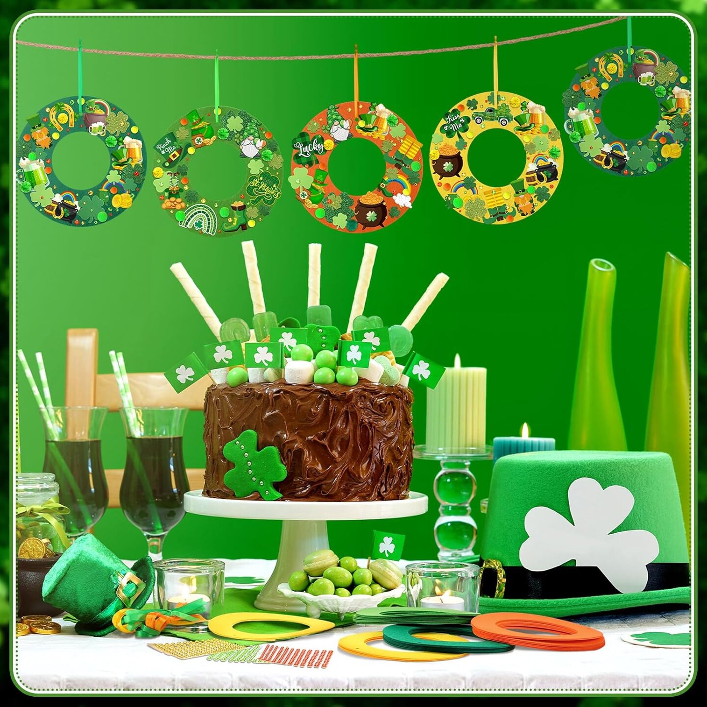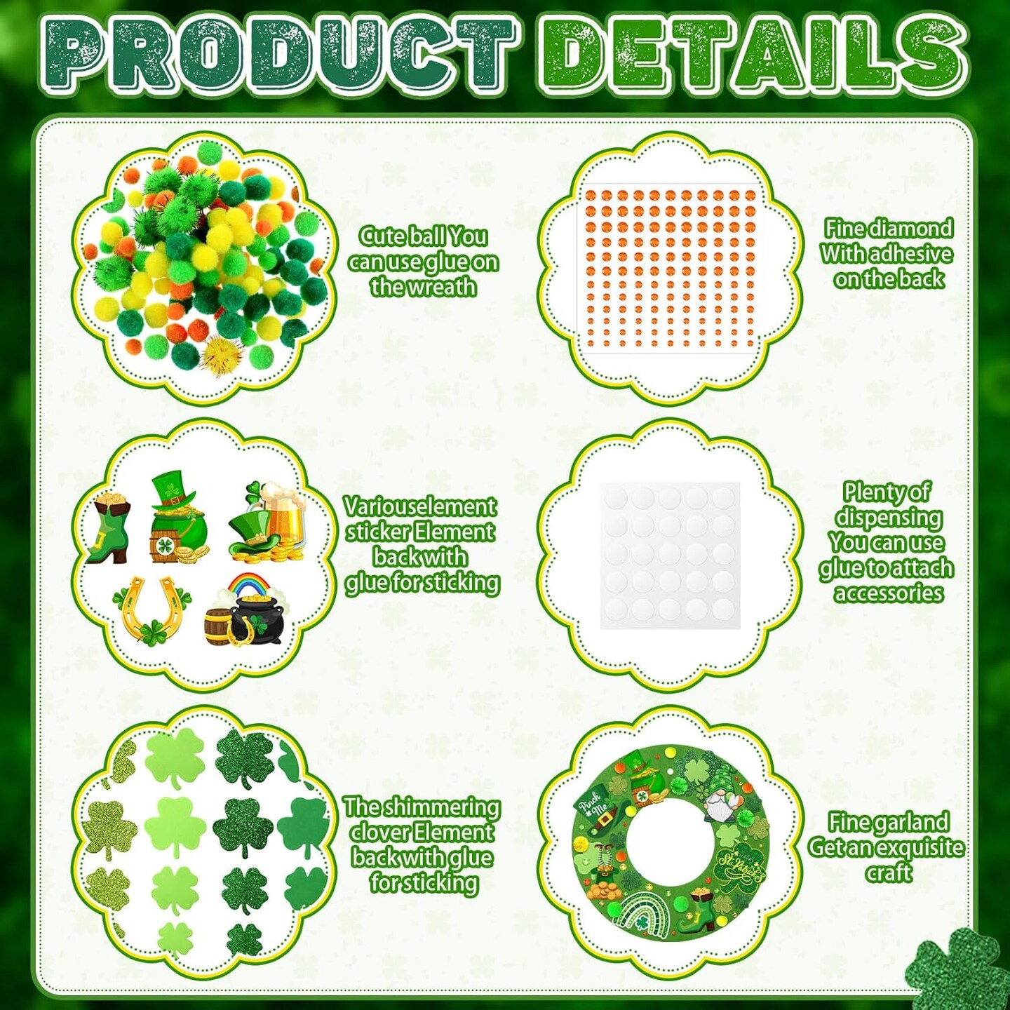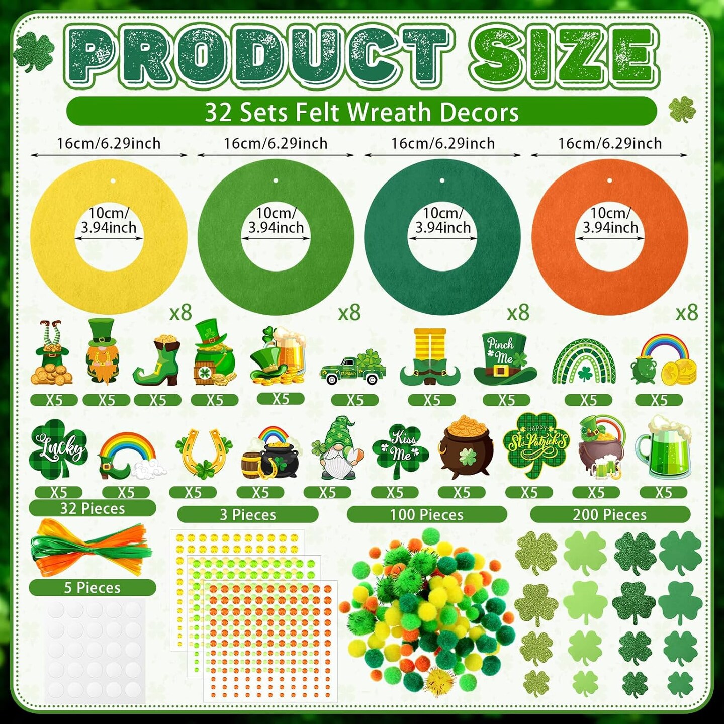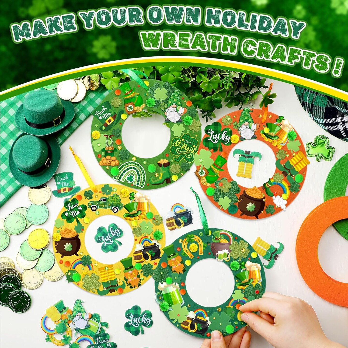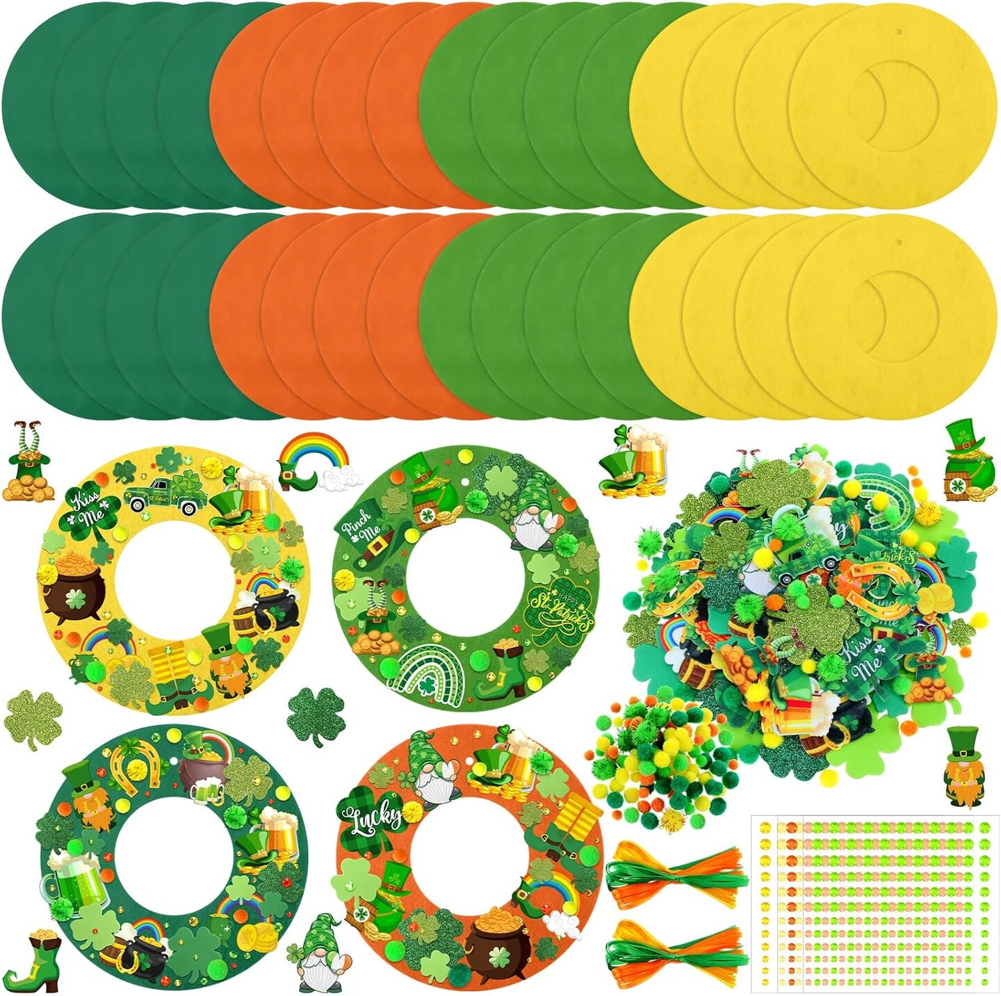 472 PCS St. Patrick’s Day DIY Wreath Craft Kit – Irish Shamrock & Leprechaun Decorations with Stickers, Wool Balls & Ribbons for Home & Party Favors
