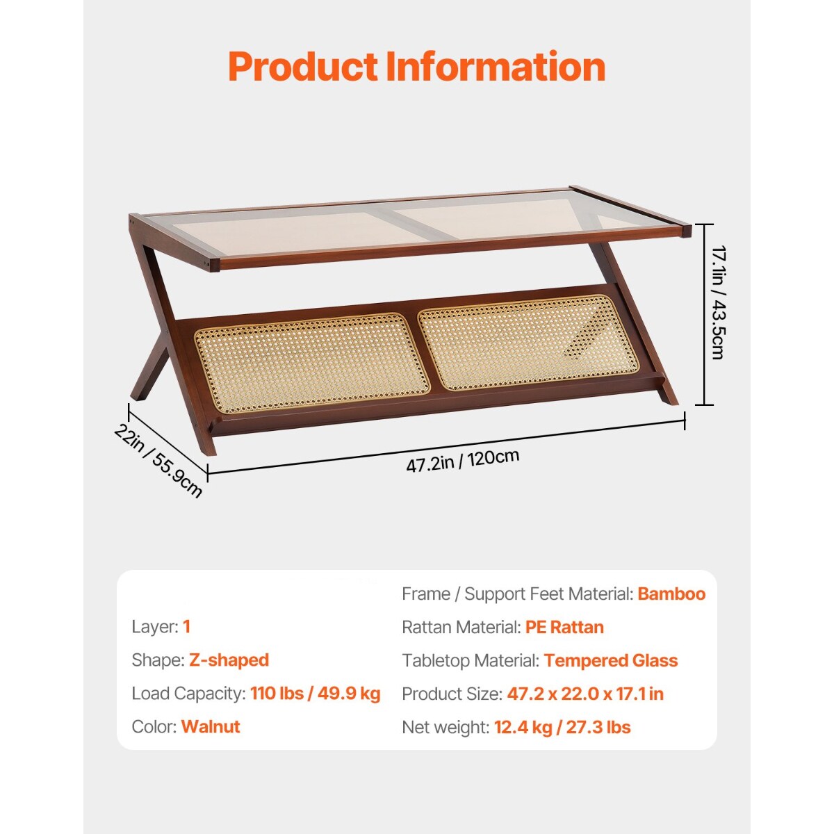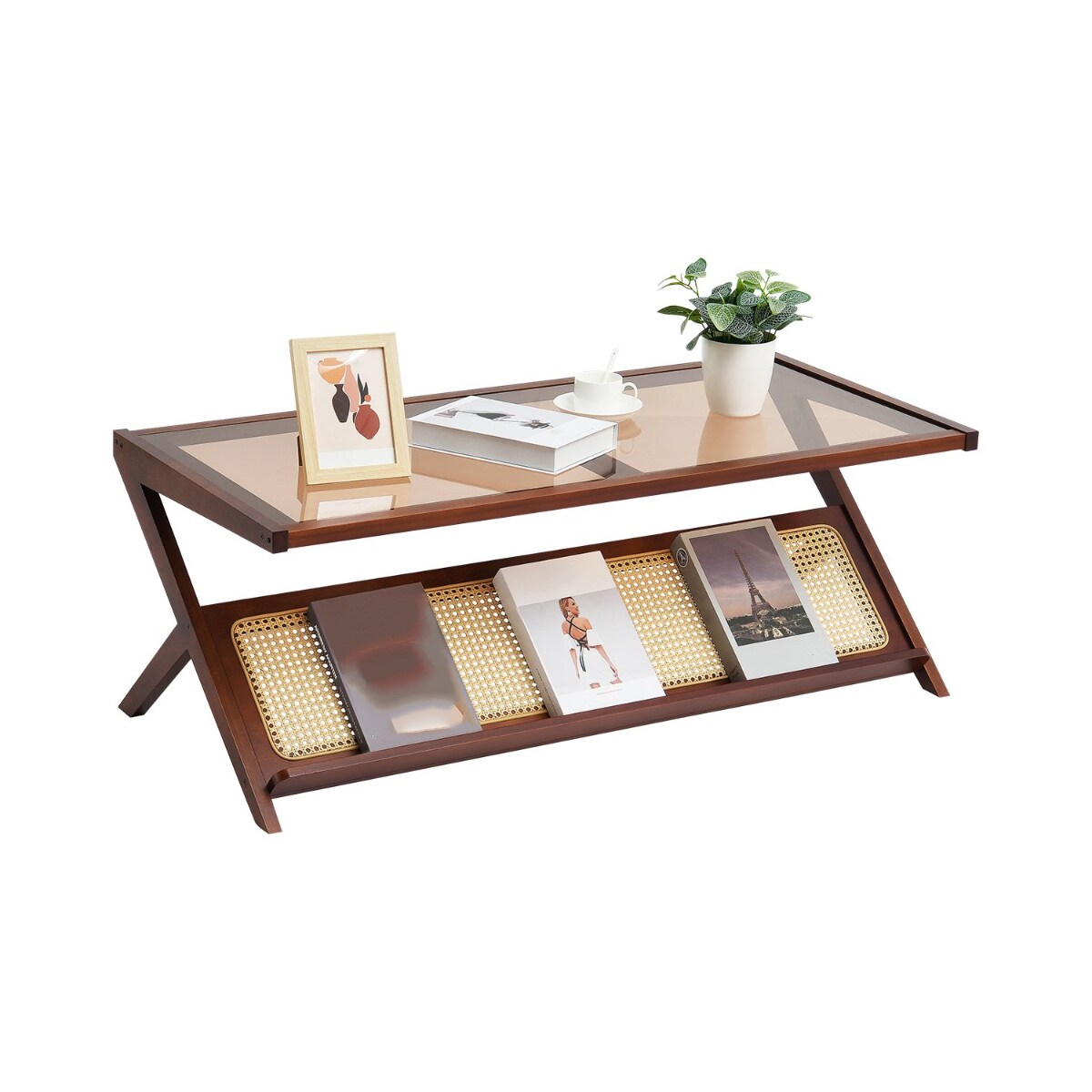 47-Inch Z-Shaped Rattan Woven Coffee End Table with Removable Glass Top Suitable for Any Small Space