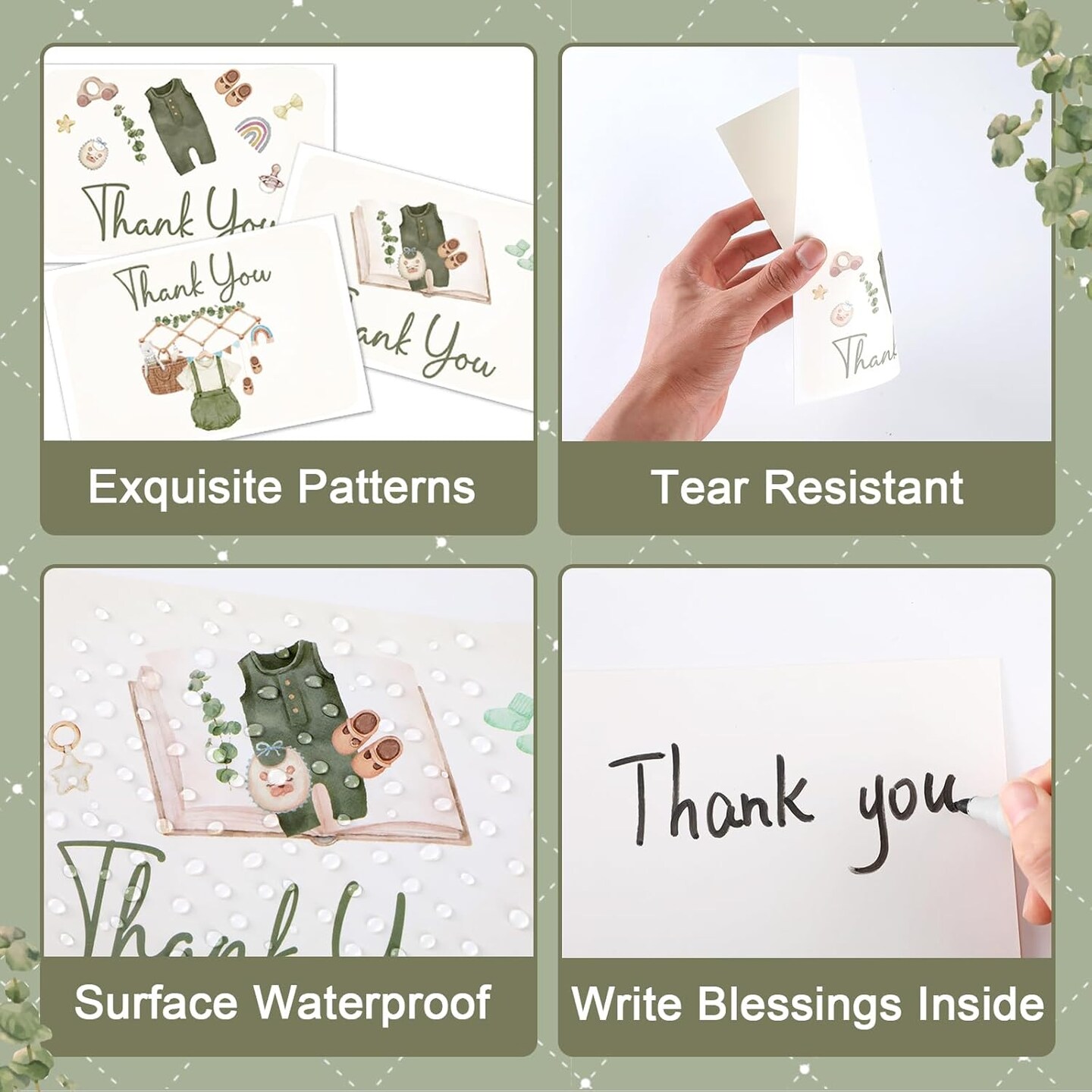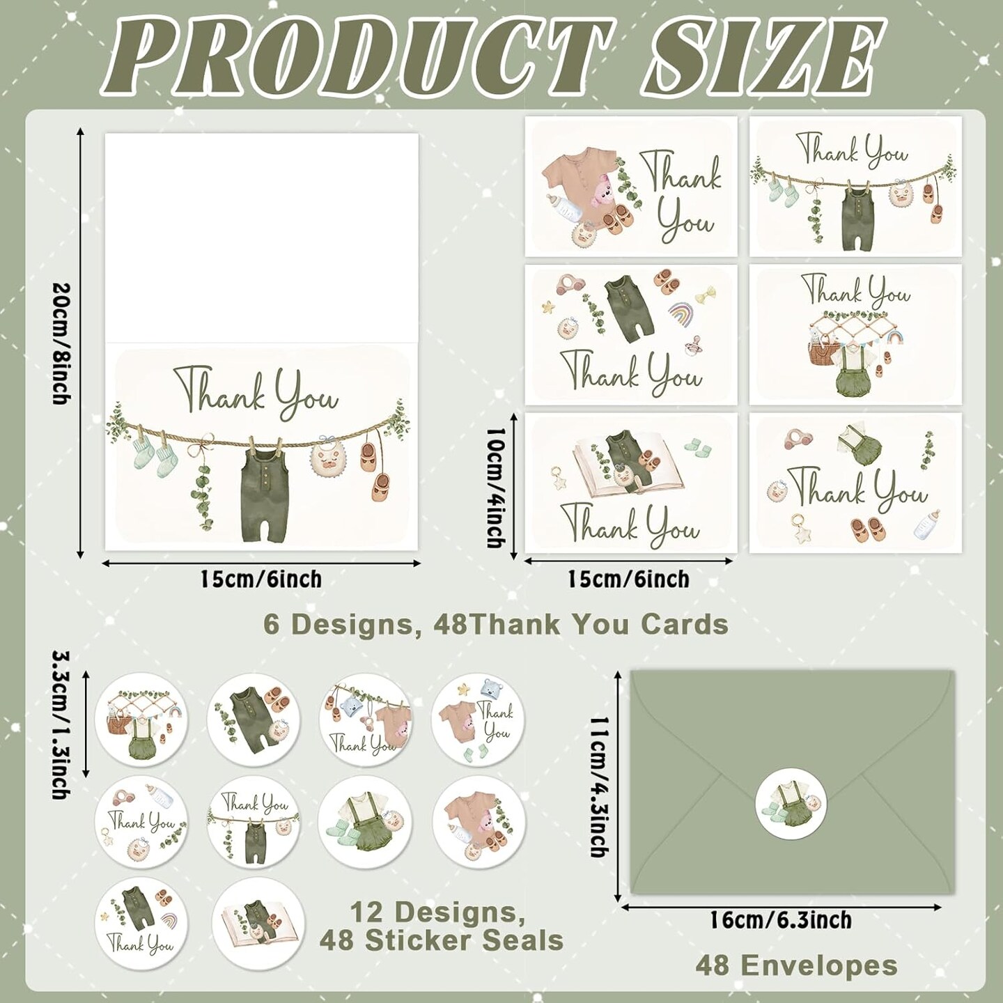 48 Pack Baby Shower Thank You Cards Vintage Green Clothes Note Cards with Envelopes Stickers Sage Green
