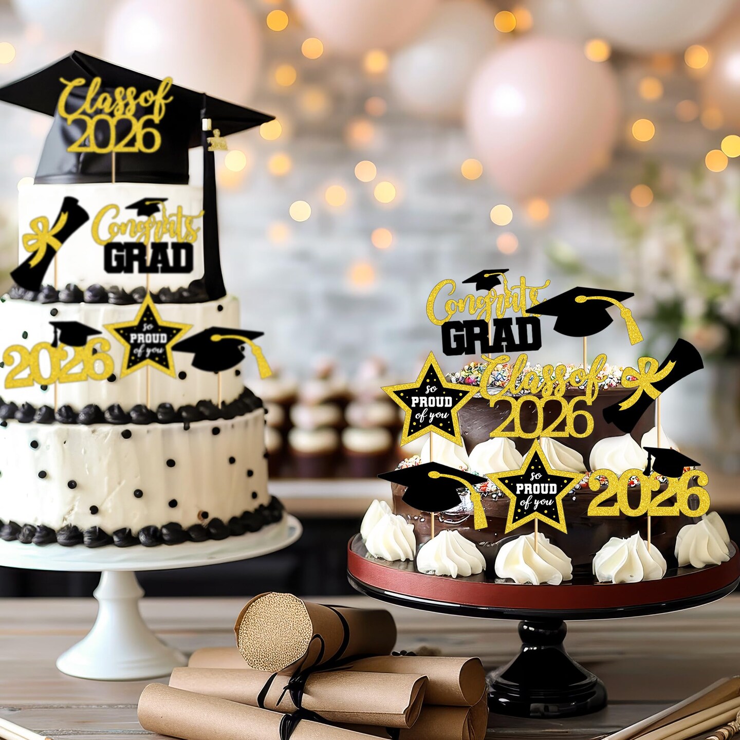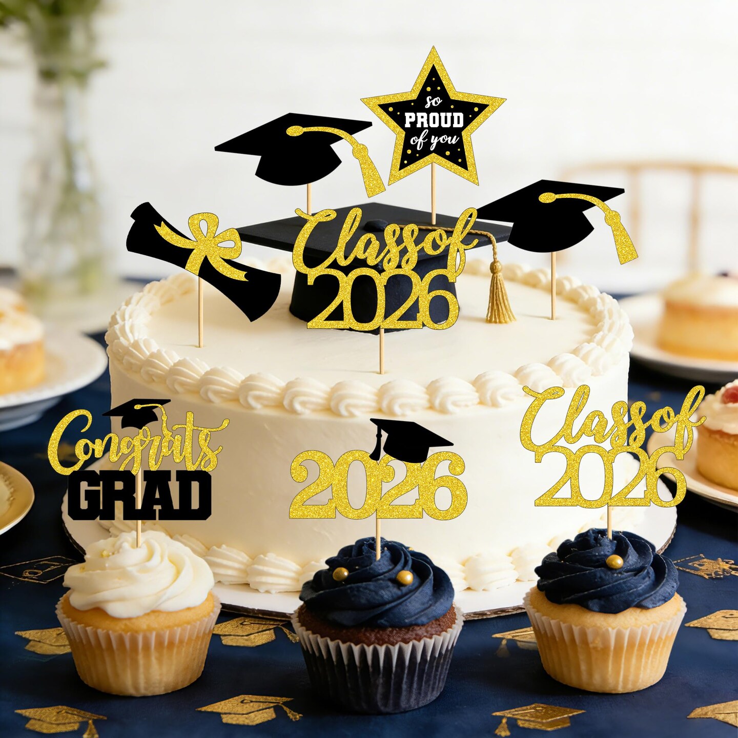 48 PCS Graduation Cupcake Toppers, 6 Styles Congrats Grad Cake Topper, Black and Gold Graduation Decorations 2026, Glittery Cap and Diploma Cake Picks for Grad Party Decor Supplies