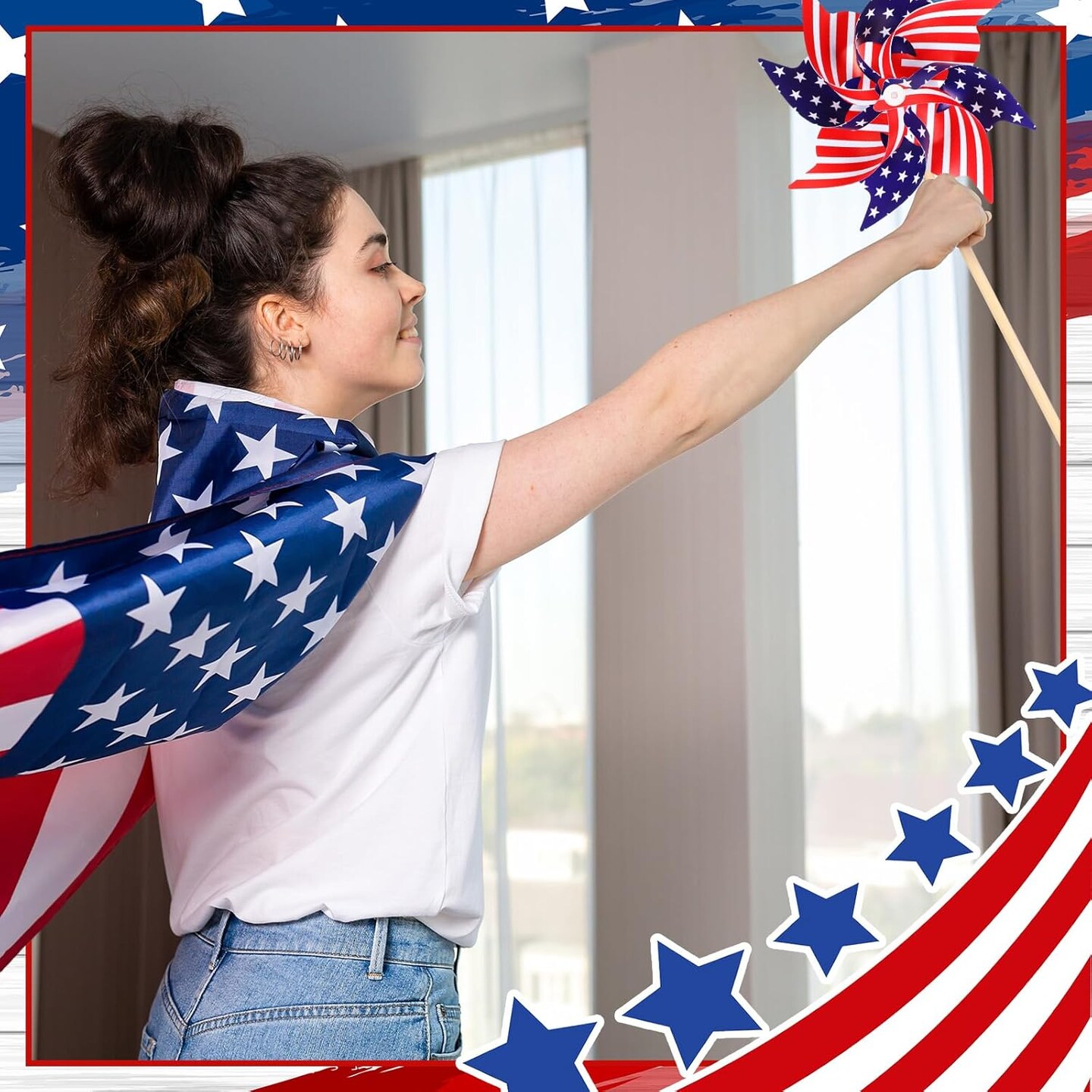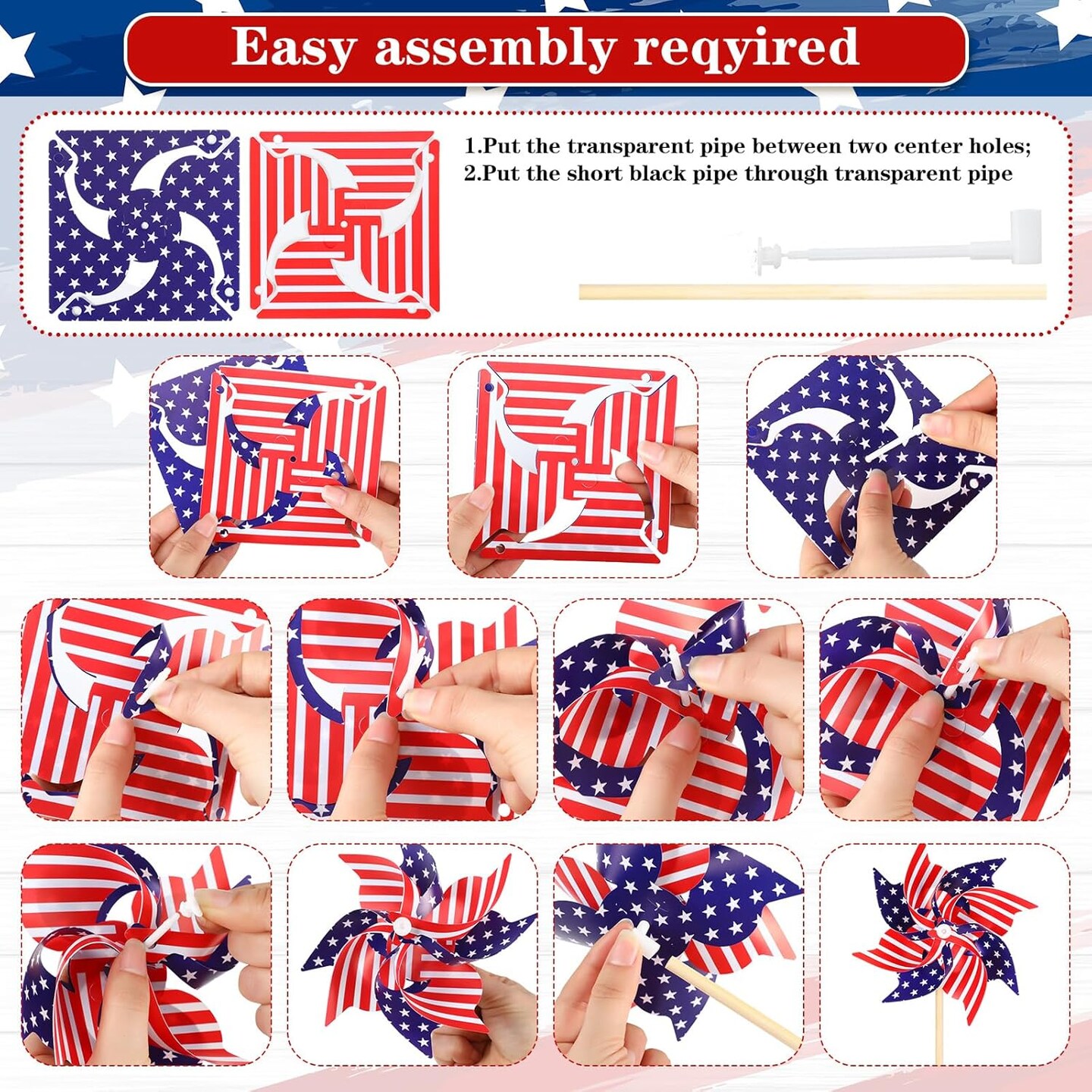 48 Pcs Outdoor 4th of July Decorations Patriotic America Flag and Pinwheel Decoration Memorial Day Wind Spinner with Stake Red White Blue Windmills Flag on Stick