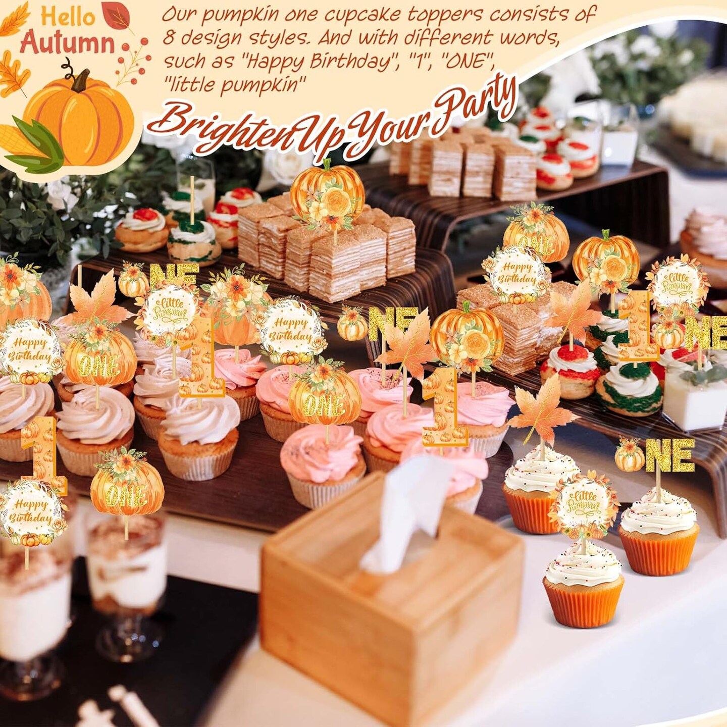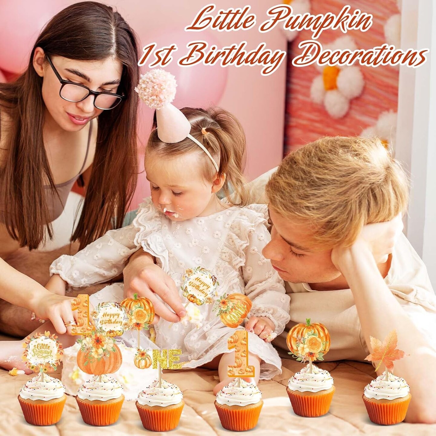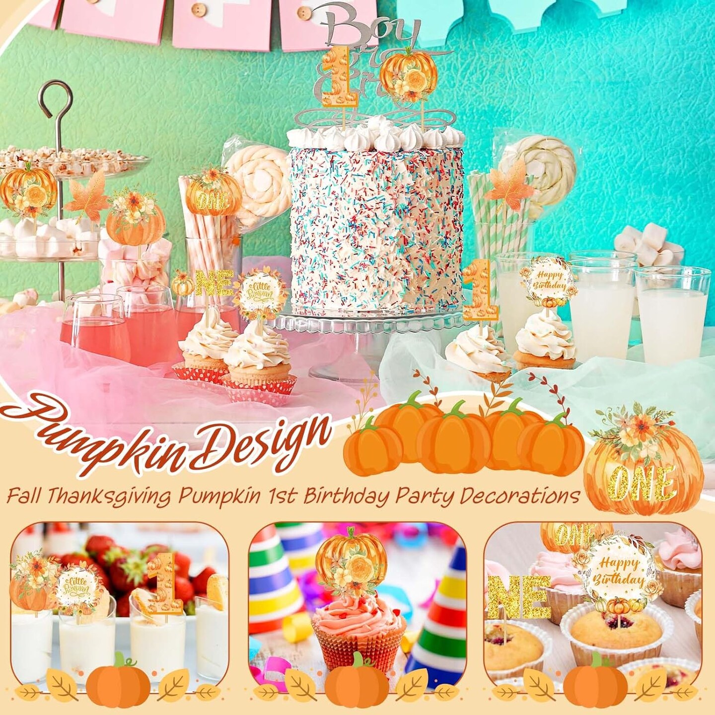 48 Pcs Pumpkin One Cupcake Toppers Pumpkin Baby shower Decorations 1st Birthday Cake 3"W x 0.2"H