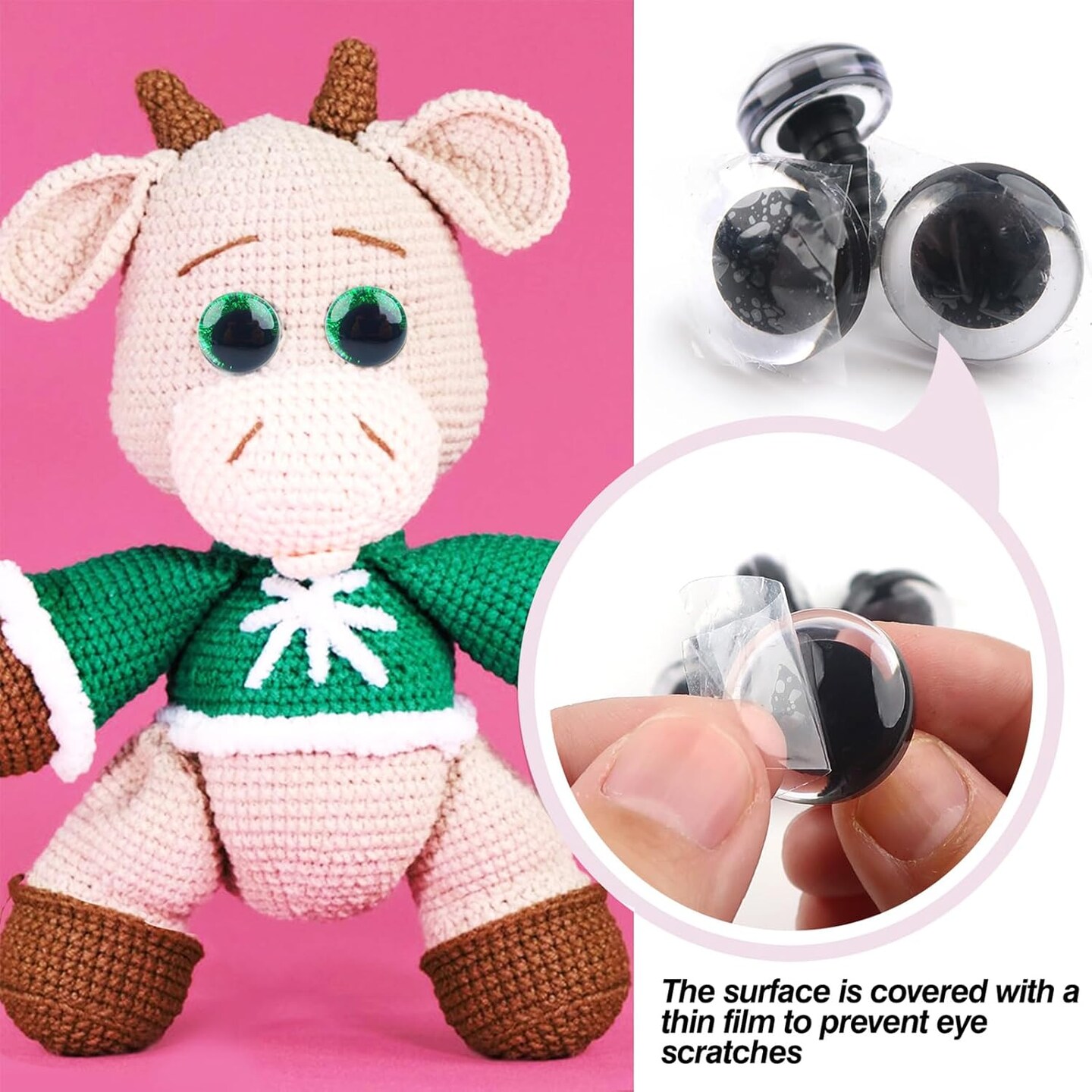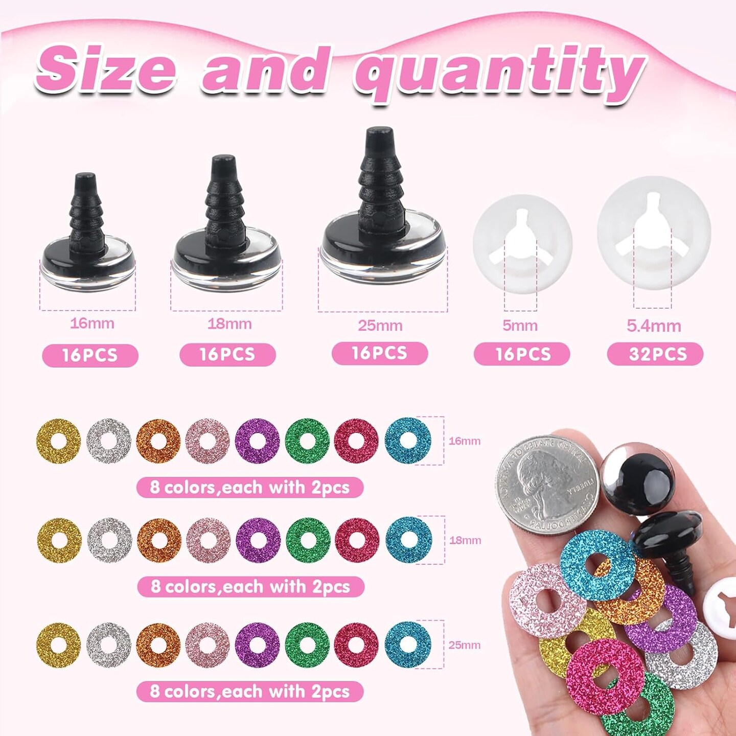 48pcs Glitter Safety Eyes for Amigurumi – 16mm, 18mm, 25mm with Washers, 8 Colors