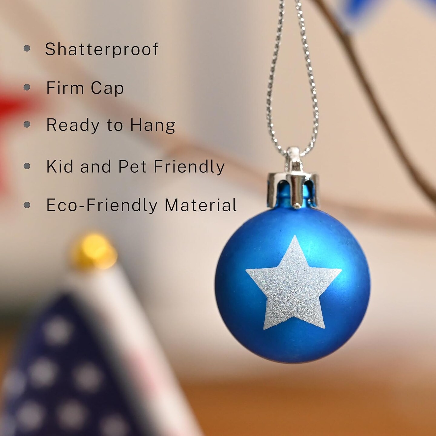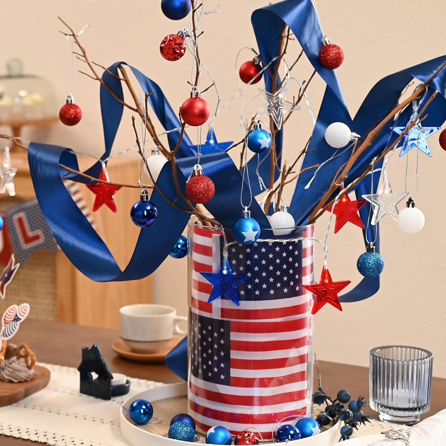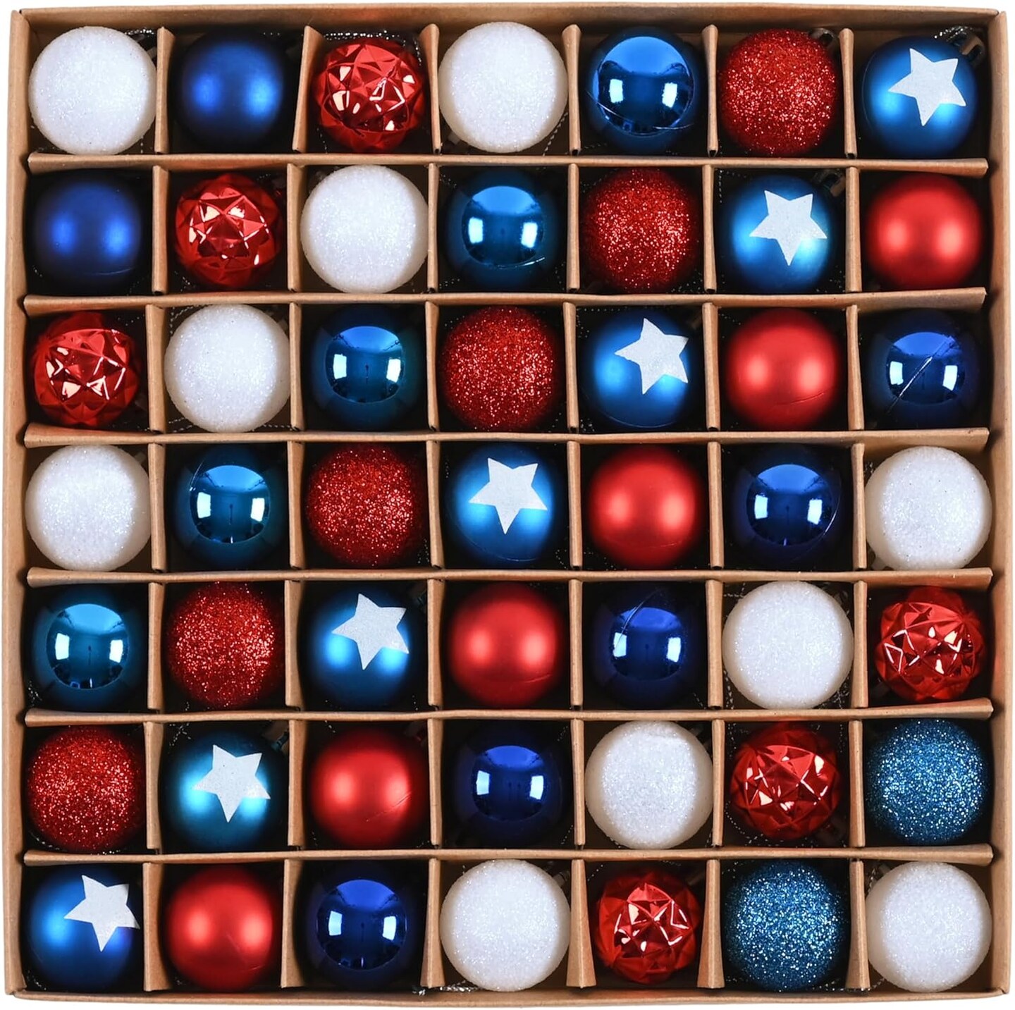 49-count set of 1.18-inch patriotic mini ornaments in red, white, and blue, designed for Independence Day and Memorial Day decorations, featuring durable shatterproof material for hanging on trees or party displays.