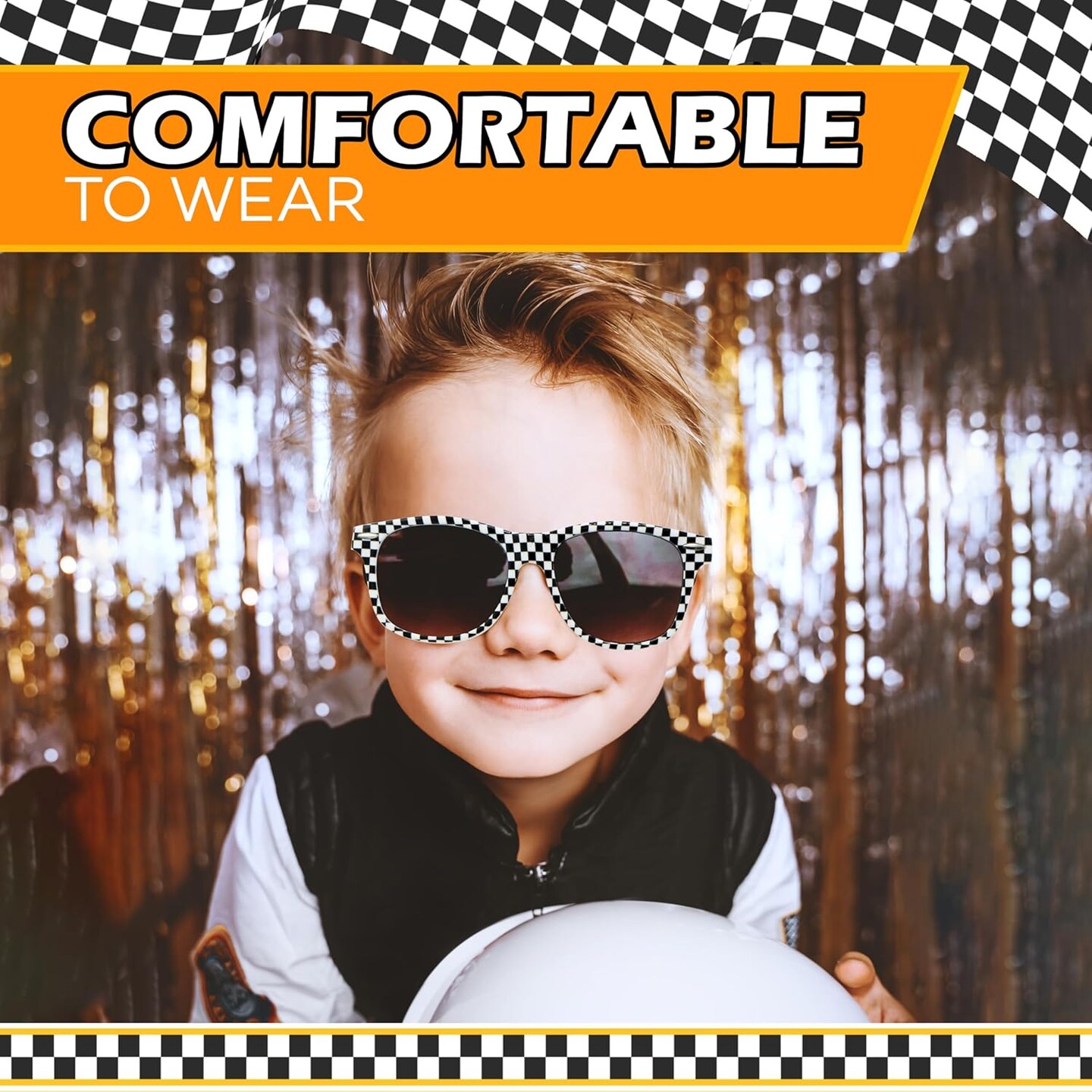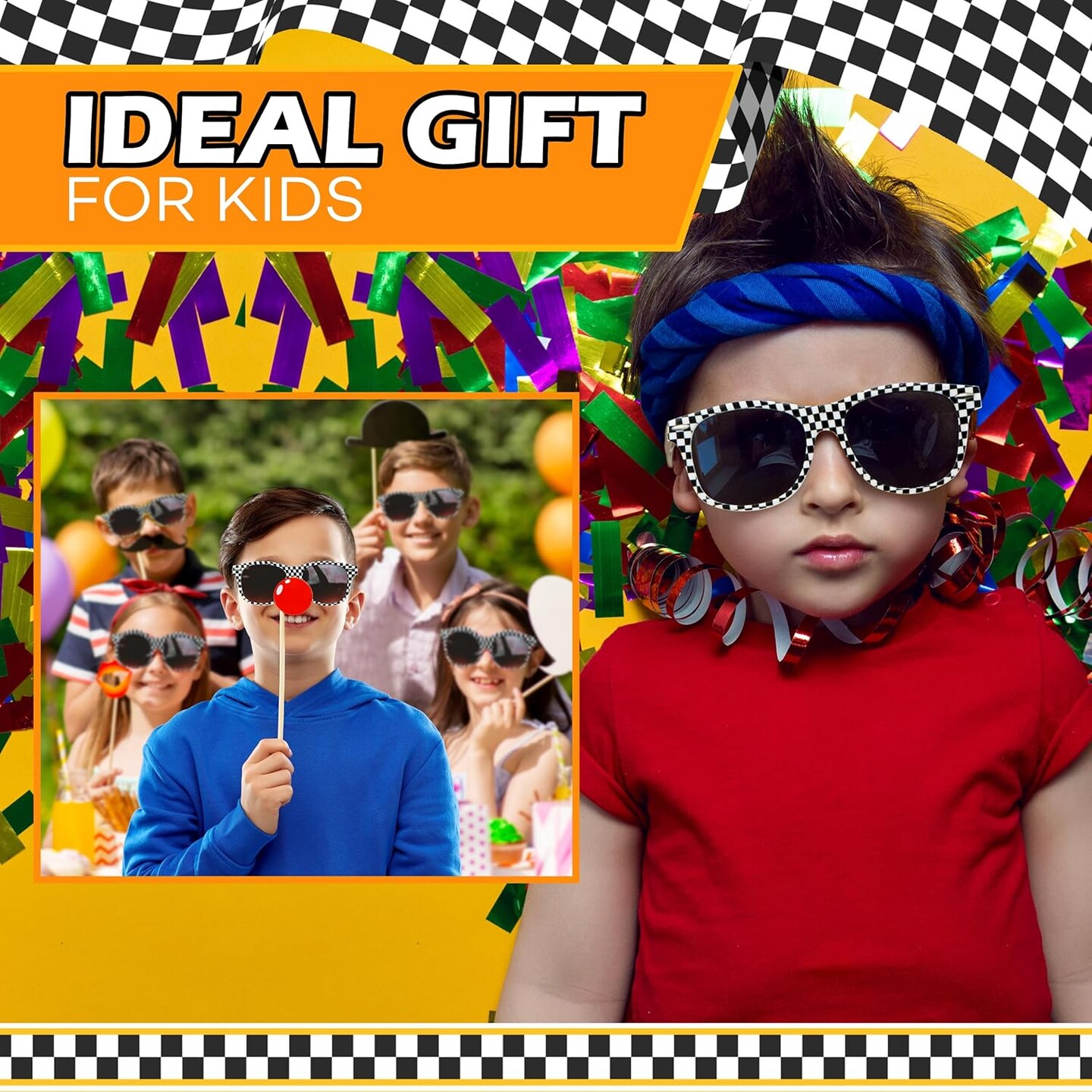 4E's Novelty 12 Pack Kids Race Car Checkered Sunglasses Bulk with UV400 Protection - Ideal for Race Car Theme Birthday Decor