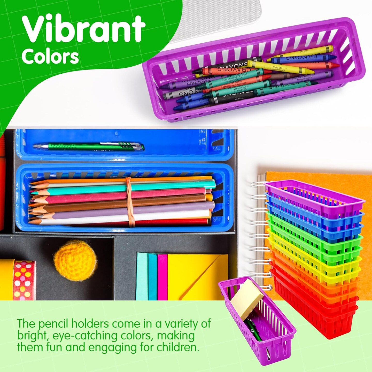 4E's Novelty 12 Pack Pencil Holder for Kids Desk, Colorful Plastic Pen Baskets Tray for Organizing Classroom Supplies, Plastic Caddy for Desk and Elementary Teacher Supplies for Classroom
