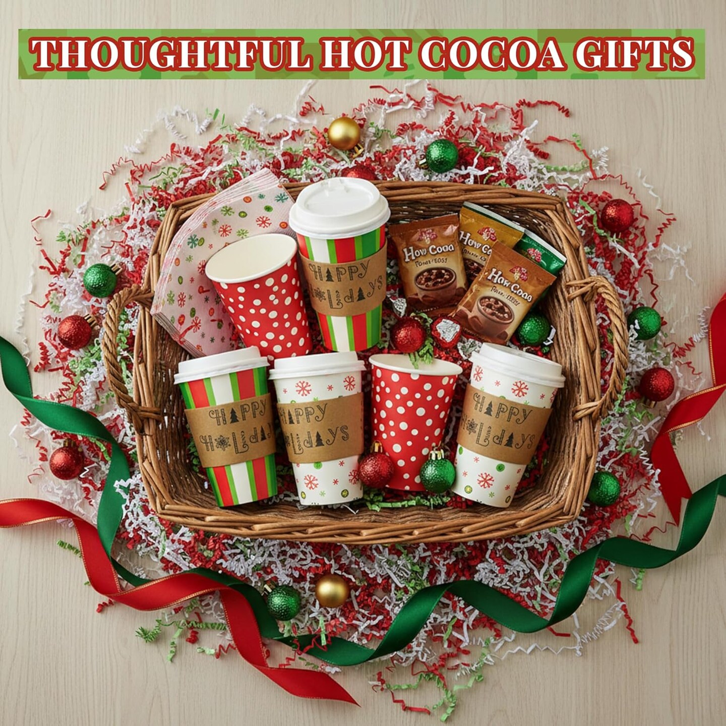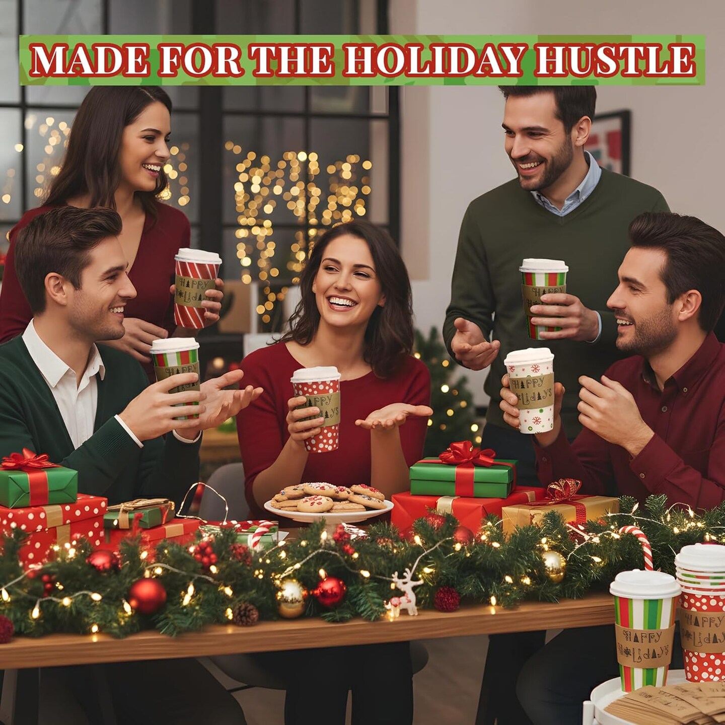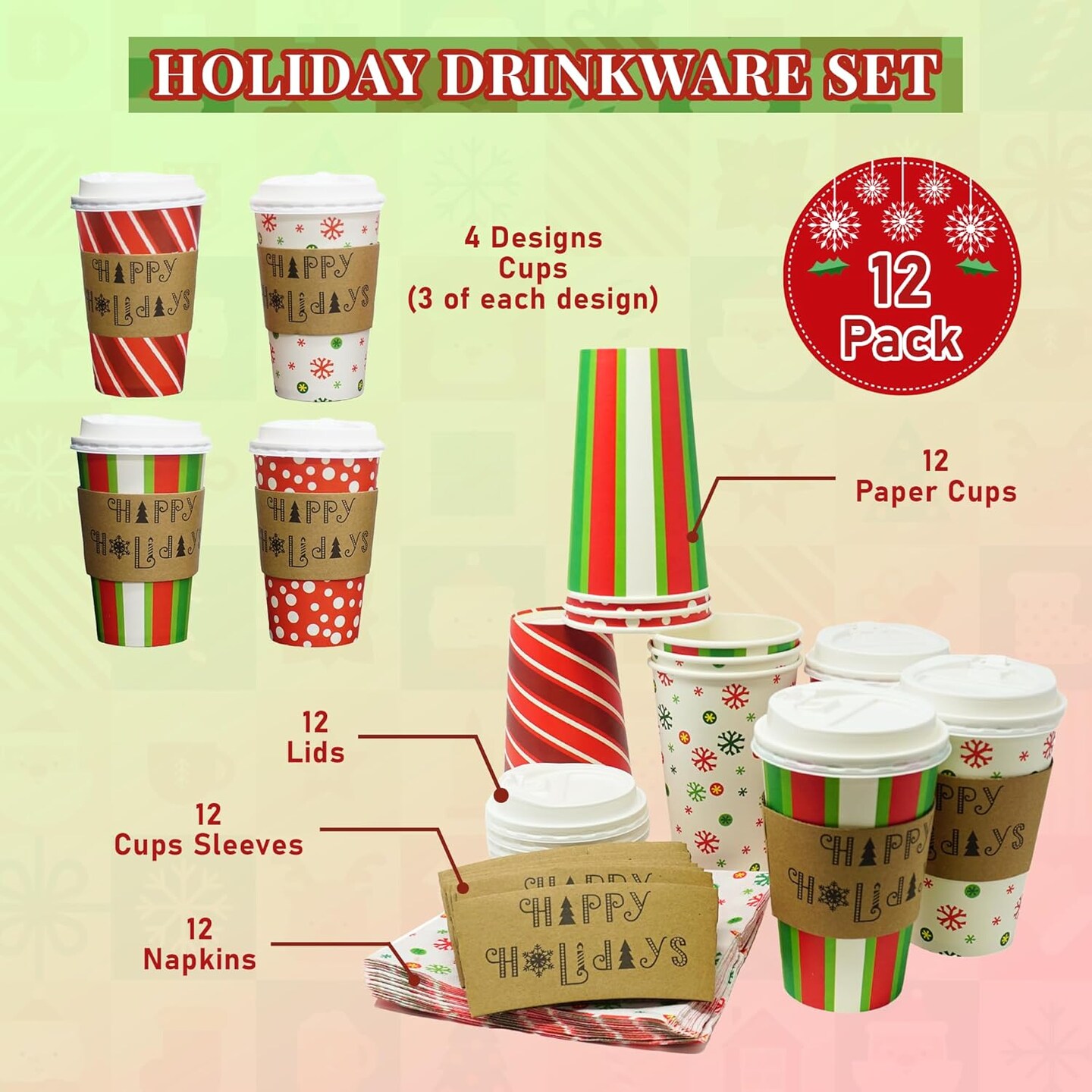 4E's Novelty 12-Pack Christmas Paper Cups with Lids, Sleeves & Napkins, 16 oz Holiday Drink Set