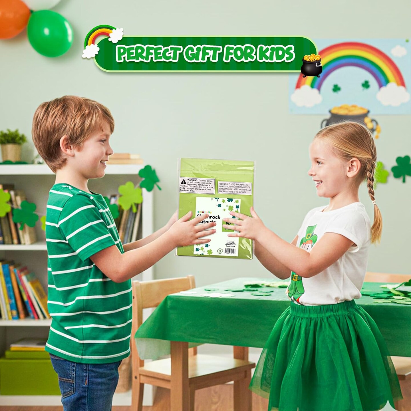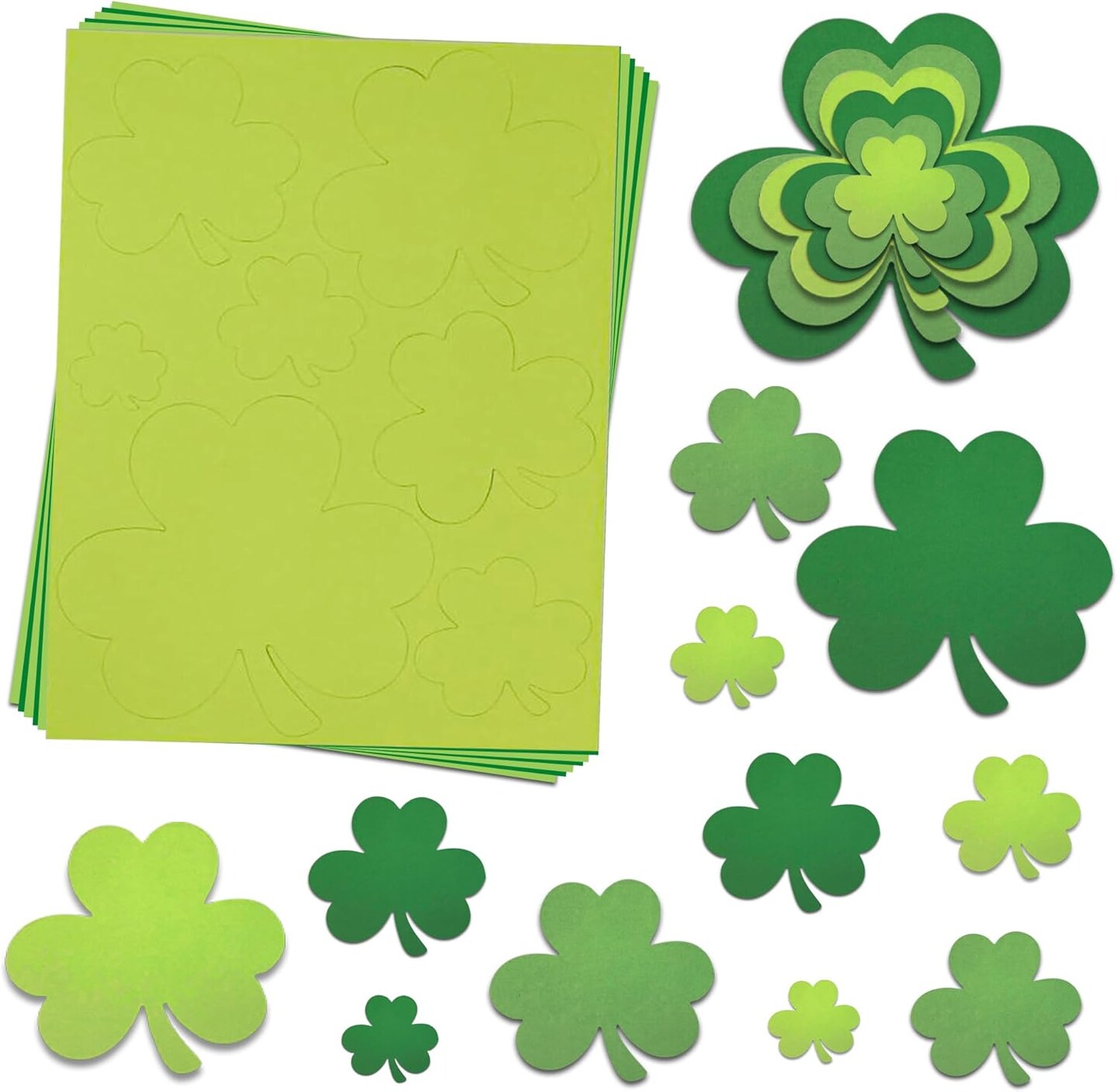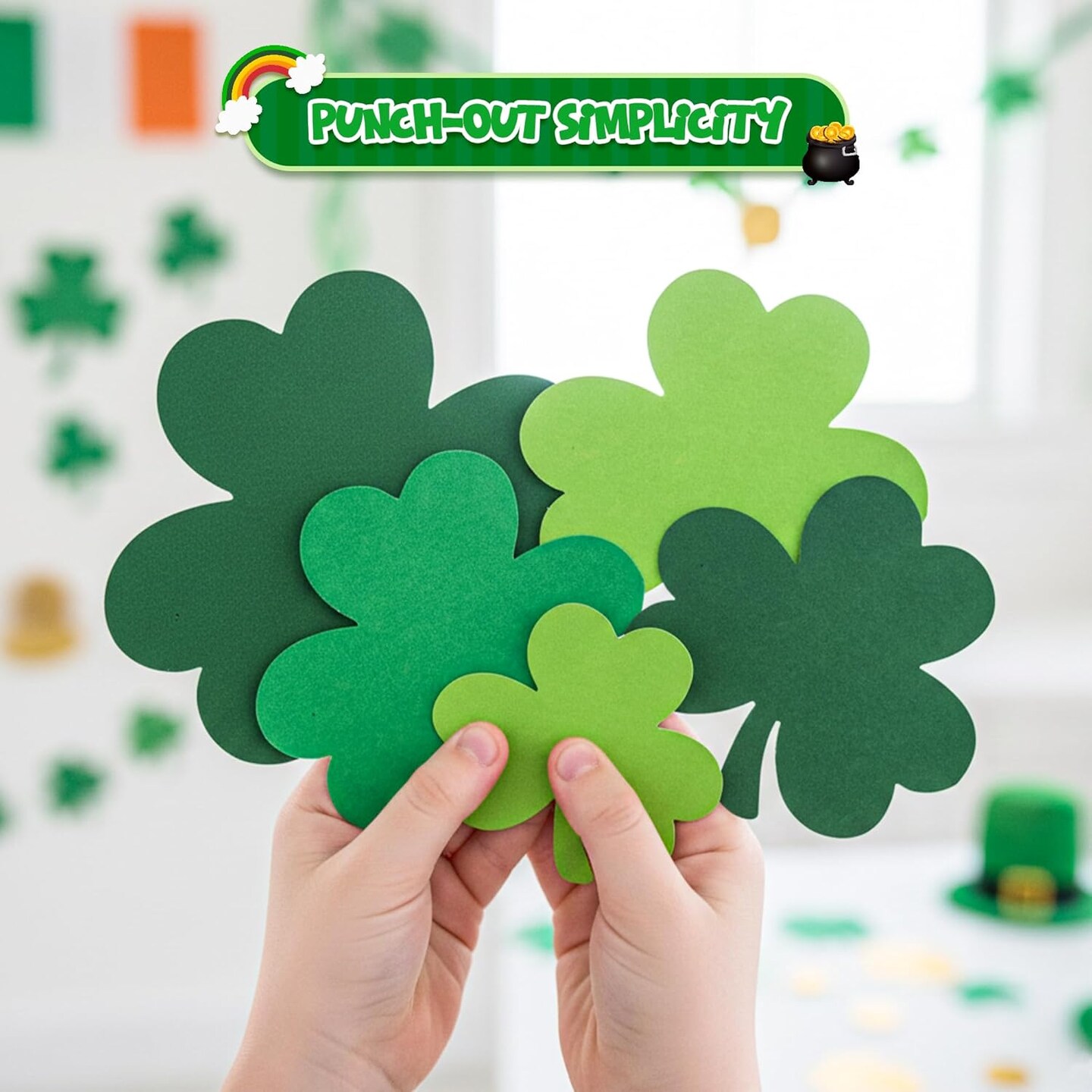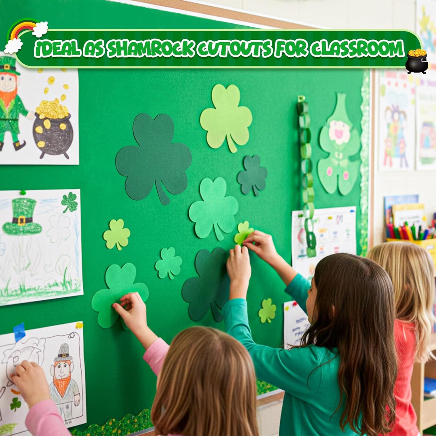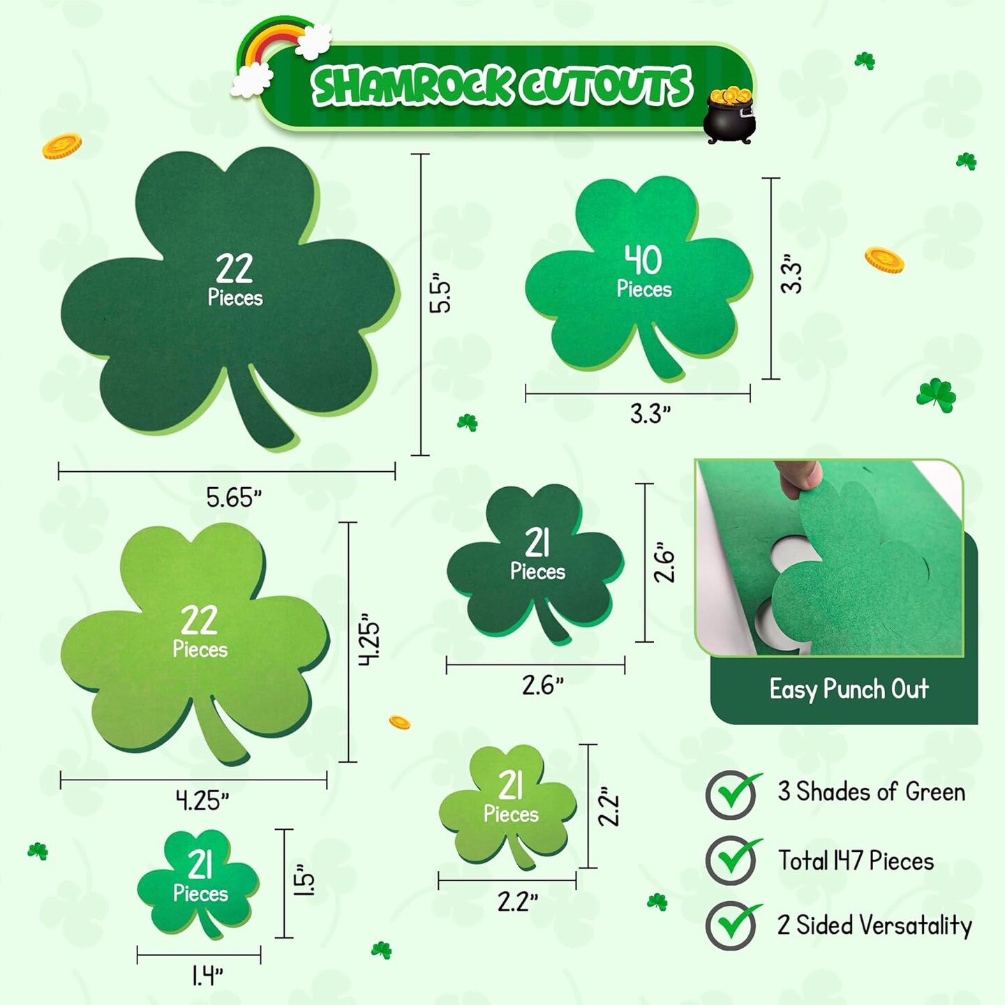 4E's Novelty 147 Pcs St. Patrick's Day Shamrock Cutouts Bulk - 7 Sizes in 3 Green Shades, Paper Shamrocks on 21 Sheets, Fun Shamrock Cutouts for Classroom Bulletin Boards, Party Crafts & Decorations