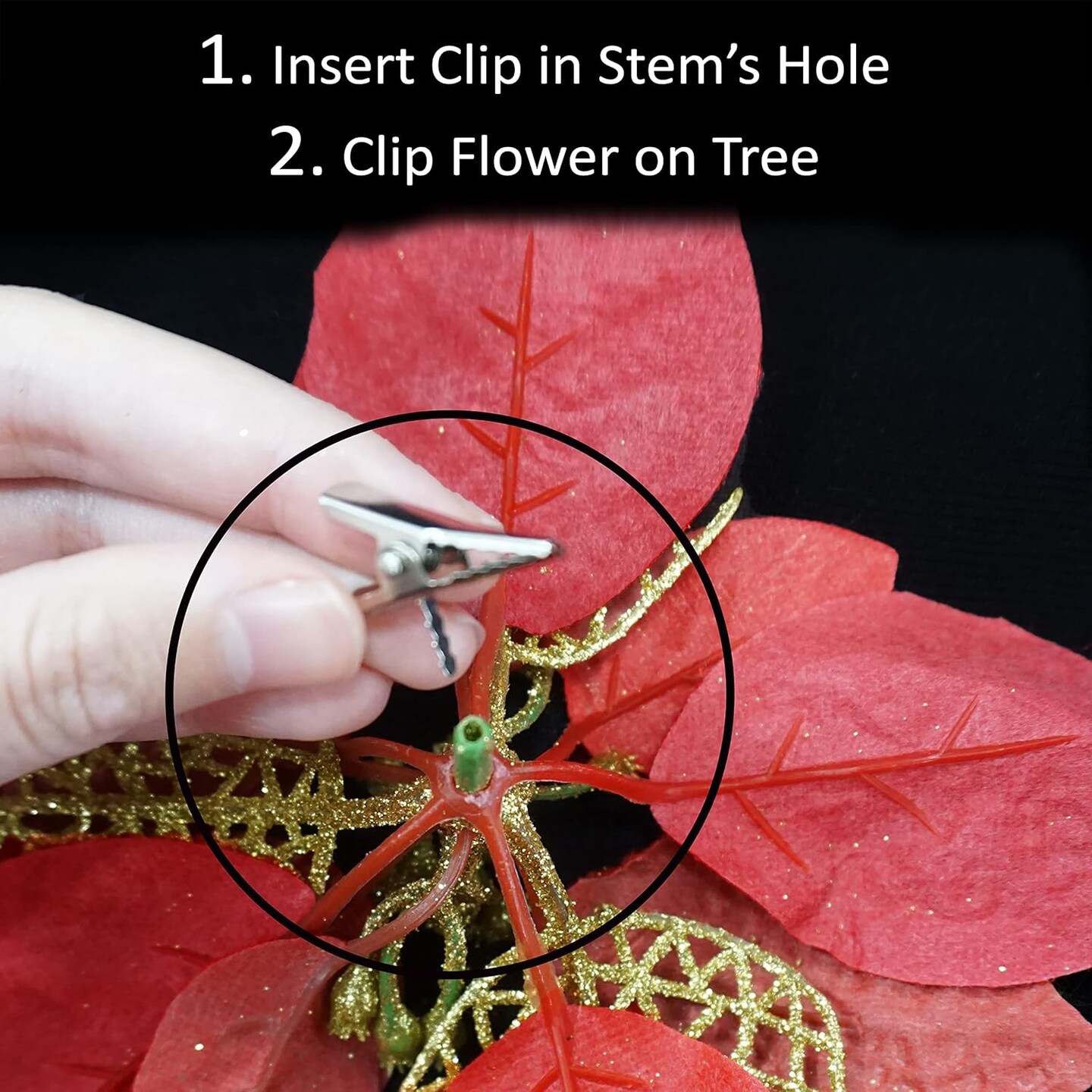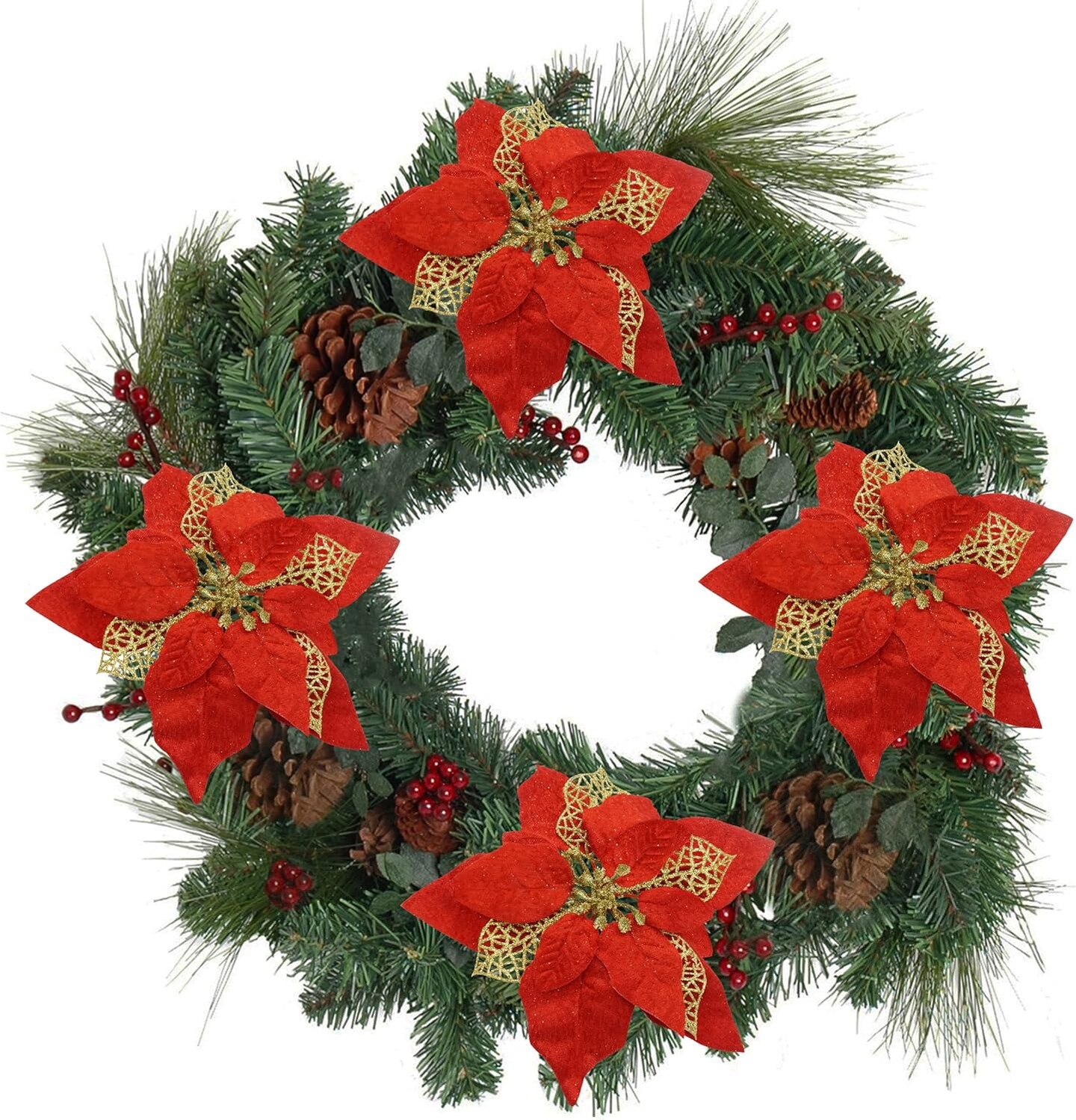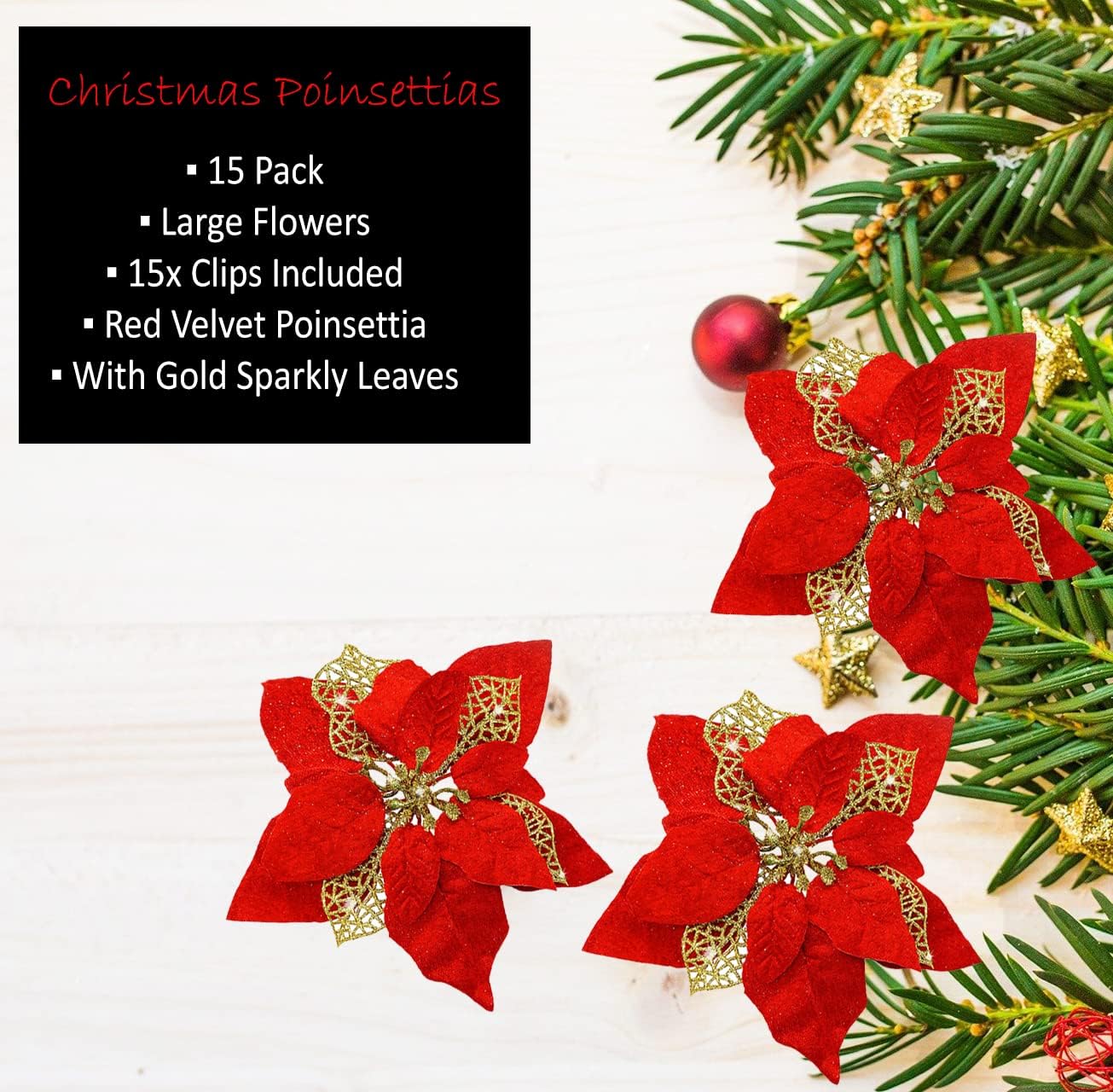 4E's Novelty 15 Pcs Red Velvet Poinsettia Christmas Decorations with Clips, 8.5" Artificial Poinsettia Flowers for Christmas Tree Ornaments, Wreaths, Garlands & Holiday Décor