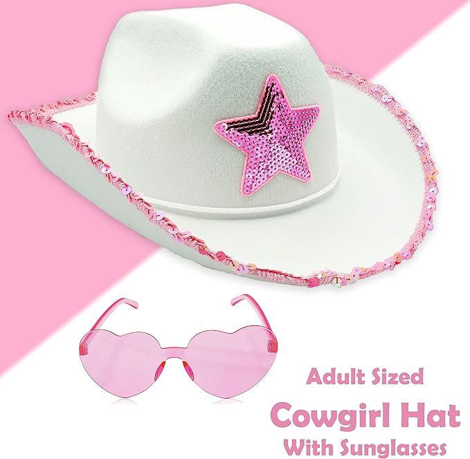 4E's Novelty 2 Sets White Cowgirl Hat with Pink Star, Brim Sequins and Light Pink Heart Sunglasses - Sparkly Cowgirl Hat Perfect Cowgirl Costume for Girls