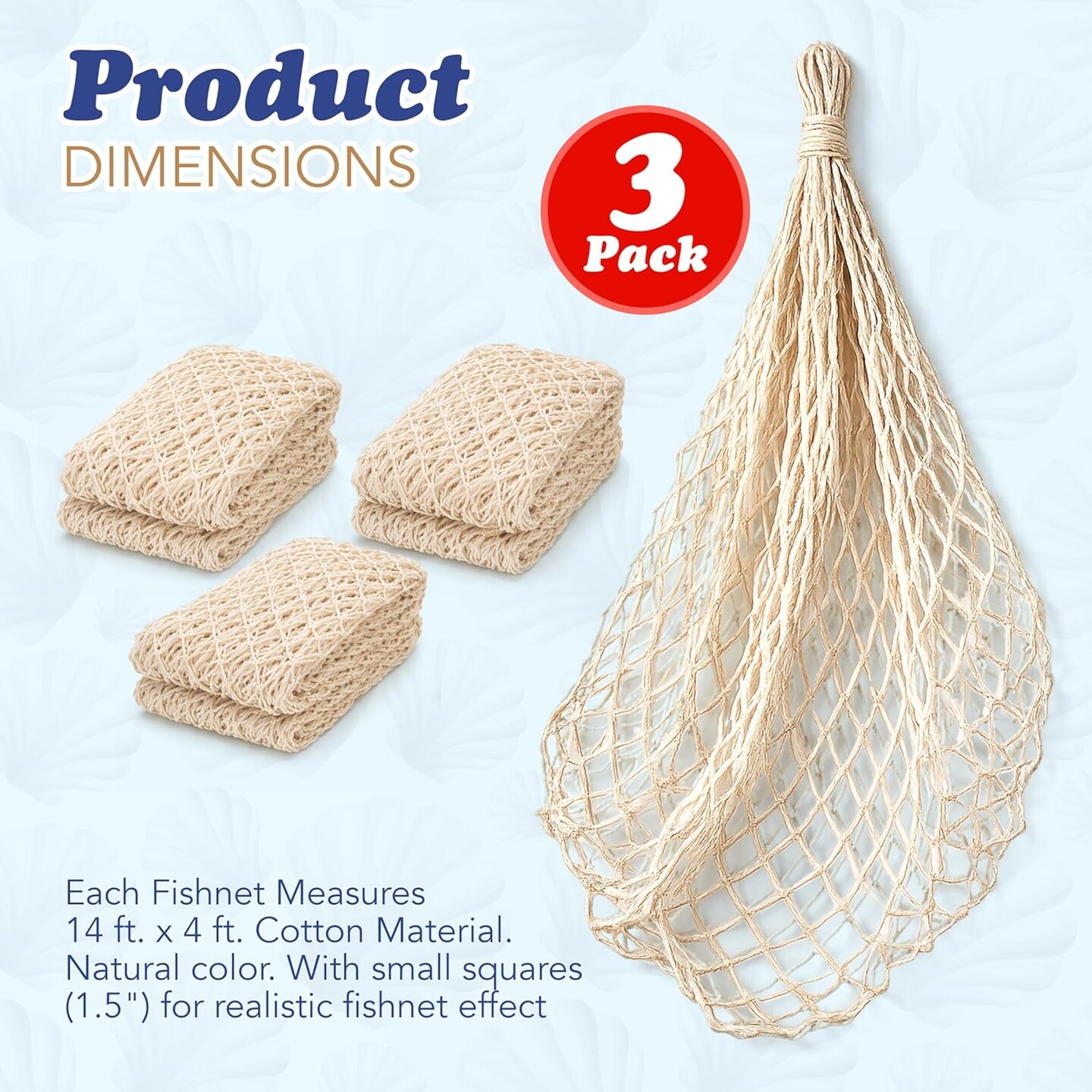 4E's Novelty 3 Pack Fish Net Decorations - Natural Cotton 14ft x 4ft Beach Themed Party Decor