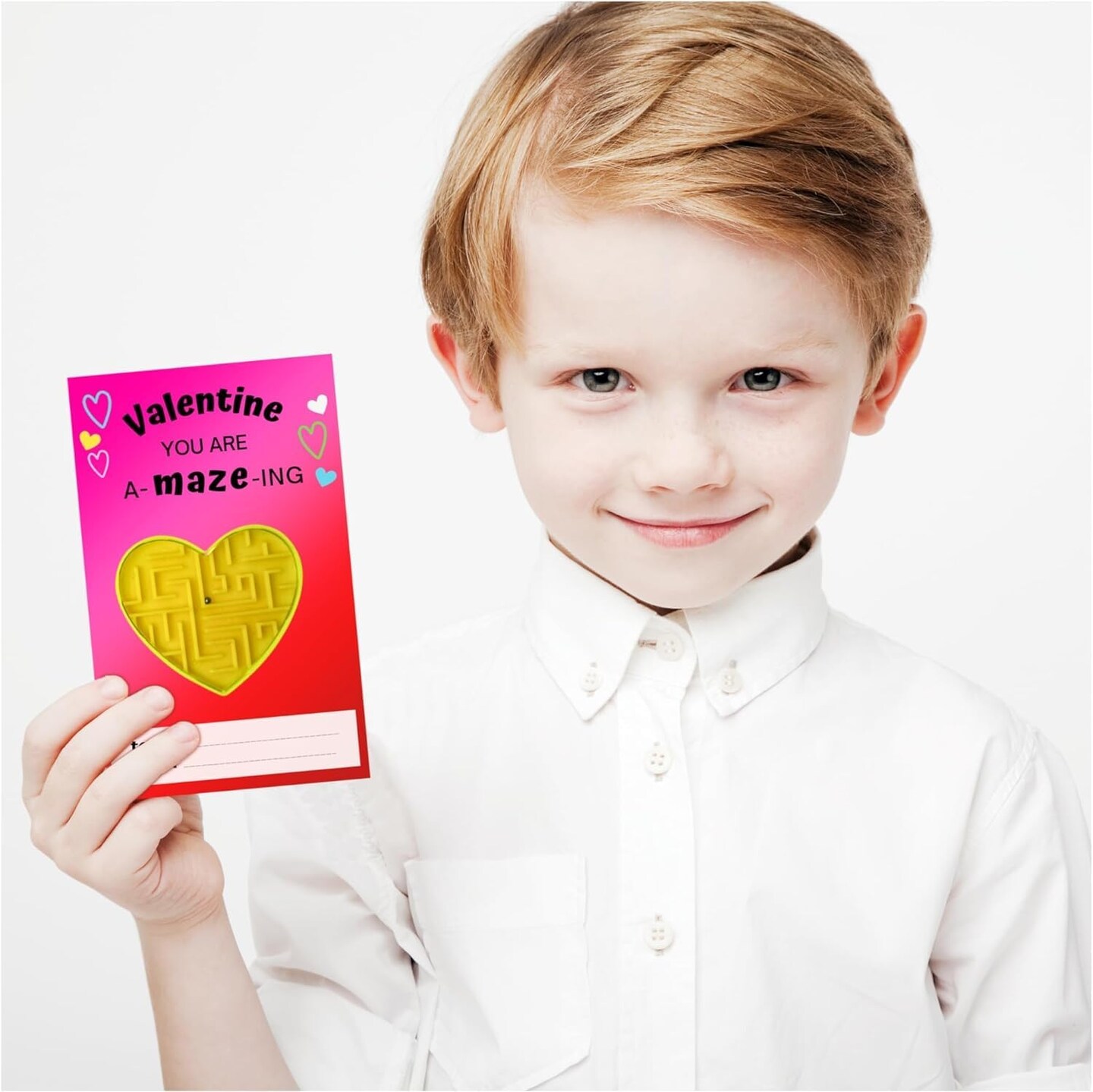 4E's Novelty 36 Pack Valentines Day Maze Cards for Kids Classroom Exchange, Heart Shaped Mini Maze Toys with Valentine Cards, Candy Alternative Party Favors for Boys Girls