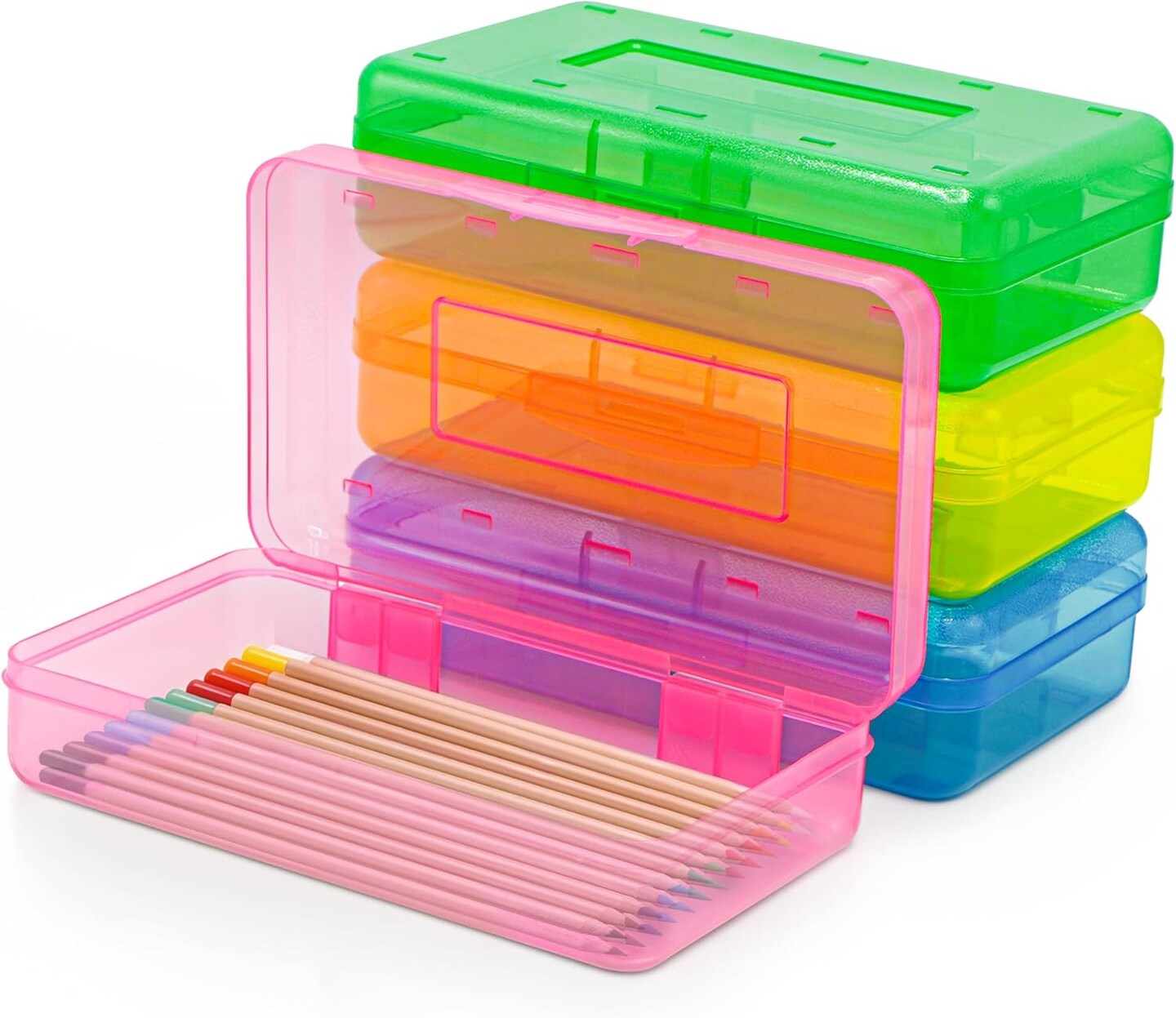 4E's Novelty 4 Pack Large Pencil Case Boxes, Pencil Boxes Bulk Classroom, Accessories Boxes for Classroom, Kids Clear Colored Pencil Case with Snap Tight Lid, School Accessories Box for Daily Use