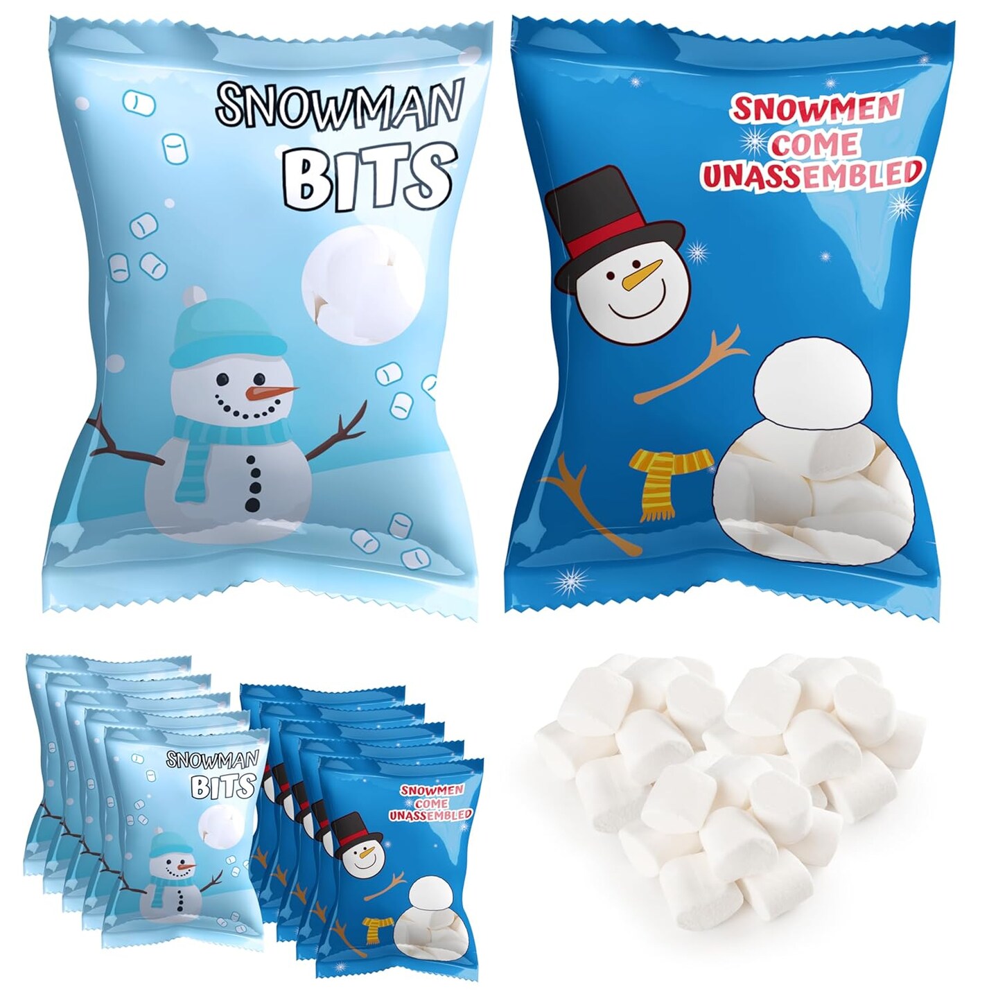 4E's Novelty 50 Packets Mini Marshmallows – 2 Festive Snowman Designs, Individually Wrapped Vanilla Mini Marshmallows Bulk Pack for Hot Cocoa, Christmas Treats, Stocking Stuffers & Party Favors