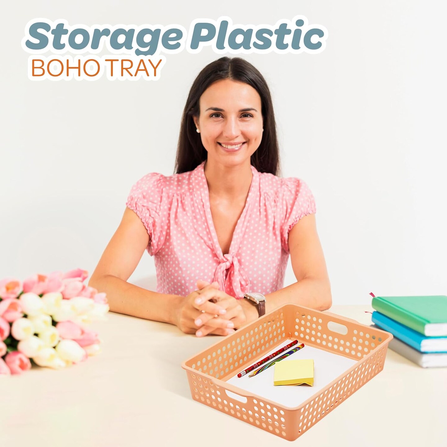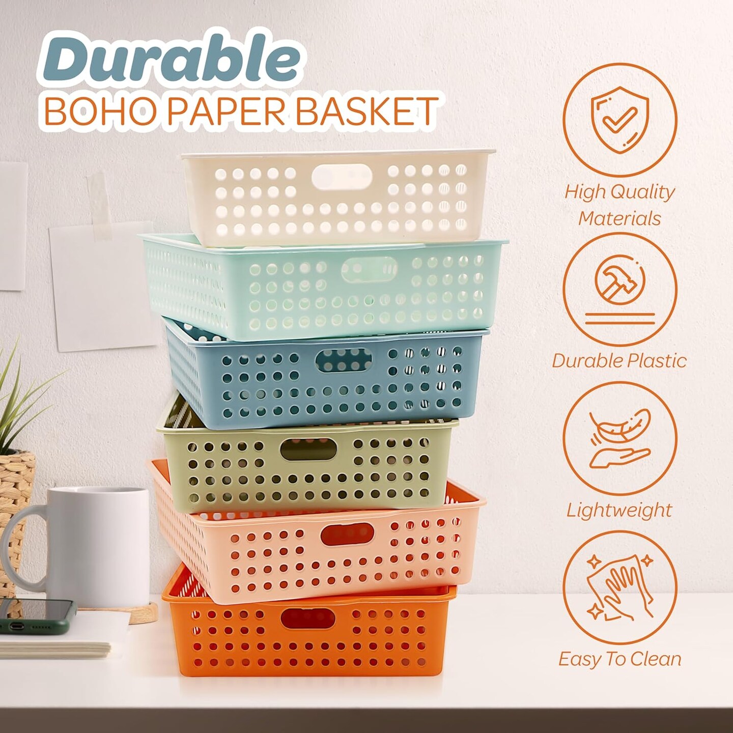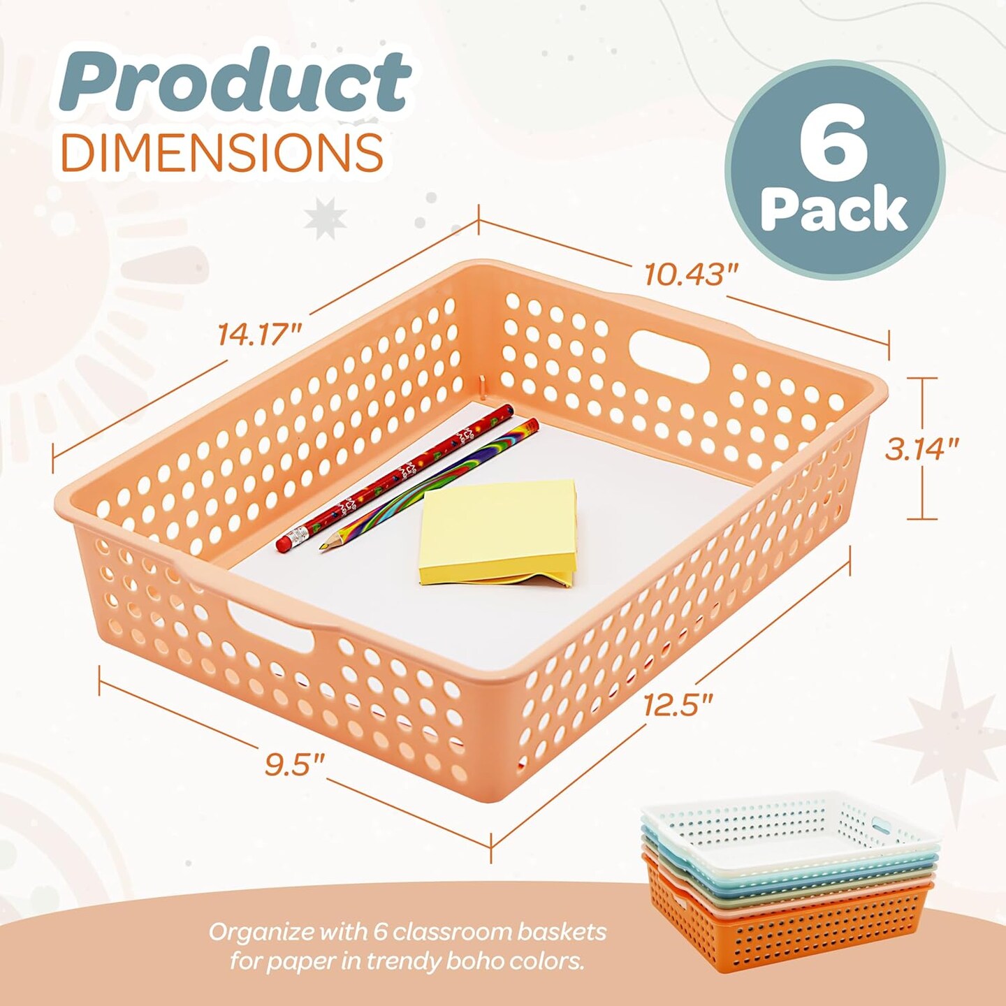 4E's Novelty 6 Pack Classroom Paper Baskets, Organizing Desk Boho Tray for A4 Papers, Classroom Plastic Paper Bins, Fun Turn In Trays for Teachers and Students, Teacher Room Trays for Ages 3+